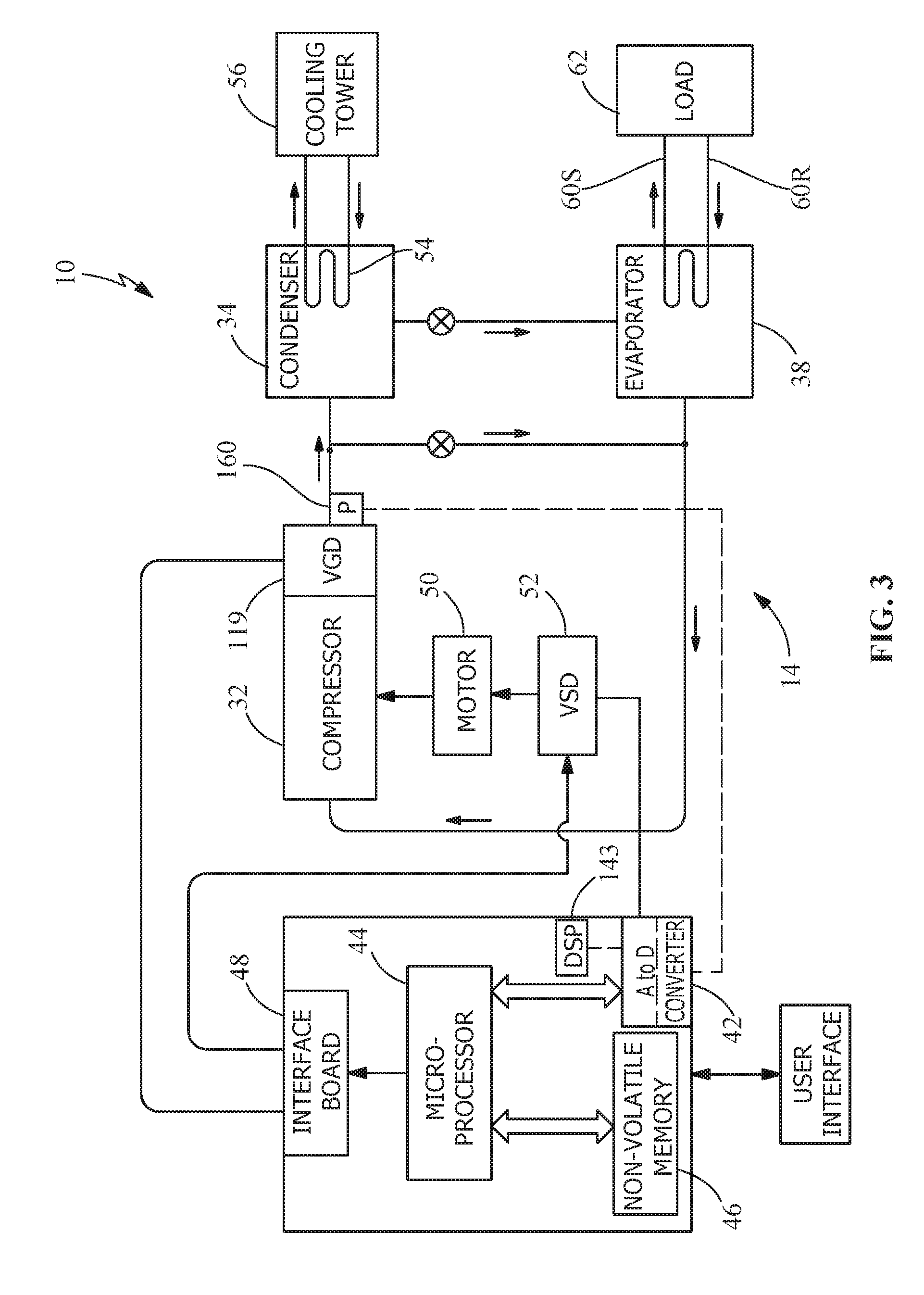 Compressor 32 compresses a refrigerant vapor and delivers the vapor to condenser 34 through a discharge passage. In one exemplary embodiment, compressor 32 can be a centrifugal compressor having one or more compression stages. The refrigerant vapor delivered by compressor 32 to condenser 34 transfers heat to a fluid, for example, water or air. The refrigerant vapor condenses to a refrigerant liquid in condenser 34 as a result of the heat transfer with the fluid. The liquid refrigerant from condenser 34 flows through expansion device 36 to evaporator 38. A hot gas bypass valve (HGBV) 134 may be connected in a separate line extending from compressor discharge to compressor suction. In the exemplary embodiment shown in FIG. 3, condenser 34 is water cooled and includes a tube bundle 54 connected to a cooling tower 56.