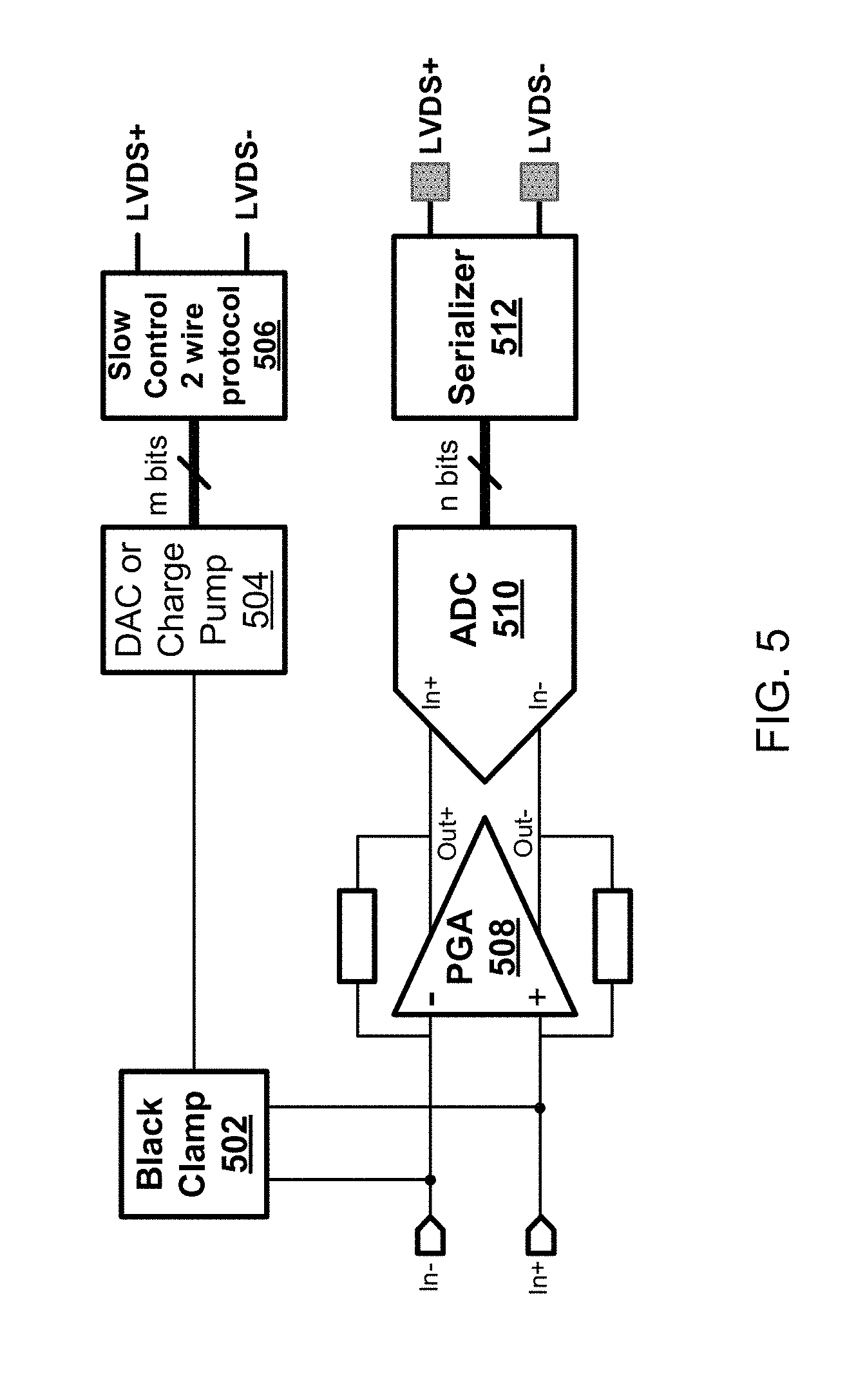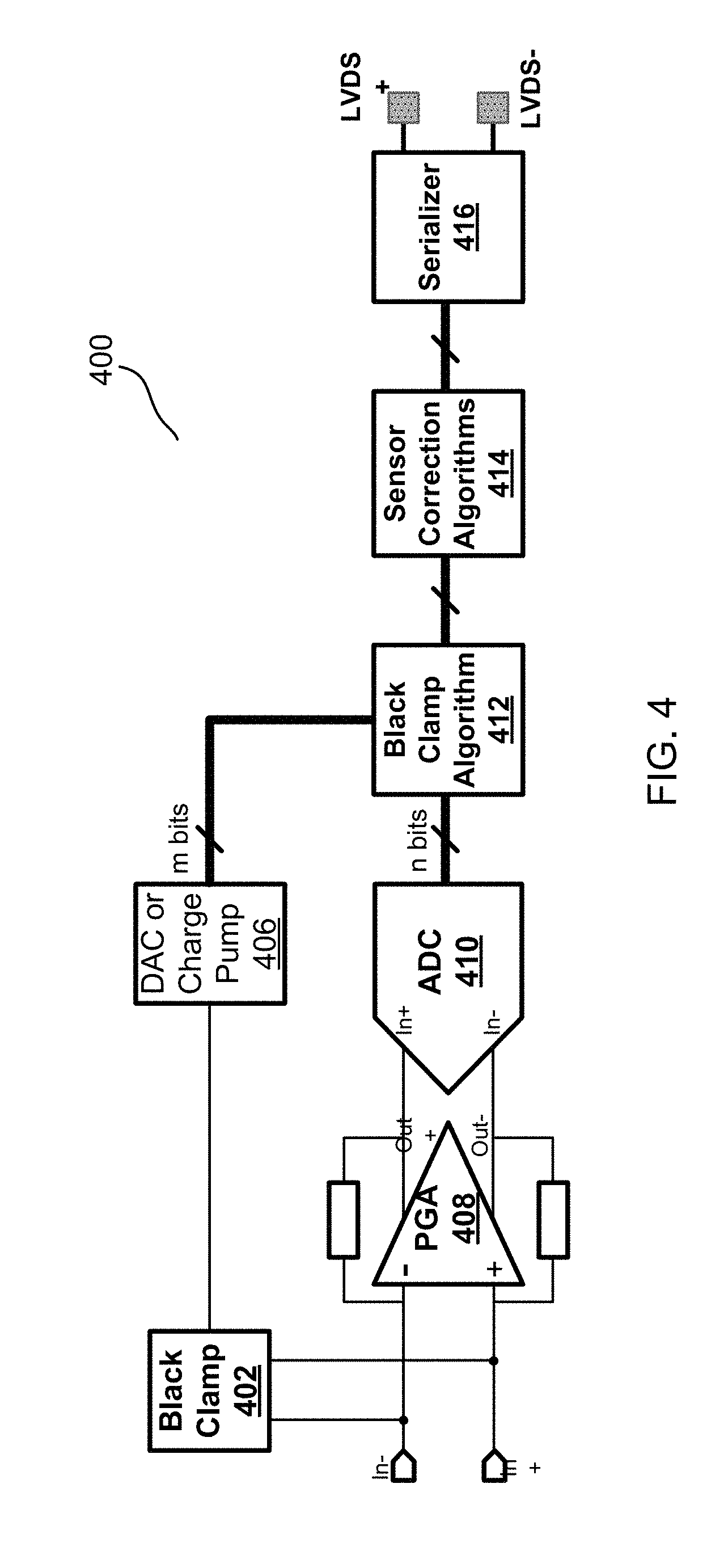 The adjustment of the black clamp level may be done by means of controlling a DC voltage (Vblackclamp) using a DAC or charge pump on the sensor. Pixel voltage offsets entering the ADC move around due to dark current in the photodiode e.g., therefore the DAC needs to be regularly adjusted by assessing the black offset in the digital domain.