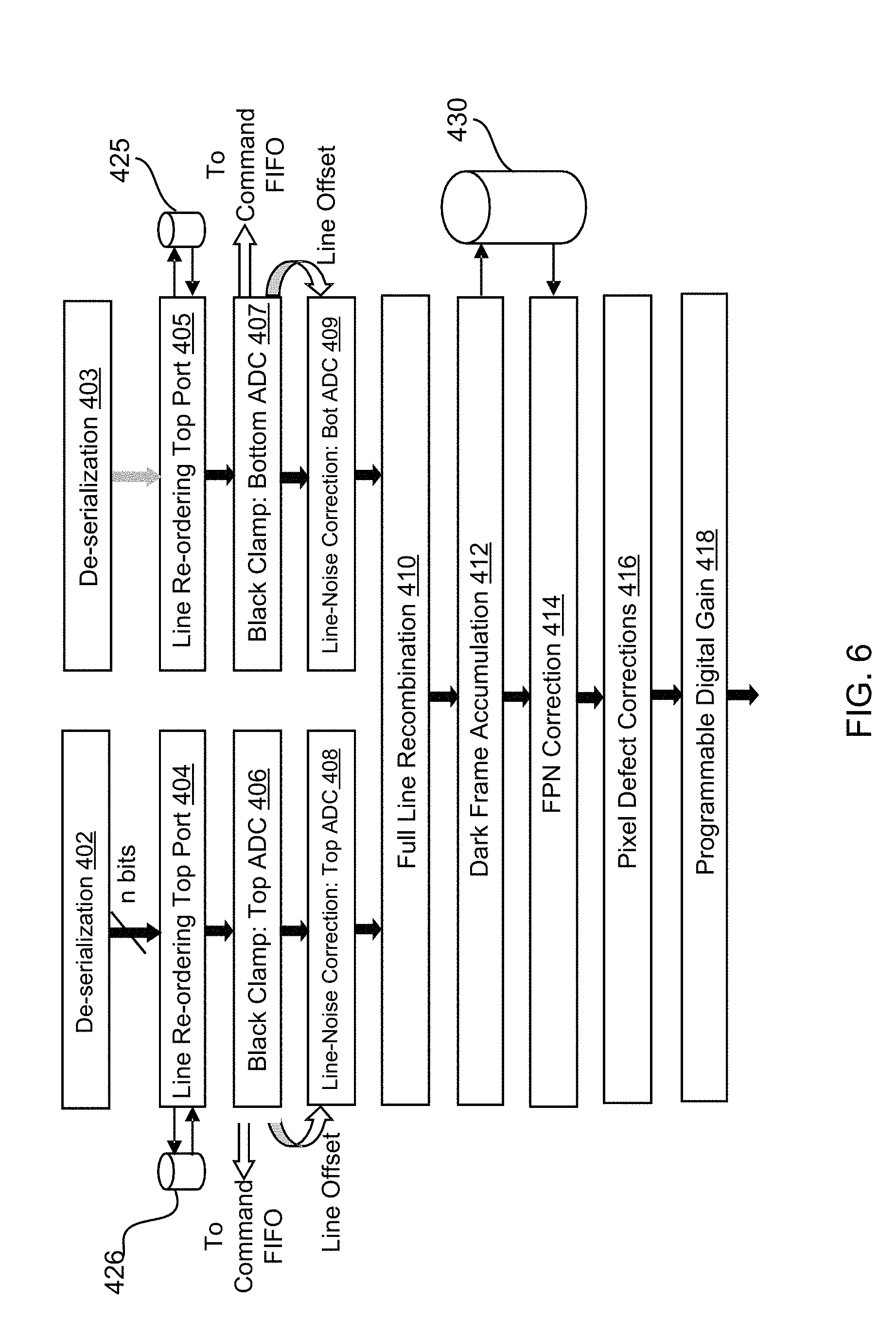 Following de-serialization, the first process may be concerned with reconstructing the line for each port into the appropriate order. The next two correction blocks, dealing with the black clamp and the line noise correction, are both data-path specific, i.e. the two chains would be treated separately.