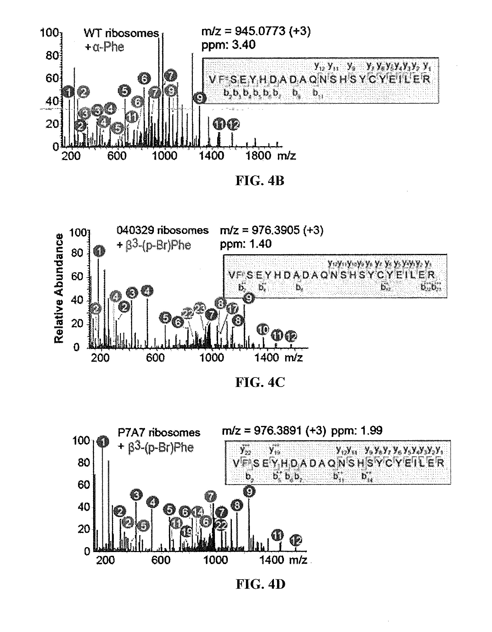 Spectral counting analysis of the extent of β3-(p-Br)Phe and α-Phe incorporation into DHFR by ribosomes The spectra for peptides containing β3-(p-Br)Phe includes both +91.9 and +93.9 isotopes of Bromine, with the +93.9 isotope included in the value listed for the calculated molecular weight (MWcalc) β3-(p- Br)Phe:α- Ribosome Peptide X MWcalc Spectra Phe 040329 VXSEYHDADAQNSHSYCYEILER α- 2832.208 271 1:34 (SEQ ID NO: 8) Phe VXSEYHDADAQNSHSYCYEILER β3- 2926.144 8 (SEQ ID NO: 9) Br- hPhe P7_A7 VXSEYHDADAQNSHSYCYEILER α- 2832.208 145 1:9 (SEQ ID NO: 8) Phe VXSEYHDADAQNSHSYCYEILER β3- 2926.144 16 (SEQ ID NO: 9) Br- hPhe P7A7 rRNA Sequence: (SEQ ID NO: 4) AGCGUUCUUUGAAGUGCUCACACAGAUUGUCUGAUGAAAAUGA GCAGUAAAACCUCUACAGGCUUGUAGCUCAGGUGGUUAGAGCG CACCCCUGAUAAGGGUGAGGUCGGUGGUUCAAGUCCACUCAGG CCUACCAAAUUUGCACGGCAAAUUUGAAGAGGUUUUAACUACA UGUUAUGGGGCUAUAGCUCAGCUGGGAGAGCGCCUGCUUUGCA CGCAGGAGGUCUGCGGUUCGAUCCCGCAUAGCUCCACCAUCUCU GUAGUGAUUAAAUAAAAAAUACUUCAGAGUGUACCUGCAAAGG UUCACUGCGAAGUUUUGCUCUUUAAAAAUCUGGAUCAAGCUGA AAAUUGAAACACUGAACAACGAAAGUUGUUCGUGAGUCUCUCA AAUUUUCGCAACACGAUGAUGAAUCGAAAGAAACAUCUUCGGG UUGUGAGGUUAAGCGACUAAGCGUACACGGUGGAUGCCCUGGC AGUCAGAGGCGAUGAAGGACGUGCUAAUCUGCGAUAAGCGUCG GUAAGGUGAUAUGAACCGUUAUAACCGGCGAUUUCCGAAUGGG GAAACCCAGUGUGUUUCGACACACUAUCAUUAACUGAAUCCAU AGGUUAAUGAGGCGAACCGGGGGAACUGAAACAUCUAAGUACC CCGAGGAAAAGAAAUCAACCGAGAUUCCCCCAGUAGCGGCGAG CGAACGGGGAGCAGCCCAGAGCCUGAAUCAGUGUGUGUGUUAG UGGAAGCGUCUGGAAAGGCGUGCGAUACAGGGUGACAGCCCCG UACACAAAAAUGCACAUGCUGUGAGCUCGAUGAGUAGGGCGGG ACACGUGGUAUCCUGUCUGAAUAUGGGGGGACCAUCCUCCAAG GCUAAAUACUCCUGACUGACCGAUAGUGAACCAGUACCGUGAG GGAAAGGCGAAAAGAACCCCGGCGAGGGGAGUGAAAAAGAACC UGAAACCGUGUACGUACAAGCAGUGGGAGCACGCUUAGGCGUG UGACUGCGUACCUUUUGUAUAAUGGGUCAGCGACUUAUAUUCU GUAGCAAGGUUAACCGAAUAGGGGAGCCGAAGGGAAACCGAGU CUUAACUGGGCGUUAAGUUGCAGGGUAUAGACCCGAAACCCGG UGAUCUAGCCAUGGGCAGGUUGAAGGUUGGGUAACACUAACUG GAGGACCGAACCGACUAAUGUUGAAAAAUUAGCGGAUGACUUG UGGCUGGGGGUGAAAGGCCAAUCAAACCGGGAGAUAGCUGGUU CUCCCCGAAAGCUAUUUAGGUAGCGCCUCGUGAAUUCAUCUCCG GGGGUAGAGCACUGUUUCGGCAAGGGGGUCAUCCCGACUUACC AACCCGAUGCAAACUGCGAAUACCGGAGAAUGUUAUCACGGGA GACACACGGCGGGUGCUAACGUCCGUCGUGAAGAGGGAAACAA CCCAGACCGCCAGCUAAGGUCCCAAAGUCAUGGUUAAGUGGGA AACGAUGUGGGAAGGCCCAGACAGCCAGGAUGUUGGCUUUGAA GCAGCCAUCAUUUAAAGAAAGCGUAAUAGCUCACUGGUCGAGU CGGCCUGCGCGGAAGAUGUAACGGGGCUAAACCAUGCACCGAA GCUGCGGCAGCGACACUAUGUGUUGUUGGGUAGGGGAGCGUUC UGUAAGCCUGUGAAGGUGUGCUGUGAGGCAUGCUGGAGGUAUC AGAAGUGCGAAUGCUGACAUAAGUAACGAUAAAGCGGGUGAAA AGCCCGCUCGCCGGAAGACCAAGGGUUCCUGUCCAACGUUAAUC GGGGCAGGGUGAGUCGACCCCUAAGGCGAGGCCGAAAGGCGUA GUCGAUGGGAAACAGGUUAAUAUUCCUGUACUUGGUGUUACUG CGAAGGGGGGACGGAGAAGGCUAUGUUGGCCGGGCGACGGUUG UCCCGGUUUAAGCGUGUAGGCUGGUUUUCCAGGCAAAUCCGGA AAAUCAAGGCUGAGGCGUGAUGACGAGGCACUACGGUGCUGAA GCAACAAAUGCCCUGCUUCCAGGAAAAGCCUCUAAGCAUCAGG UAACAUCAAAUCGUACCCCAAACCGACACAGGUGGUCAGGUAG AGAAUACCAAGGCGCUUGAGAGAACUCGGGUGAAGGAACUAGG CAAAAUGGUGCCGUAACUUCGGGAGAAGGCACGCUGAUAUGUA GGUGAAGCGACUUGCUCGUGGAGCUGAAAUCAGUCGAAGAUAC CAGCUGGCUGCAACUGUUUAUUAAAAACACAGCACUGUGCAAA CACGAAAGUGGACGUAUACGGUGUGACGCCUGCCCGGUGCCGG AAGGUUAAUUGAUGGGGUUAGCCGCAAGGCGAAGCUCUUGAUC GAAGCCCCGGUAAACGGCGGCCGUAACUAUAACGGUCCUAAGG UAGCGAAAUUCCUUGUCGGGUAAGUUCCGACCUGCACGAAUGG CGUAAUGAUGGCCAGGCUGUCUCCACCCGAGACUCAGUGAAAU UGAACUCGCUGUGAAGAUGCAGUGUACCCGCGGCAAGACGAGC GUGACCCGUGAACCUUUACUAUAGCUUGACACUGAACAUUGAG CCUUGAUGUGUAGGAUAGGUGGGAGGCUUUGAAGUGUGGACGC CAGUCUGCAUGGAGCCGACCUUGAAAUACCACCCUUUAAUGUU UGAUGUUCUAACGUUGACCCGUAAUCCGGGUUGCGGACAGUGU CUGGUGGGUAGUUUGACUGGGGCGGUCUCCUCCUAAAGAGUAA CGGAGGAGCACGAAGGUUGGCUAAUCCUGGUCGGACAUCAGGA GGUUAGUGCAAUGGCAUAAGCCAGCUUGACUGCGAGCGUGACG GCGCGAGCAGGUGCGAAAGCAGGUCAUAGUGAUCCGGUGGUUC UGAAUGGAAGGGCCAUCGCUCAACGGAUAAAAGGUACUCCGGG GAUAACAGGCUGAUACCGCCCAAGAGUUCAUAUCGACGGCGGU GUUUGGCACCUCUGACUUGGCUCAUCACAUCCUGGGGCUGAAG UAGGUCCCAAGGGUAUGGCUGUUCGCCAUUUAAAGUGGUACGC GAGCUGGGUUUAGAACGUCGUGAGACAGUUCGGUCCCUAUCUG CCGUGGGCGCUGGAGAACUGAGGGGGGCUGCUCCUAGUACGAG AGGACCGGAGUGGACGCAUCACUGGUGUUCGGGUUGUCAUGCC AAUGGCACUGCCCGGUAGCUAAAUGCGGAAGAGAUAAGUGCUG AAAGCAUCUAAGCACGAAACUUGCCCCGAGAUGAGUUCUCCCU GACUCCUUGAGAGUCCUGAAGGAACGUUGAAGACGACGACGUU GAUAGGCCGGGUGUGUAAGCGCAGCGAUGCGUUGAGCUAACCG GUACUAAUGAACCGUGAGGCUUAACCUUACAACGCCGAAGGUG UUUUGGCGGAUUGAGAGAAGAUUUUCAGCCUGAUACAGAUUAA AUCAGAACGCAGAAGCGGUCUGAUAAAACAGAAUUUGCCUGGC GGCAGUAGCGCGGUGGUCCCACCUGACCCCAUGCCGAACUCAGA AGUGAAACGCCGUAGCGCCGAUGGUAGUGUGGGGUCUCCUCAU GCGAGAGUAGGGAACUGCCAGGCAUCAAAUAAAACGAAAGGCU CAGUCGGAAGACUGGGCCUUUCGUUUUAUCUGUUGUUUGUCGG UGAACGCUCUCCUGAGUAGGACAAAUCCGCCGGGAGCGGAUUU GAACGUUGCGAAGCAACGGCCCGGAGGGUGGCGGGCAGGACGC CCGCCAUAAACUGCCAGGCAUCAAAUUAAGCAGAAGGCCAUCCU GACGGAUGGCCUUUUUGCAUUGGCGCAGAAA