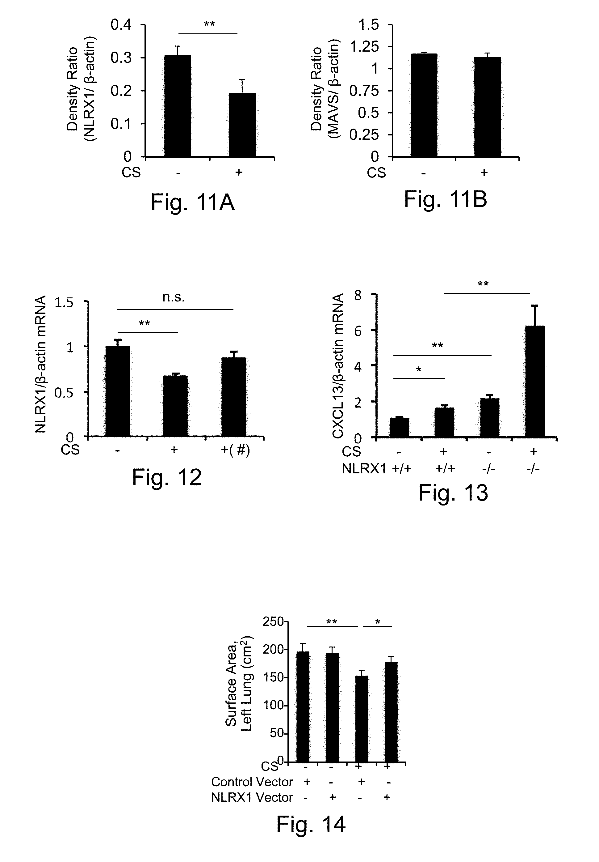 It is demonstrated herein that NLRX1 expression is significantly decreased in three COPD cohorts. This suppression correlated with disease severity and inversely with pulmonary function, quality of life and prognosis. CS inhibited murine NLRX1 and null mutations of NLRX1 augmented CS-induced inflammation, alveolar destruction, protease induction, structural cell apoptosis and inflammasome activation. In contrast, null mutations of MAVS abrogated this CS-induced inflammation and remodeling. Furthermore, restoration of NLRX1 ameliorated CS-induced alveolar destruction significantly. Thus, CS inhibits NLRX1 which facilitates CS-induced and MAVS-dependent inflammatory, remodeling, protease, cell death and inflammasome responses. Cigarette smoke (CS) causes a broad spectrum of diseases characterized by inflammation and tissue remodeling including chronic obstructive pulmonary disease (COPD), cancer and atherosclerosis(1-3). In many of these disorders the inflammation is believed to drive disease pathogenesis. This can be seen in, COPD, the fourth leading cause of death in the world, where pulmonary inflammation is believed to be causally related to the emphysema and other pathologic alterations in the lungs from these patients(3-5). CS regulates the inflammasome where it activates caspase 1 and IL-18(6, 7). IL-18 signaling also plays a key role in the pathogenesis of CS-induced inflammation and emphysema(6). However, the mechanism(s) that controls lung inflammasome activation at baseline and the alterations that CS induces to activate the inflammasome have not been defined. Mitochondria are cellular powerhouses that generate ATP and participate in other critical responses including calcium homeostasis, cell signaling, apoptosis, and aging(8). Recent studies also demonstrated that mitochondria play a critical role in cellular innate antiviral immunity (reviewed in references 9, 10). Viral infections are well known to play important roles in the pathogenesis of CS-induced disorders such as COPD (11,12). CS and viruses/viral PAMPs interact to induce exaggerated pulmonary inflammatory and remodeling responses and that MAVS (mitochondrial antiviral signaling molecule) plays a critical role in this interaction(5). MAVS is exquisitely regulated by stimulators such as the RIG-like helicases that induce MAVS self-association and induce inflammation. Importantly, it is now known that MAVS is tonically inhibited in the quiescent non-infected state (reviewed in reference 13). In addition, the mitochondrial protein, nucleotide-binding, leucine-rich repeats (NLR) molecule X1 (NLRX1) has been reported to inhibit virus activation of MAVS (14-16). It is hypothesized herein that mitochondria play a critical role in the pathogenesis of CS-induced responses in COPD. Specifically it was hypothesized that the tissue effects of CS are mediated by its ability to abrogate the effects of specific MAVS inhibitors and that NLRX1 is a critical target of this CS-induced dysinhibition. To test this hypothesis the expression of NLRX1 was evaluated in three cohorts of patients with COPD and the relationships between NLRX1 suppression and disease severity were characterized. In addition, the effects of CS on the expression of NLRX1 were evaluated and the roles of MAVS and NLRX1 in CS-induced murine pulmonary inflammation and alveolar remodeling responses were defined. First, mRNAs were extracted from fresh frozen lung tissues from the 7 controls and 36 patients with COPD in the NIH-sponsored Lung Tissue Research Consortium (LTRC) cohort. The latter contained 6, 10, 10 and 10 specimens from GOLD stage 1, 2, 3 and 4 individuals, respectively. The basic demographic characteristics of these patients are summarized in the Table 1. Interestingly, real-time RT-PCR analysis demonstrated that the levels of mRNA encoding NLRX1 were significantly decreased in patients with advanced stages of COPD (FIG. 1A-1B). In keeping with this observation, western blot evaluations of mitochondria-enriched protein fractions demonstrated that the expression of NLRX1 protein was significantly decreased in patients with advanced stages of COPD ( To further understand the clinical implications of these findings, the relationships between NLRX1 gene expression and clinical parameters of COPD were evaluated. These studies demonstrated that, in the LTRC cohort, the levels of NLRX1 gene expression also correlated with other measures of pulmonary function including diffusing capacity (DLCO) and 6 minute-walking distance ( To define the role(s) of NLRX1 in CS-induced responses, the effects of CS on NLRX1 expression in WT mice were characterized and the CS-induced tissue responses in WT and NLRX1 null mutant (−/−) animals were defined using previously described methodology (5, 6). NLRX1 mRNA and protein were readily appreciated in lungs and enriched mitochondria from WT mice ( Immunohistochemical staining of NLRX1 protein revealed that NLRX1 expression was prominent in alveolar macrophages both in mice and humans (data not shown). Western blot analysis of NLRX1 protein in BAL cells from 3 month-CS-exposed lungs where alveolar macrophages consist of more than 95% of total BAL cells further confirmed that NLRX1 protein was significantly suppressed after CS exposure ( To further define the mechanisms by which NLRX1 suppression mediates CS-induced pulmonary inflammation and alveolar remodeling responses, the molecules/pathways that are believed to play important roles in the COPD pathogenesis were evaluated. In accord with the importance of protease anti-protease balance, cell death, viral infection and inflammasome activation in COPD pathogenesis (reviewed in references (3, 19-21)), CS induction of MMP-12 ( The studies noted above demonstrate that CS exposure decreases NLRX1 expression and NLRX1 has been reported to be an inhibitor of MAVS (14, 15). Thus studies were next undertaken to determine if mitochondria, in particular MAVS, plays an important effector 