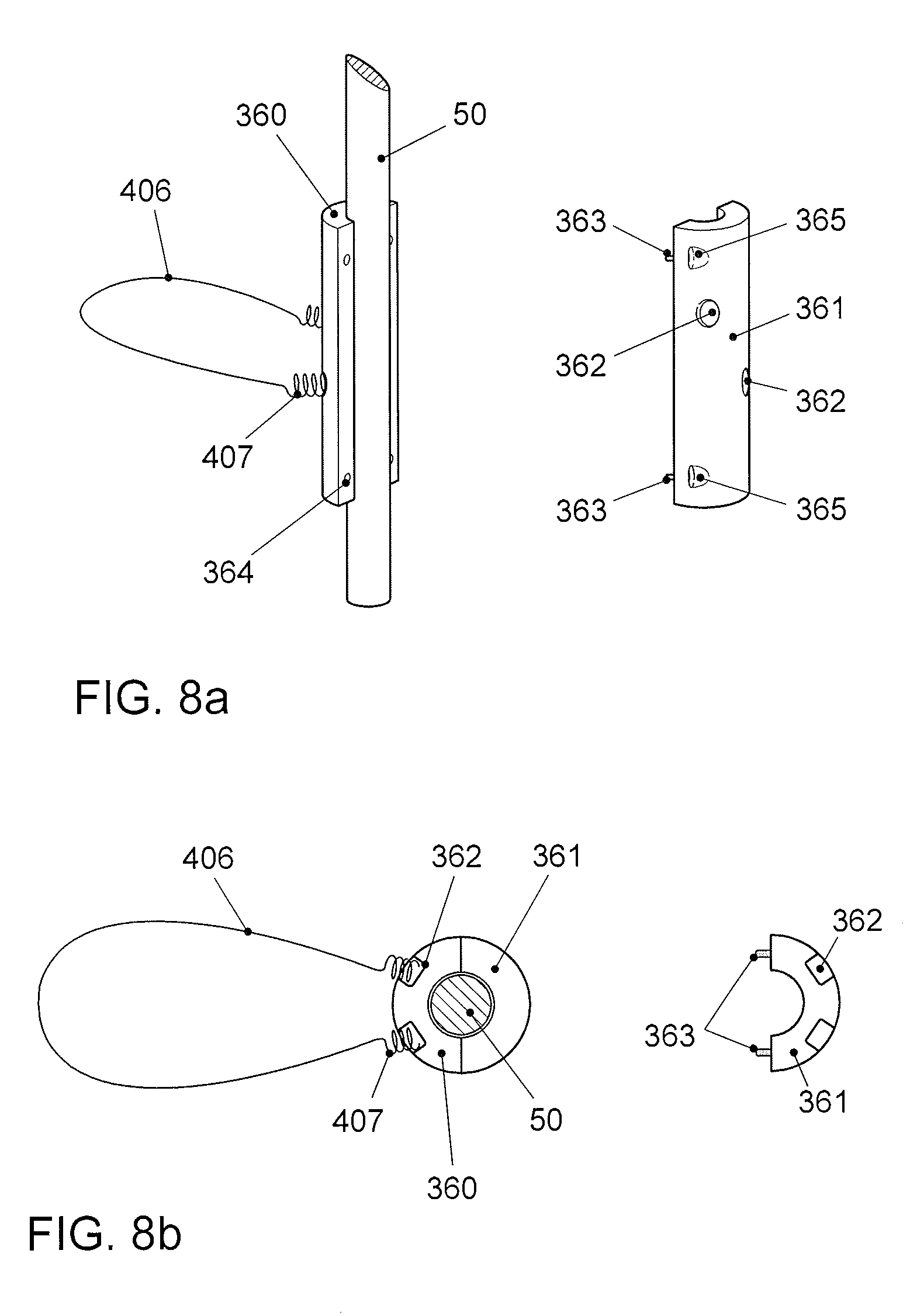 [0021]FIG. 8 shows a further configuration of fall arrester elements according to the invention. The net elements, in this case loops (406) having spring joints (407), are carried by a two-part sleeve-like metal body consisting of two body halves (360, 361) that are able to be screwed together. The spring joints are in this case inserted into lateral depressions or recesses (362) that are distributed radially around the circumference of the body halves. The inside diameter of the sleeve-like body is adapted to the diameter of the carrier, in this case of the light guide (50), such that when the two body halves are screwed together, the body is fixed to the light guide (50) in a form-fitting manner. FIG. 8a) shows the perspective view of the arrangement before the two body halves (360, 361) are screwed together. FIG. 8b) shows a cross section through the body screwed to the light guide (50). A filling-material deflector (10) (not shown here) according to the invention can, according to this embodiment, be arranged on the light guide (50) likewise above each fall arrester element.