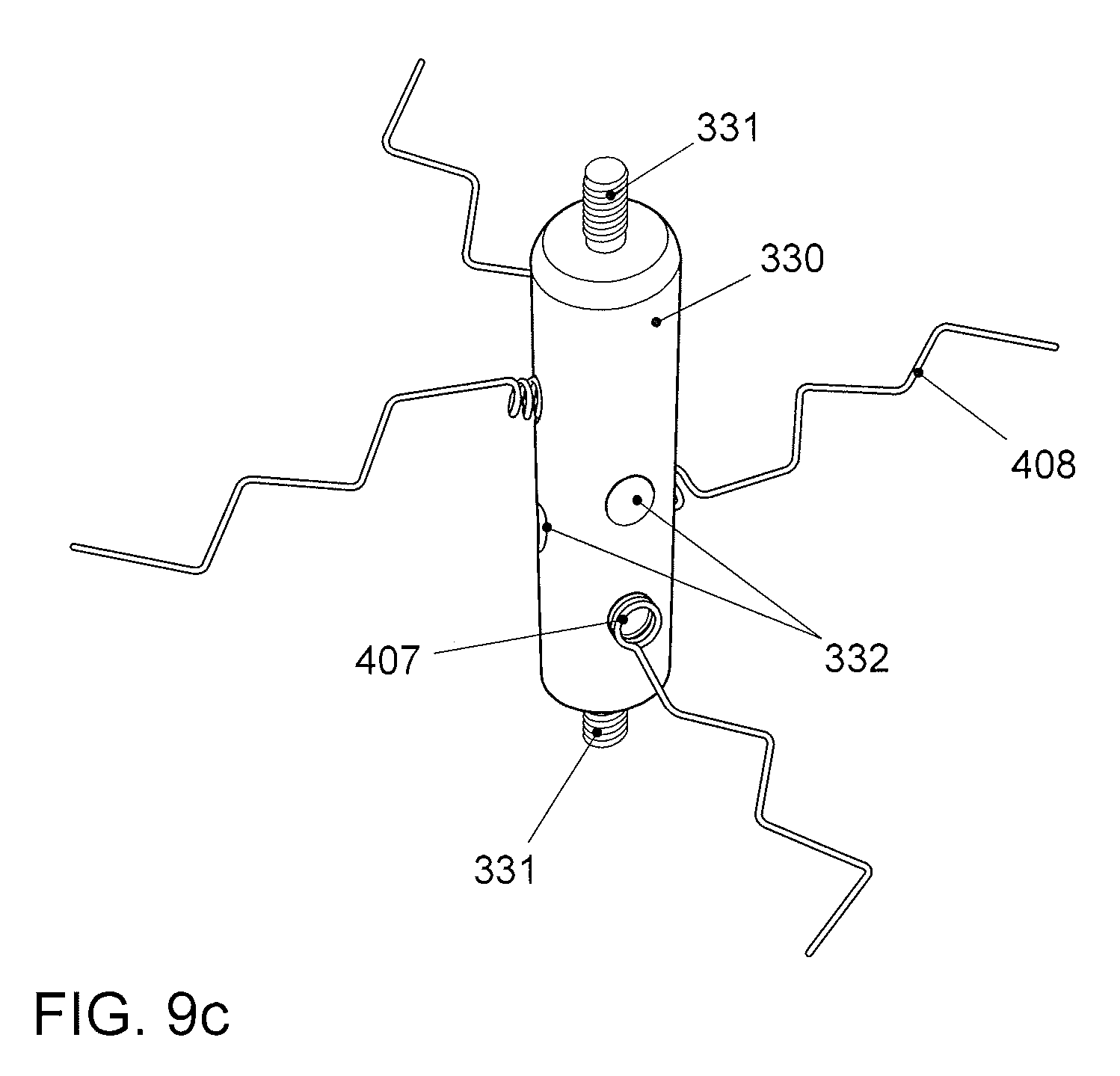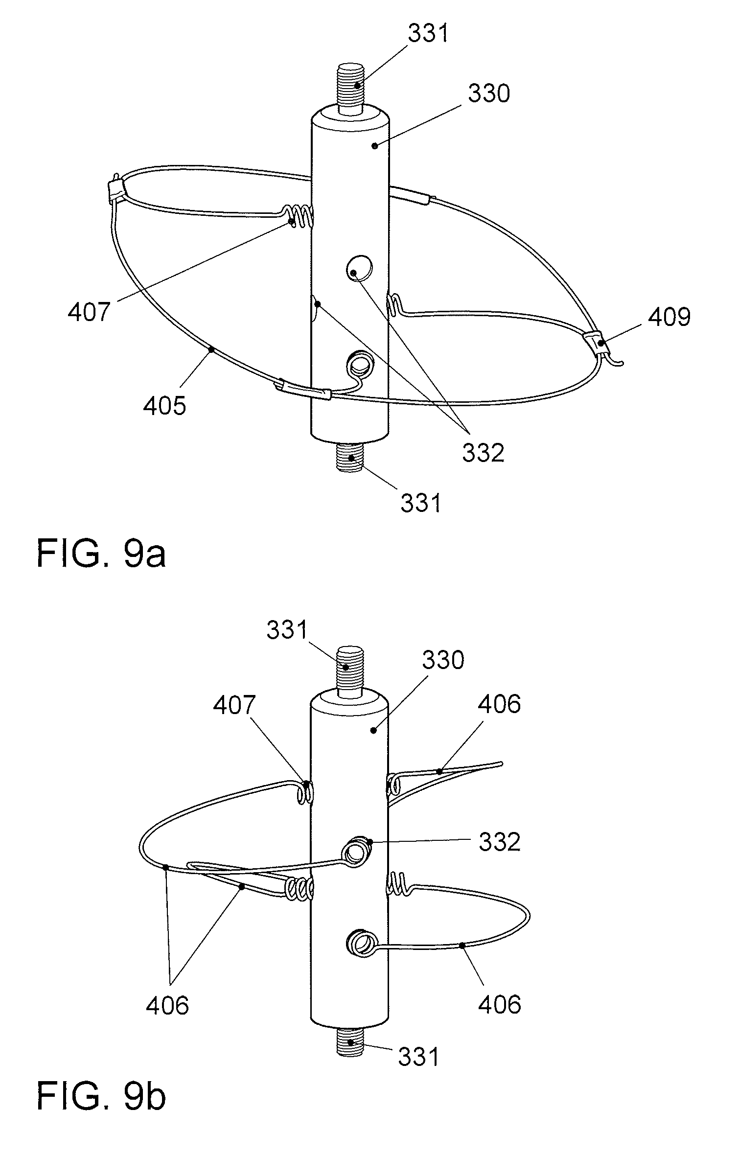 [0022]FIG. 9 shows further configurations of fall arrester elements according to the invention. A one-piece metal body (330) is provided with a screw thread (331) at each of its top and bottom ends. Via this screw thread (331), it is able to be connected to the carrier (2) (not illustrated). Provided around the entire circumference of the central portion of the body (330) are a plurality of depressions or recesses (332), which are configured such that the net elements, produced for example from individual pieces of steel wire, are able to be fixed therein, said net elements together forming a three-dimensional net. In particular, depressions (332) are provided here which can receive the spring joints (407). The spring joints (407) project out of the depressions (332) to such an extent that an improved spring action is ensured. FIG. 9a) shows a made up of four fibers (405) that are distributed radially around the circumference of the body (330) and together form a three-dimensional net of the illustrated fall arrester element, wherein each distal fiber end is connected to an adjacent fiber (405) in the central portion thereof with the aid of a connector (409). If necessary or desired, it is possible for additional fibers to be inserted into further depressions (332) in order to configure the three-dimensional net structure in a more close-meshed manner. FIG. 9b) shows a three-dimensional net, formed from four loops (406), of the illustrated fall arrester element, wherein both ends of each of the loops are configured as spring joints (407) and have been inserted into one of a total of eight depressions (332) that are distributed radially and longitudinally on the body (330). If necessary or desired, further depressions (332) for additional loops can be formed in order to configure the three-dimensional net structure with additional loops in a more close-meshed manner. FIG. 9c) shows a three-dimensional net, formed from four zigzag fibers (408), of the illustrated fall arrester element, wherein each of the fibers has been inserted via a spring joint (407) into one of several depressions (332) distributed radially and longitudinally on the body (330). If necessary or desired, additional fibers can be inserted into further depressions (332) in order to configure the three-dimensional net structure in a more close-meshed manner.