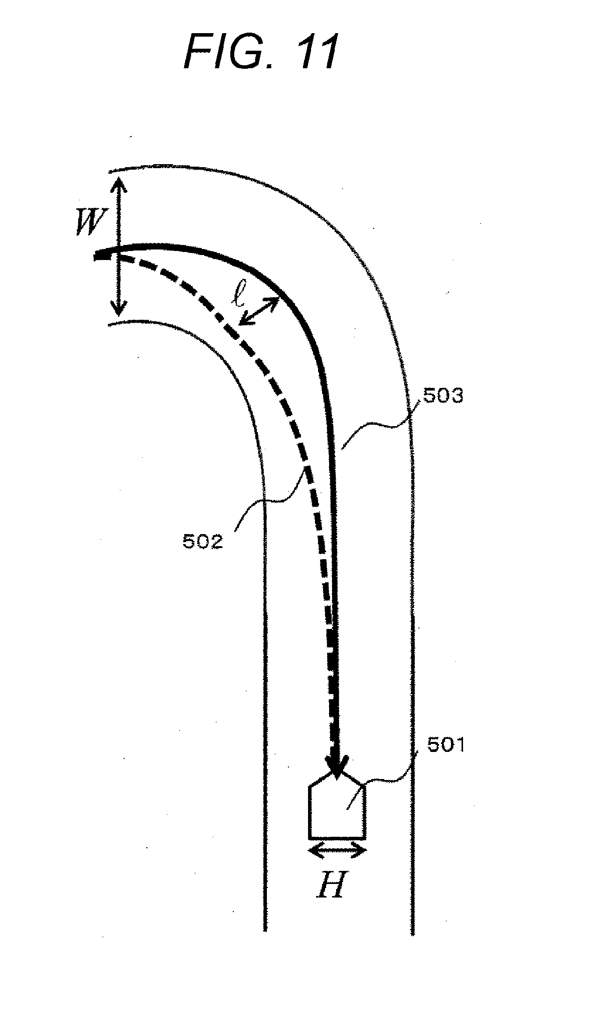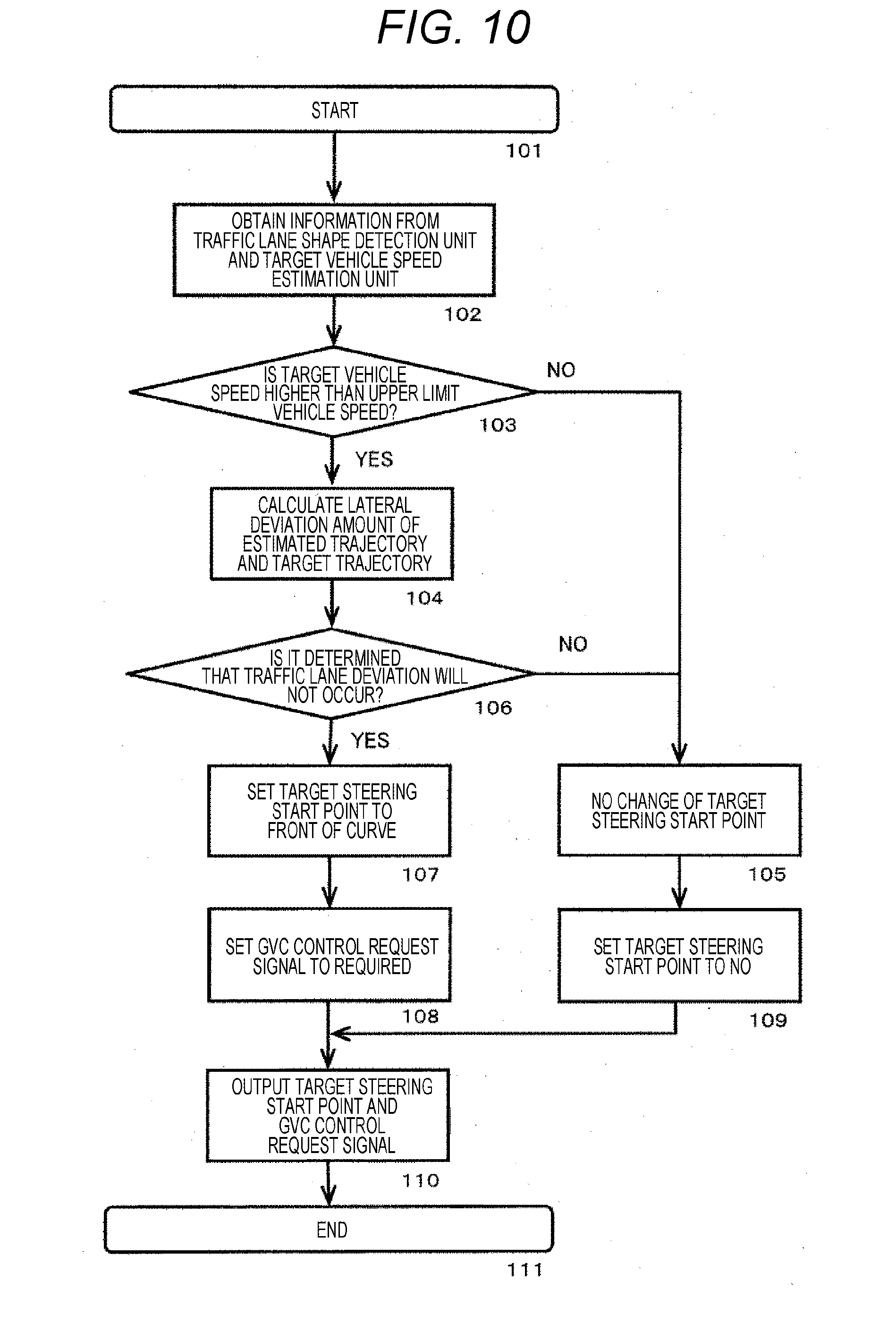 FIG. 14 illustrates an example illustrating a difference in the steering start point due to a difference in the vehicle width of the vehicle. On the assumption of the same curve shape, in a case where each vehicle (the vehicle width of a vehicle 801 is smaller than the width of a vehicle 811) travels along the curve, a lateral deviation amount l1of an estimated trajectory 802 of the GVC and a target trajectory 803 in the center of the traffic lane for the vehicle 801 having a large vehicle width is larger than a lateral deviation amount l2of an estimated trajectory 812 of the GVC and a target trajectory 813 in the center of the traffic lane for the vehicle 811 having a small vehicle width. Therefore, the steering start point can be set at a point farther from the front of the curve on the basis of Equation 6.