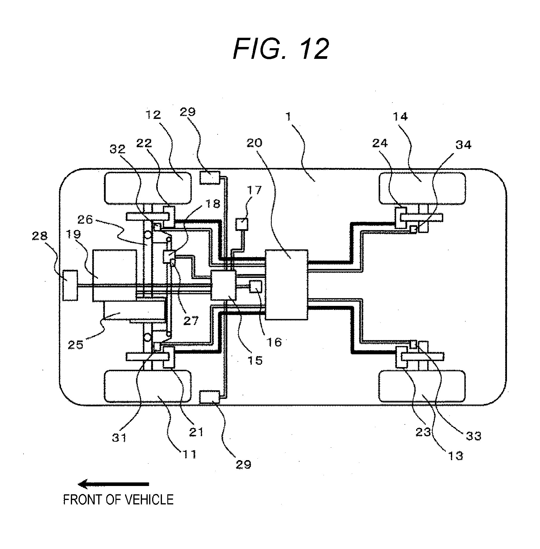 The braking devices 21 to 24 operate in response to receiving the hydraulic pressure from the brake control device 20 and generate braking force on four wheels 11 to 14.