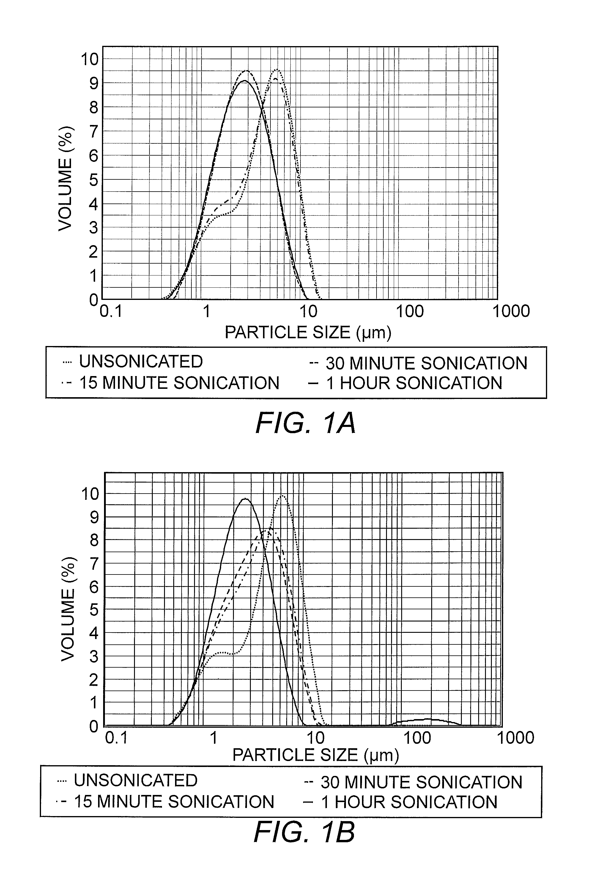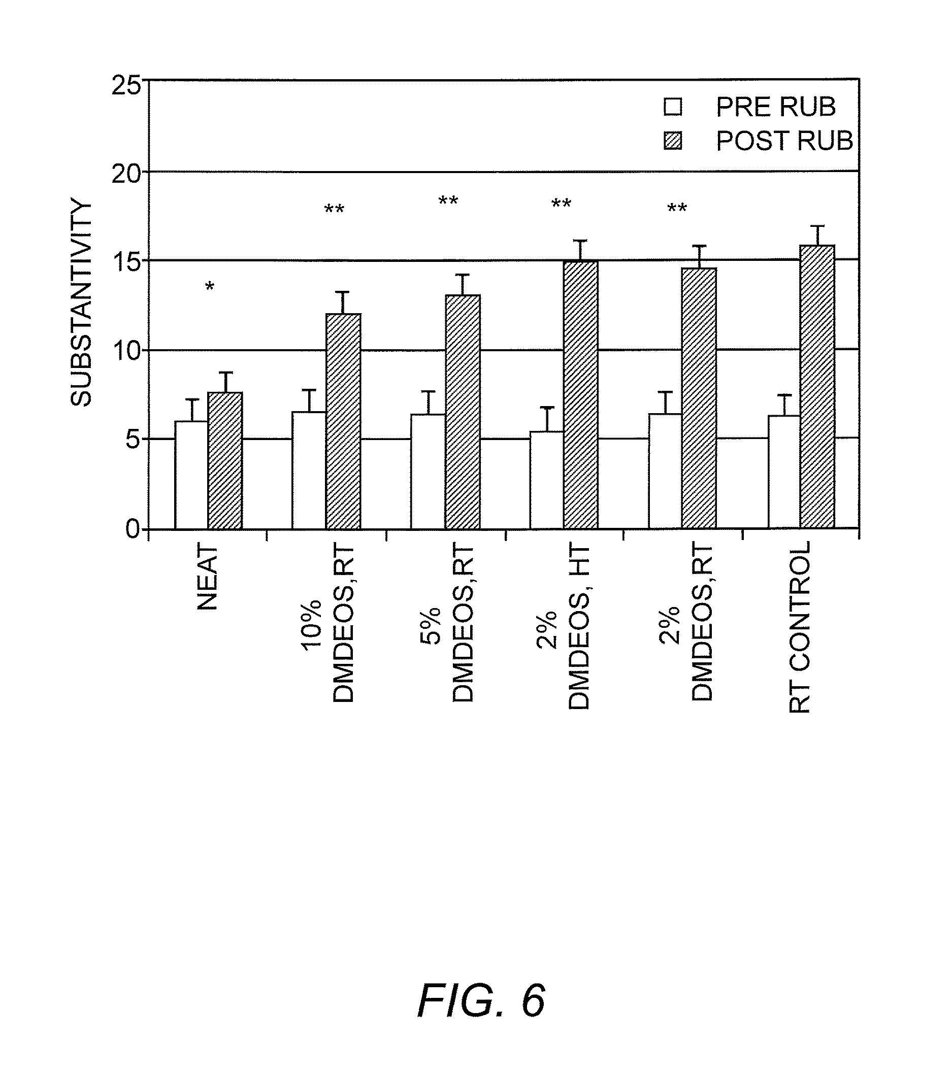 Extraction % Fragrance Extracted Time TEOS Capsule TEOS + DMDEOS Capsule (minutes) Rep. 1 Rep. 2 Rep. 1 Rep. 2 1 0.17 0.21 0.16 0.20 10 0.41 0.38 0.34 0.30 30 0.51 0.44 0.44 0.38 60 0.65 0.60 0.53 0.56 % Fragrance Extracted 0.75% 0.5% DMDEOS + 0.5% TEOS DMDEOS + TEOS DMDEOS + Extraction Capsule TEOS Capsule TEOS Time Batch Batch Capsule Batch Batch Capsule (minutes) 1 2 Batch 1 1 2 Batch 1 1 0.21 0.14 0.15 0.20 0.17 0.14 10 0.38 0.17 0.23 0.30 0.22 0.23 30 0.44 0.20 0.31 0.38 0.30 0.32 60 0.60 0.25 0.39 0.56 0.44 0.43 Extraction Time % Urban Legend Fragrance Extracted (minutes) TEOS Capsule DMDEOS + TEOS Capsule 1 0.34 0.55 10 0.51 0.75 30 0.66 1.30 60 0.88 2.25 % Perfect Match Fragrance Extracted 0.75% 1.5% DMDEOS + 1.0% DMDEOS + TEOS TEOS DMDEOS + TEOS Extraction Capsule Capsule TEOS Capsule Time Batch Batch Batch Batch Capsule Batch Batch (minutes) 1 2 1 2 Batch 1 1 2 1 0.24 0.23 0.25 0.30 0.27 0.30 0.61 10 0.34 0.28 0.33 0.40 0.41 0.42 0.74 30 0.37 0.29 0.54 0.67 0.64 0.93 1.16 60 0.61 0.39 0.76 0.97 0.91 1.29 1.67 Extraction % Psychadelic Gourmand Fragrance Time Extracted (minutes) TEOS Capsule DMDEOS + TEOS Capsule 1 0.34 3.19 10 0.56 5.26 30 0.82 7.69 60 1.27 11.26 Microcapsule Skin Substantivity Particle Pre-Rub Post-Rub 0% DMDEOS 5.6 7.1 1% DMDEOS 5.8 7.7 Example 6: Silica Capsules with Improved Performance and Physical Stability