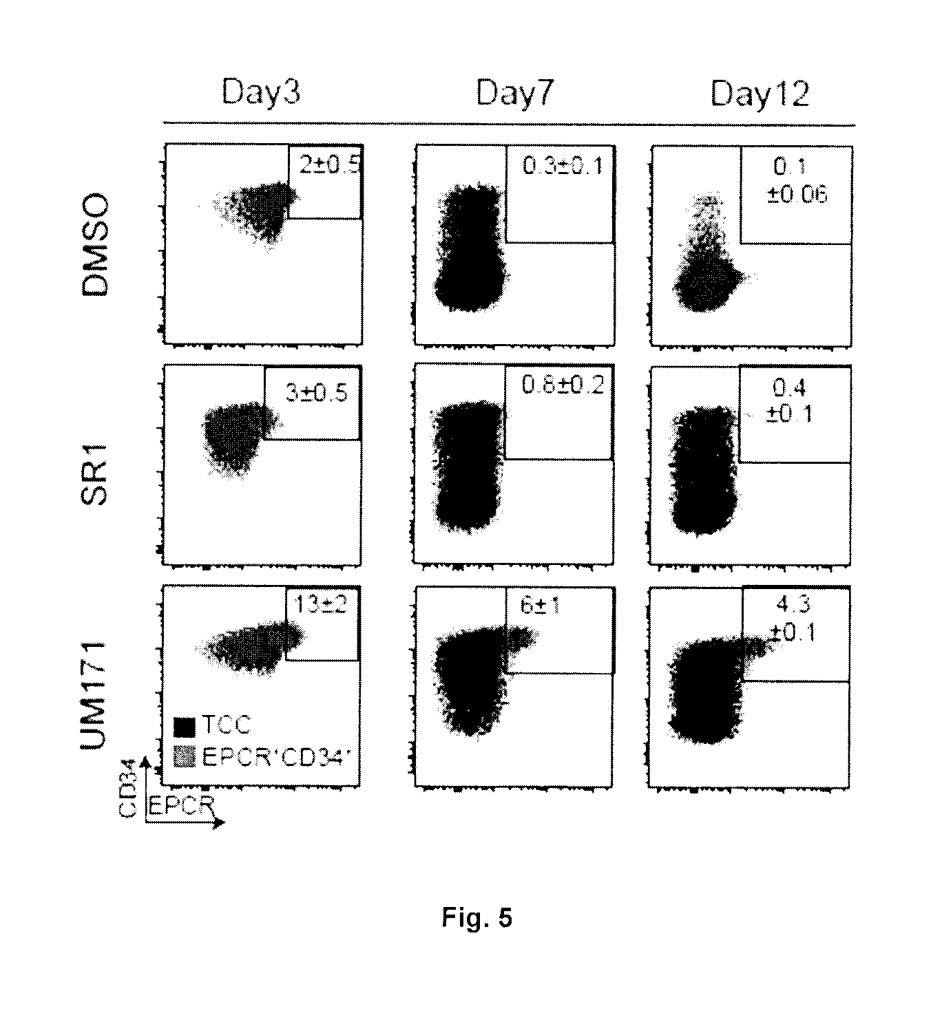 In an embodiment, in particular, using a starting cell population from umbilical cord blood cells, the culturing conditions comprise the use of other cell expanding factors like cytokines and growth factors, generally known in the art for HSC/HPC expansion. Such cytokines and growth factors can be biologics or small molecules and they include without limitation IL-1, IL-3, IL-6, IL-11, G-CSF, GM-CSF, SCF, FLT3 thrombopoietin (TPO), erythropoietin, and analogs thereof. As seen in FIG. 16, a combination of three cytokines (FLT3, SCF and TPO) or even four cytokines (FLT3, SCF, TPO and IL6) can be used in the culture media to expand EPCR cells as described herein. As used herein, “analogs” include any structural variants of the cytokines and growth factors having the biological activity as the naturally occurring forms, including without limitation, variants with enhanced or decreased biological activity when compared to the naturally occurring forms or cytokine receptor agonists such as an agonist antibody against the TPO receptor (for example, VB22B sc(Fv)2as detailed in patent publication WO 2007/145227, and the like). Cytokine and growth factor combinations are chosen to expand HSC and progenitor cells while limiting the production of terminally differentiated cells. In one specific embodiment, one or more cytokines and growth factors are selected from the group consisting of SCF, FLT-3, IL6, TPO, and a combination thereof.