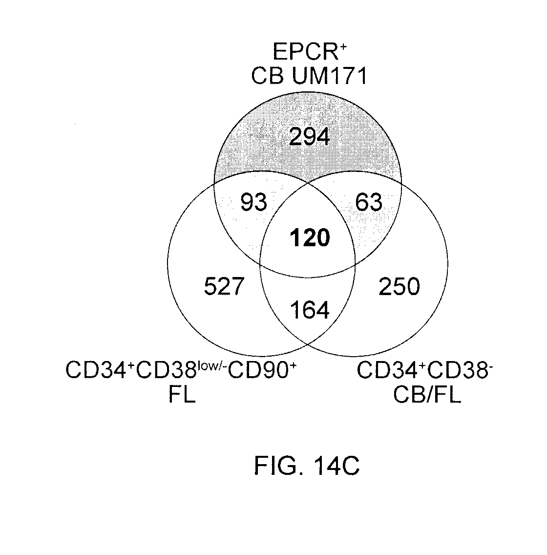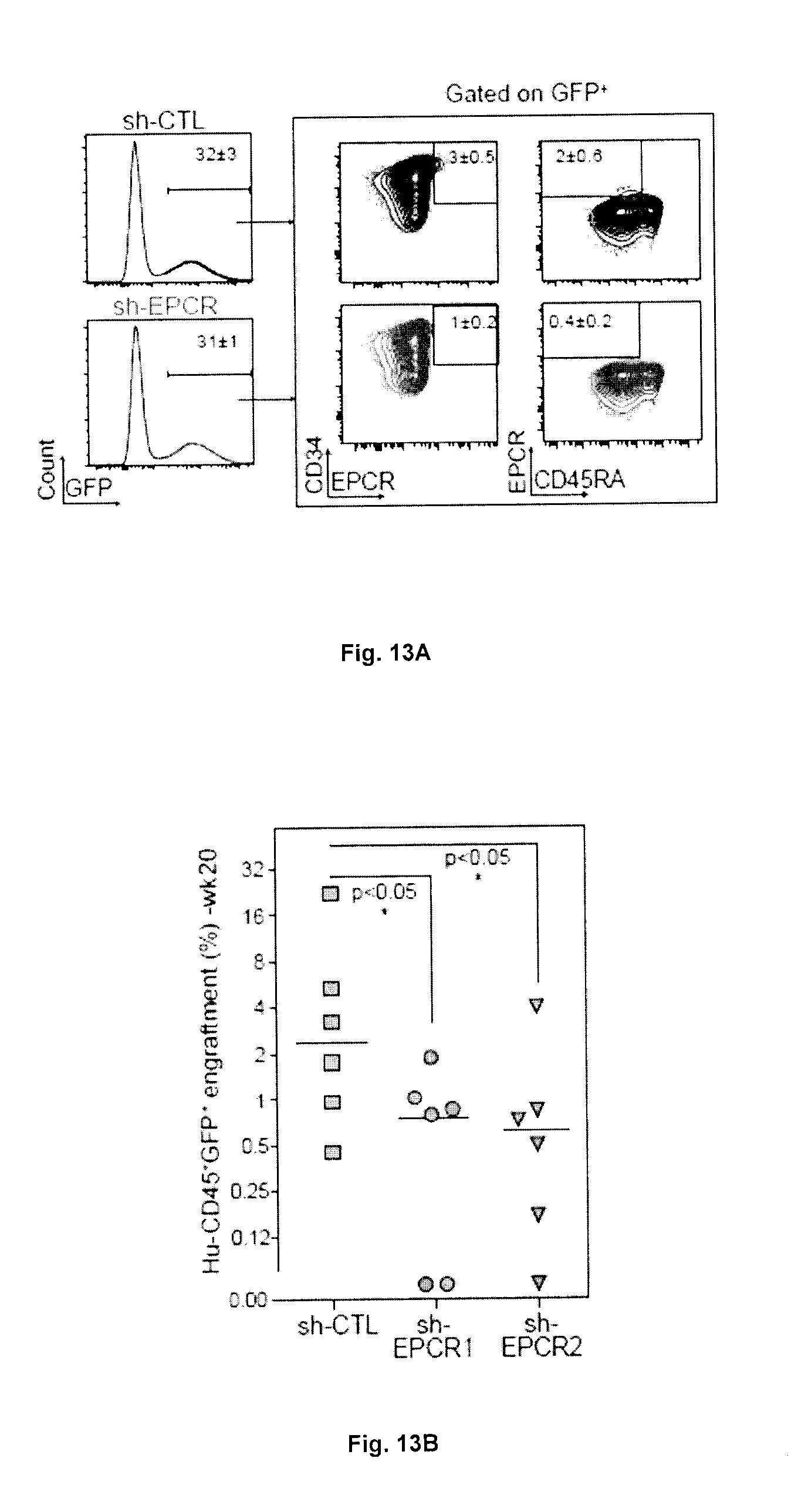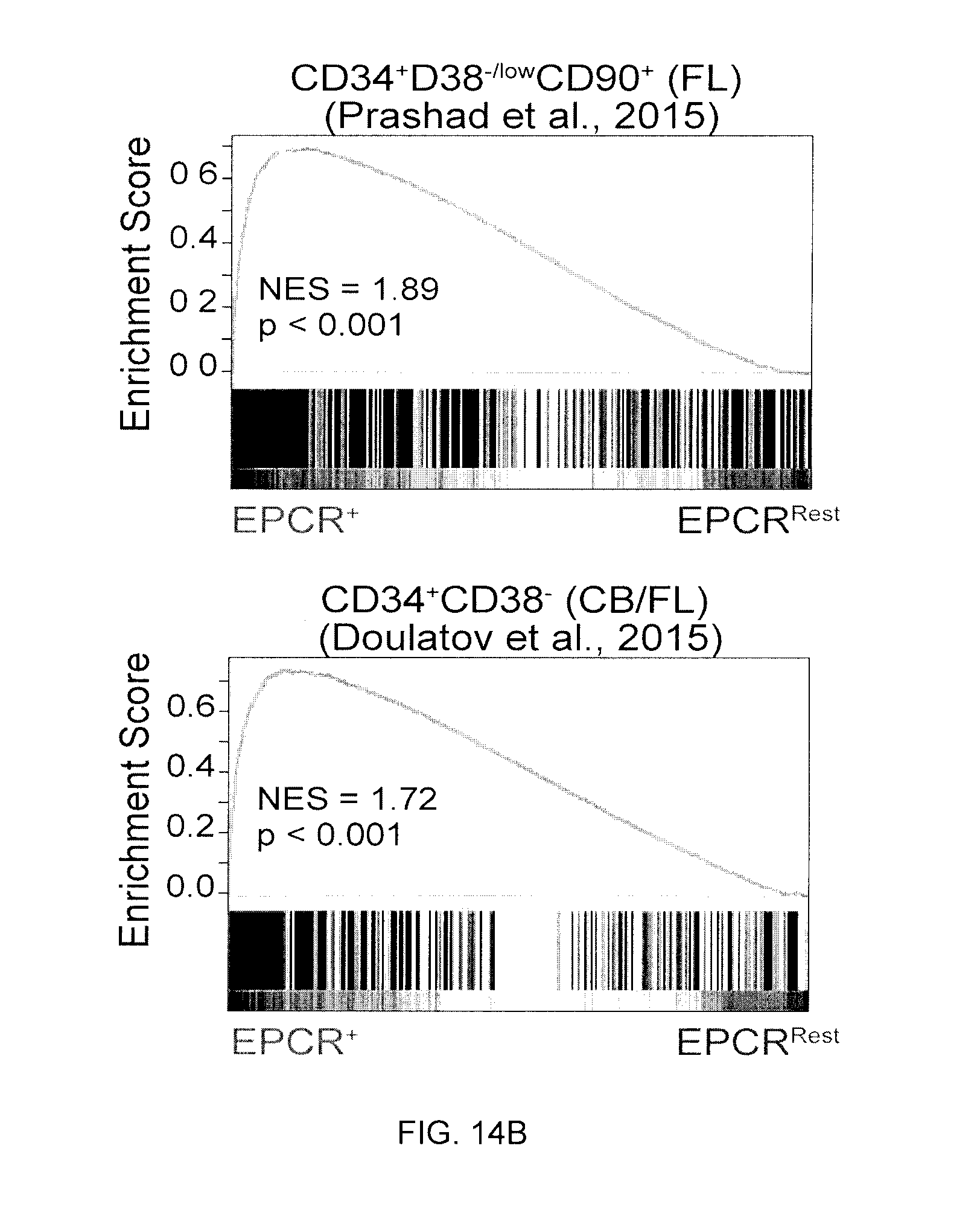 3-5×105cells were sorted from CB derived CD34+ HSPCs cultured for 7 days according to EPCR expression levels and preserved at −80° C. in TRIzol Reagent (Thermo Fisher Scientific Cat #15596026). cDNA libraries were constructed according to TruSeq Protocols (Illumina) and sequencing was performed using an Illumina HiSeq 2000 instrument. Casava pipeline (Illumina) and Refseq release 63 were used for subsequent mapping and quantification of gene expression. RPKM values were loaded into R and differential expression was tested using Wilcoxon rank sum statistics. Expressed genes were selected differentially based on significance (p≤0.01, Mann-Whitney test), their mean expression values in at least one of the comparison groups (≥1 RPKM) and a minimum twofold expression difference. All gene names were converted using the HGNChelper package in R to facilitate comparisons with external datasets. GSEA analyses were done using the GSEA desktop application (Broad Institute). Analyses were performed using the GSEA hallmark gene set collection and two curated HSC gene sets using standard settings. Overlap between genes associated with EPCR expression and published HSC signatures was determined using the intersect command in R. Heat maps were generated using the GENE-E software (Broad Institute). Gene expression Omnibus (GSO) Accession number GSE77128.