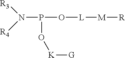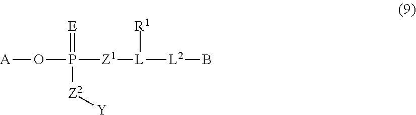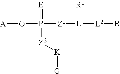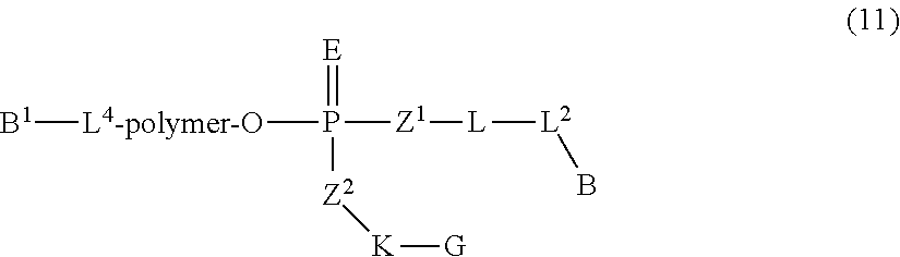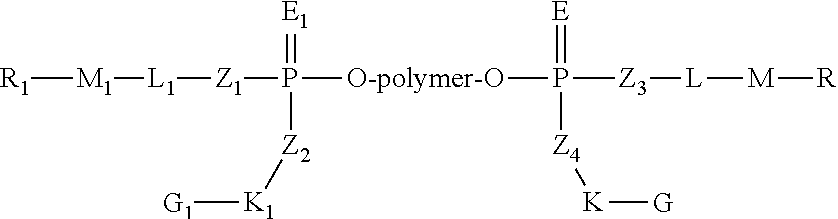 wherein polymer is a linear, water-soluble, non-peptidic, and non-nucleotidic polymer backbone (e.g., a PEG polymer), wherein M2and the phosphonate-derived functional group are bonded at a different terminus of said polymer; E and E1are independently O or S; K is selected from the group consisting of: alkylene, alkyleneoxyalkylene, and oligomeric alkyleneoxyalkylene; G is selected from the group consisting of: hydrogen, alkoxy, and a hydrophobic separation handle; Z1and Z2are independently selected from O and NH, wherein only one of Z1and Z2can be NH; L is selected from the group consisting of: a divalent radical of nucleoside, alkylene, alkyleneoxyalkylene, oligomeric alkyleneoxyalkylene, and unsubstituted and substituted arylene; L2is a covalent linking moiety (e.g., amide, carbamide, ester, oxime, thioether, dithioether, secondary amine, 1,2, 4-triazol, or hydrazide linking moiety); between L on the polymer backbone and B; L4is a covalent linking moiety (e.g., amide, carbamide, ester, oxime, thioether, dithioether, secondary amine, 1,2, 4-triazol, or hydrazide linking moiety); between L on the polymer backbone and B1; and B and B1are independently a biologically active molecule or a derivative of a biologically active molecule (e.g., a TNF inhibitor, a derivative of a TNF inhibitor, insulin, a derivative of insulin, omalizumab, a derivative of omalizumab, a clotting factor, a derivative of a clotting factor, a polypeptide that boosts red or white cell production, a derivative of a polypeptide that boosts red or white cell production, an antibody, or a derivative of an antibody), a biologic other than a biologically active molecule, a drug, a detectable group, a separation moiety, wherein at least one of B and B1is a biologically active molecule or a derivative of a biologically active molecule. For example, B can be a biologically active molecule and B1can be a derivative of a biologically active molecule; B and B1can both be a biologically active molecule; one of B and B1is a biologically active molecule and the other is a separation moiety; one of B and B1is a biologically active molecule and the other is a different biologic; one of B and B1is a biologically active molecule and the other is a detectable group; or one of B and B1 is a biologically active molecule and the other is a drug.