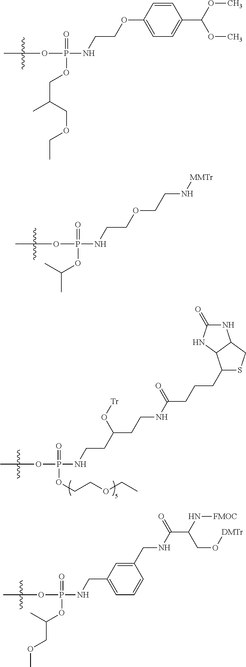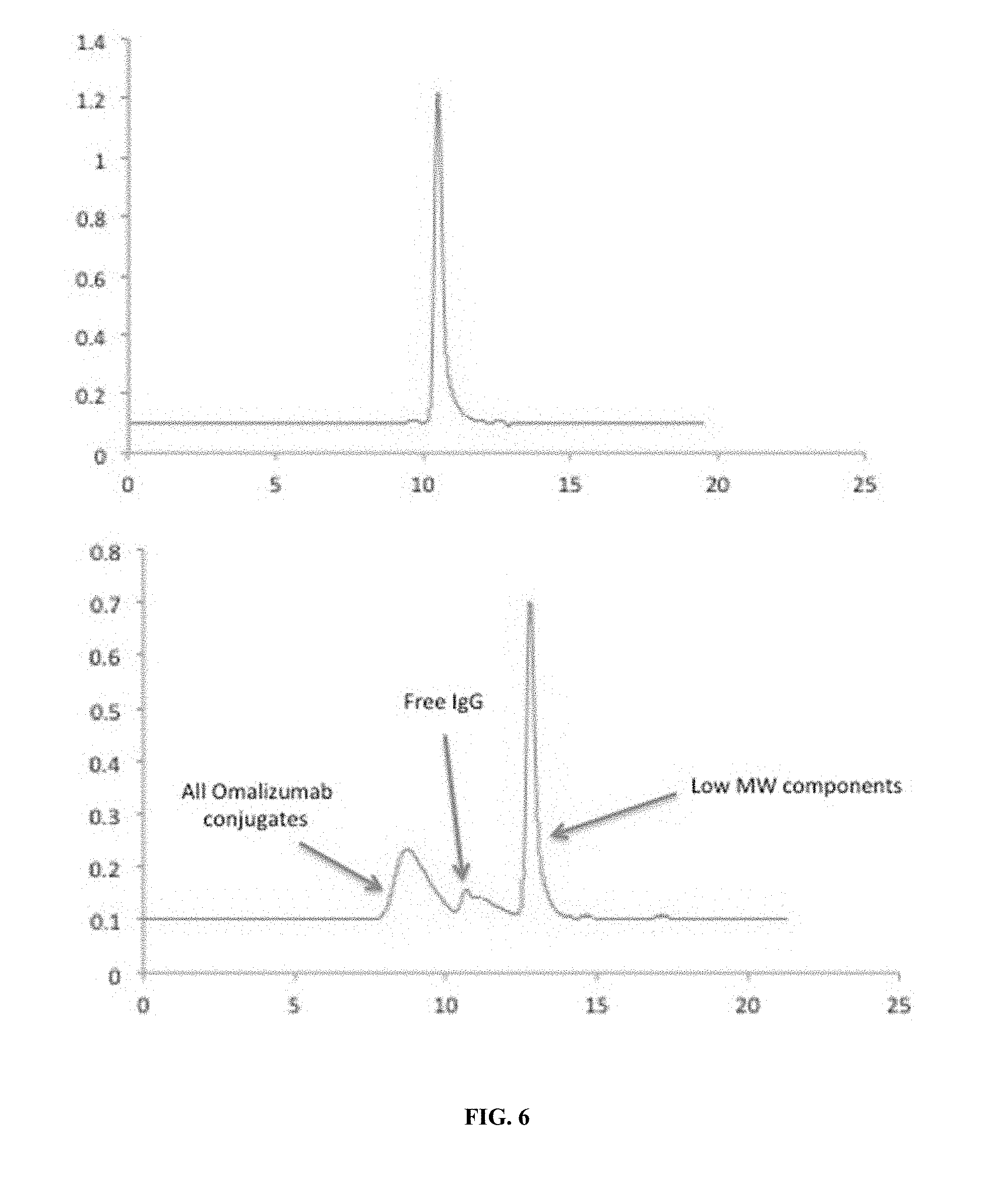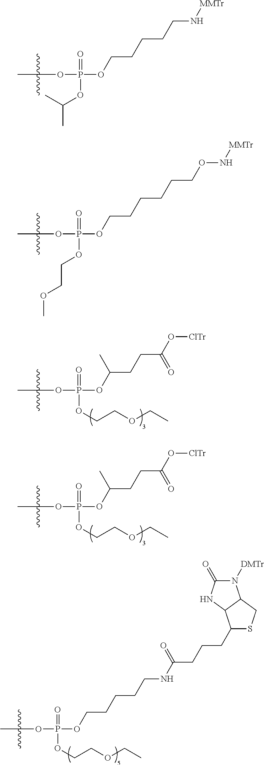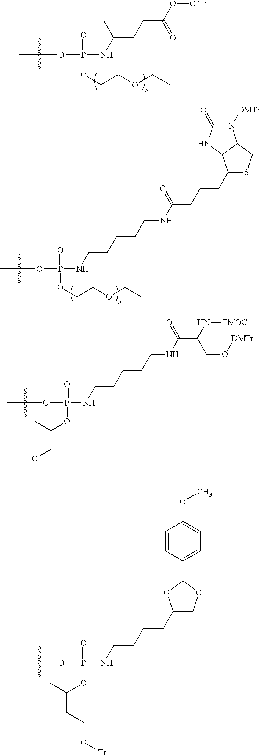 The second derivatization were performed as in Example 6a) using excess of the second reagent over PEG to insure quantitative conversion to the double functionalized product The final compound was analyzed by HPLC, but any preparative chromatography at this stage was not needed. The following describes methods used to introduce functional groups which were not stable in the presence of the phosphoramidite group. Diethylene glycol protected on one end with a DMTr group, and containing a H-phosphonate group at the other end, was synthesized from a tritylated diol by a standard PCl3/triazole method according to Garegg et al., The above H-phosphonate (3 eq.) and mPEG (1 eq.) were dried by repeated coevaporation with dry pyridine. The residue was dissolved in pyridine (10 mL/mmole) and treated with pivaloyl chloride (9 eq.). The mixture was stirred at room temperature for 2 hours and the reaction was quenched by addition of triethylammonium bicarbonate (TEAB) (1 M, 5 mL/mmole). The reaction mixture was concentrated and partitioned between dichloromethane and diluted TEAB. The organic phase was evaporated, the residue was dried by repeated coevaporation with toluene, and total PEG was purified by precipitation from diethyl ether. The isolated precipitate was filtered, dissolved in pyridine/carbon tetrachloride 2:1 and 1-amino-6-azidohexane (4 eq.) was added. The stirred mixture was left overnight at room temperature. The mixture was evaporated, coevaporated with water, and the residual material was treated with an aqueous ammonia solution (25%, 20 mL/mmole) for 4 hours at room temperature in order to cleave the residual non-oxidized H-phosphonate dimer. Ammonia was evaporated and the resulting crude product was purified by means of preparative reverse-phase chromatography. Final removal of the DMTr group and precipitation of the PEG gave the pure azido modified product. The following describes methods used to conjugate omalizumab with a modified PEG 20K polymer. Commercial PEG 20,000 (20K) (20 g, 1 mmol) was dried by repeated co-evaporation with toluene (3× 200 mL) followed by co-evaporation with dichlormethane (200 mL). The residue was dissolved in DCM and dimethylaminopyridine DMAP (0.2 mmol), dry triethylamine (5 mmol) and DMTrCl (1 mmol) were added. The mixture was stirred overnight at room temperature and all volatile matters were evaporated under reduced pressure. The solidified products were dissolved in a minimal volume of acetonitrile (25 mL) and cold (−20 deg C.) isopropanol (200 mL) was gradually poured into this solution with magnetic stirring. The crystallized mixture of PEG derivatives was vacuum filtered, washed with cold isopropanol, and dried overnight at reduced pressure. A 3 gram portion of this material was dissolved in 10 mL of water/EtOH (4:1) and applied on a manually packed Hamilton PRP-1 Polystyrene column (3×10 cm), washed with ethanol, and equilibrated with 20% EtOH/water containing 0.2% cone ammonia solution. In order to ensure that all non-derivatized PEG has been eluted out from the column, elution of all products was done using a gradient of ethanol in water: Solvent A: 20% EtOH+0.2% ammonia; solvent B: 100% EtOH+0.2% ammonia. The run was done very slowly and the starting, non-derivatized PEG came out at a solvent mixture of 22-25% of B, while the broad peak of mono tritylated product came within a solvent mixture of 46-55% of B. It should be noted that only the first part of this broad peak: at a solvent mixture of 46-50% of B was used in further synthetic steps. It implies, most probably, that reverse phase (RP) separation of tritylated PEG fractionates the PEG molecules according to their molecular wight, with larger molecules coming first. All runs were performed at the flow of 2 mL/min. The collected fractions were examined for the presence of PEG using a colorimetric test using a barium chloride and KI/iodine solution. This test together with the chromatogram showing the absorbance of the DMTr group indicated that the isolated product was the mono-DMTr protected PEG. This material was free of bis-tritylated product and free of non-derivatized PEG. The purity of the isolated material was confirmed by a separate HPLC analysis on a C-18 RP column. The product was concentrated to dryness, dissolved in a minimal amount of acetonitrile (1 mL), precipitated from diethyl ether (50 mL) and dried under vacuum. Mono-DMTr protected PEG (1.0 g, 0.05 mmol) was dried by double coevaporation with dry acetonitrile (2×30 mL) and previously synthesized amidite (See Example 3) that introduces NETS-ester function (0.25 mmol, 125 mg) was added followed by addition of tetrazol solution (0.1 M) in dry acetonitrile (13 mL, 1.3 mmol, 5 eq per amidite). The mixture was stirred at RT for 30 min and an oxidizing agent t-butyl hydrogen peroxide solution in dry toluene (1M, 2 mL, 8 eq) was added in a single portion. Stirring was continued for an additional 30 minutes and the volatile components were evaporated at reduced pressure. The residue was dissolved in 2 mL of acetonitrile and the non-solubilized tetrazole was spun down. The clear upper solution was transferred to a larger 50 mL Falcon tube and cold isopropanol (−20° C.) was gradually added causing crystallization of the PEG molecule. This material was spun down, washed again with cold isopropanol, and dried under vacuum (oil pump). The product was obtained in the form of white fluffy crystals. Conjugation of PEG to IgG omalizumab was performed following the methodology described in J. Decruex, R. Vanbever and, P. R. Crocker, Briefly, omalizumab (300 mg; SEQ ID NO:1) was dissolved in water (5 ml) and portionized into separate Sörsted tubes containing 15 mg of IgG each. One of the tubes was diluted with (PBS) phosphate buffer (0.2 M, pH 7.3) to 1 mL and placed on a NAP 10 desalting column previously equilibrated with the same buffer. The desalted protein was isolated with 1.5 mL of the buffer. To a portion of the desalted 