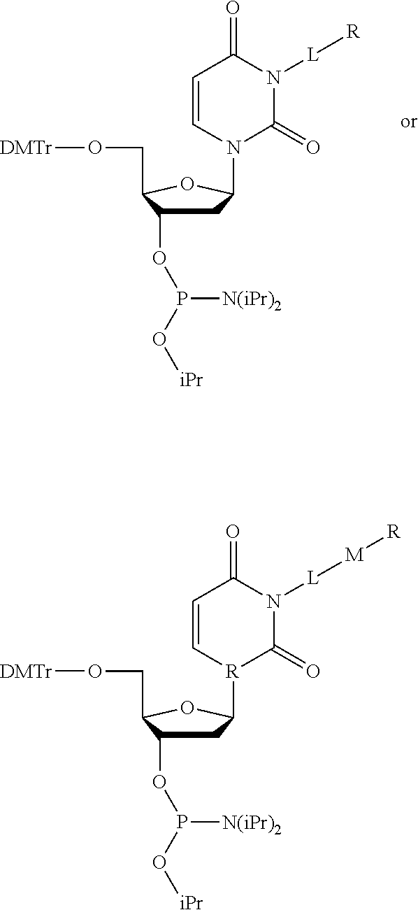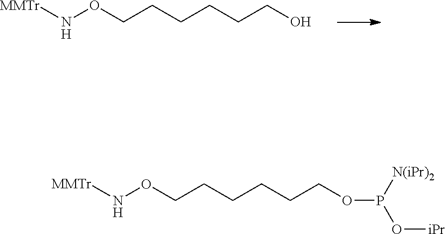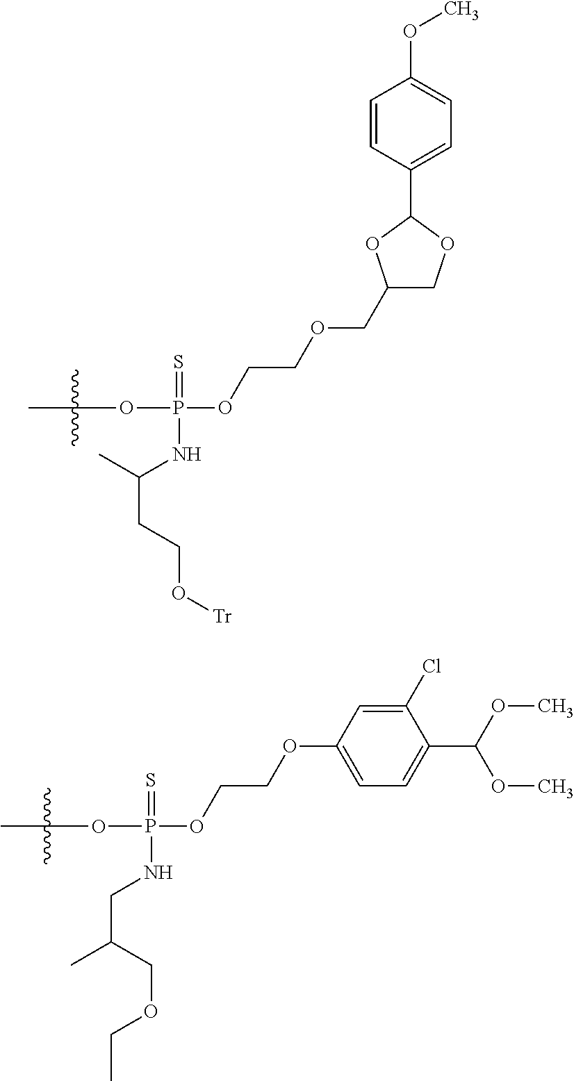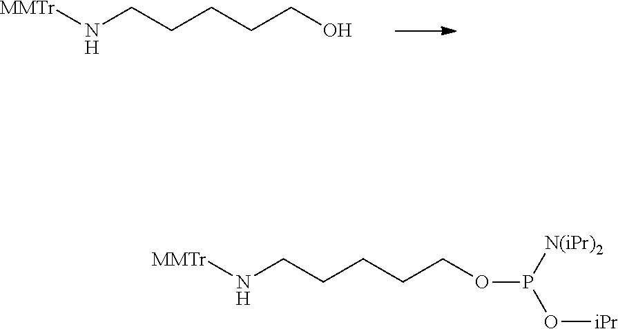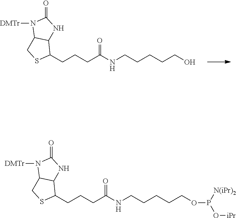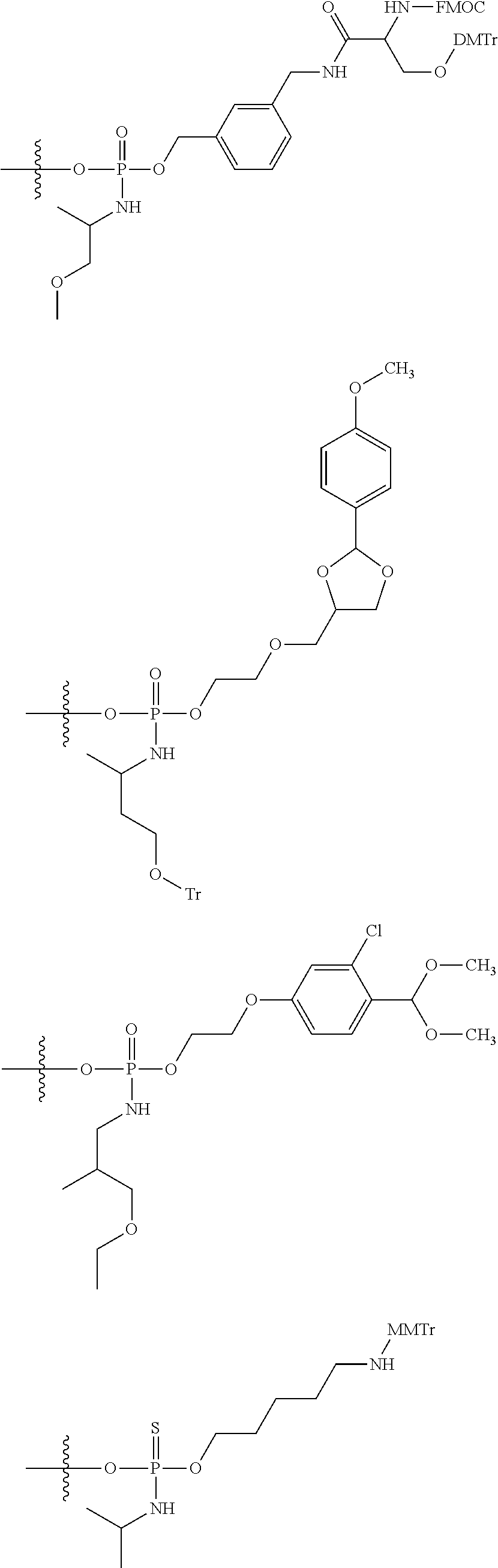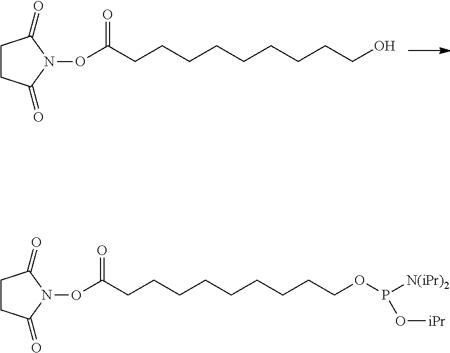 The second derivatization were performed as in Example 6a) using excess of the second reagent over PEG to insure quantitative conversion to the double functionalized product The final compound was analyzed by HPLC, but any preparative chromatography at this stage was not needed. The following describes methods used to introduce functional groups which were not stable in the presence of the phosphoramidite group. Diethylene glycol protected on one end with a DMTr group, and containing a H-phosphonate group at the other end, was synthesized from a tritylated diol by a standard PCl3/triazole method according to Garegg et al., The above H-phosphonate (3 eq.) and mPEG (1 eq.) were dried by repeated coevaporation with dry pyridine. The residue was dissolved in pyridine (10 mL/mmole) and treated with pivaloyl chloride (9 eq.). The mixture was stirred at room temperature for 2 hours and the reaction was quenched by addition of triethylammonium bicarbonate (TEAB) (1 M, 5 mL/mmole). The reaction mixture was concentrated and partitioned between dichloromethane and diluted TEAB. The organic phase was evaporated, the residue was dried by repeated coevaporation with toluene, and total PEG was purified by precipitation from diethyl ether. The isolated precipitate was filtered, dissolved in pyridine/carbon tetrachloride 2:1 and 1-amino-6-azidohexane (4 eq.) was added. The stirred mixture was left overnight at room temperature. The mixture was evaporated, coevaporated with water, and the residual material was treated with an aqueous ammonia solution (25%, 20 mL/mmole) for 4 hours at room temperature in order to cleave the residual non-oxidized H-phosphonate dimer. Ammonia was evaporated and the resulting crude product was purified by means of preparative reverse-phase chromatography. Final removal of the DMTr group and precipitation of the PEG gave the pure azido modified product. The following describes methods used to conjugate omalizumab with a modified PEG 20K polymer. Commercial PEG 20,000 (20K) (20 g, 1 mmol) was dried by repeated co-evaporation with toluene (3× 200 mL) followed by co-evaporation with dichlormethane (200 mL). The residue was dissolved in DCM and dimethylaminopyridine DMAP (0.2 mmol), dry triethylamine (5 mmol) and DMTrCl (1 mmol) were added. The mixture was stirred overnight at room temperature and all volatile matters were evaporated under reduced pressure. The solidified products were dissolved in a minimal volume of acetonitrile (25 mL) and cold (−20 deg C.) isopropanol (200 mL) was gradually poured into this solution with magnetic stirring. The crystallized mixture of PEG derivatives was vacuum filtered, washed with cold isopropanol, and dried overnight at reduced pressure. A 3 gram portion of this material was dissolved in 10 mL of water/EtOH (4:1) and applied on a manually packed Hamilton PRP-1 Polystyrene column (3×10 cm), washed with ethanol, and equilibrated with 20% EtOH/water containing 0.2% cone ammonia solution. In order to ensure that all non-derivatized PEG has been eluted out from the column, elution of all products was done using a gradient of ethanol in water: Solvent A: 20% EtOH+0.2% ammonia; solvent B: 100% EtOH+0.2% ammonia. The run was done very slowly and the starting, non-derivatized PEG came out at a solvent mixture of 22-25% of B, while the broad peak of mono tritylated product came within a solvent mixture of 46-55% of B. It should be noted that only the first part of this broad peak: at a solvent mixture of 46-50% of B was used in further synthetic steps. It implies, most probably, that reverse phase (RP) separation of tritylated PEG fractionates the PEG molecules according to their molecular wight, with larger molecules coming first. All runs were performed at the flow of 2 mL/min. The collected fractions were examined for the presence of PEG using a colorimetric test using a barium chloride and KI/iodine solution. This test together with the chromatogram showing the absorbance of the DMTr group indicated that the isolated product was the mono-DMTr protected PEG. This material was free of bis-tritylated product and free of non-derivatized PEG. The purity of the isolated material was confirmed by a separate HPLC analysis on a C-18 RP column. The product was concentrated to dryness, dissolved in a minimal amount of acetonitrile (1 mL), precipitated from diethyl ether (50 mL) and dried under vacuum. Mono-DMTr protected PEG (1.0 g, 0.05 mmol) was dried by double coevaporation with dry acetonitrile (2×30 mL) and previously synthesized amidite (See Example 3) that introduces NETS-ester function (0.25 mmol, 125 mg) was added followed by addition of tetrazol solution (0.1 M) in dry acetonitrile (13 mL, 1.3 mmol, 5 eq per amidite). The mixture was stirred at RT for 30 min and an oxidizing agent t-butyl hydrogen peroxide solution in dry toluene (1M, 2 mL, 8 eq) was added in a single portion. Stirring was continued for an additional 30 minutes and the volatile components were evaporated at reduced pressure. The residue was dissolved in 2 mL of acetonitrile and the non-solubilized tetrazole was spun down. The clear upper solution was transferred to a larger 50 mL Falcon tube and cold isopropanol (−20° C.) was gradually added causing crystallization of the PEG molecule. This material was spun down, washed again with cold isopropanol, and dried under vacuum (oil pump). The product was obtained in the form of white fluffy crystals. Conjugation of PEG to IgG omalizumab was performed following the methodology described in J. Decruex, R. Vanbever and, P. R. Crocker, Briefly, omalizumab (300 mg; SEQ ID NO:1) was dissolved in water (5 ml) and portionized into separate Sörsted tubes containing 15 mg of IgG each. One of the tubes was diluted with (PBS) phosphate buffer (0.2 M, pH 7.3) to 1 mL and placed on a NAP 10 desalting column previously equilibrated with the same buffer. The desalted protein was isolated with 1.5 mL of the buffer. To a portion of the desalted 