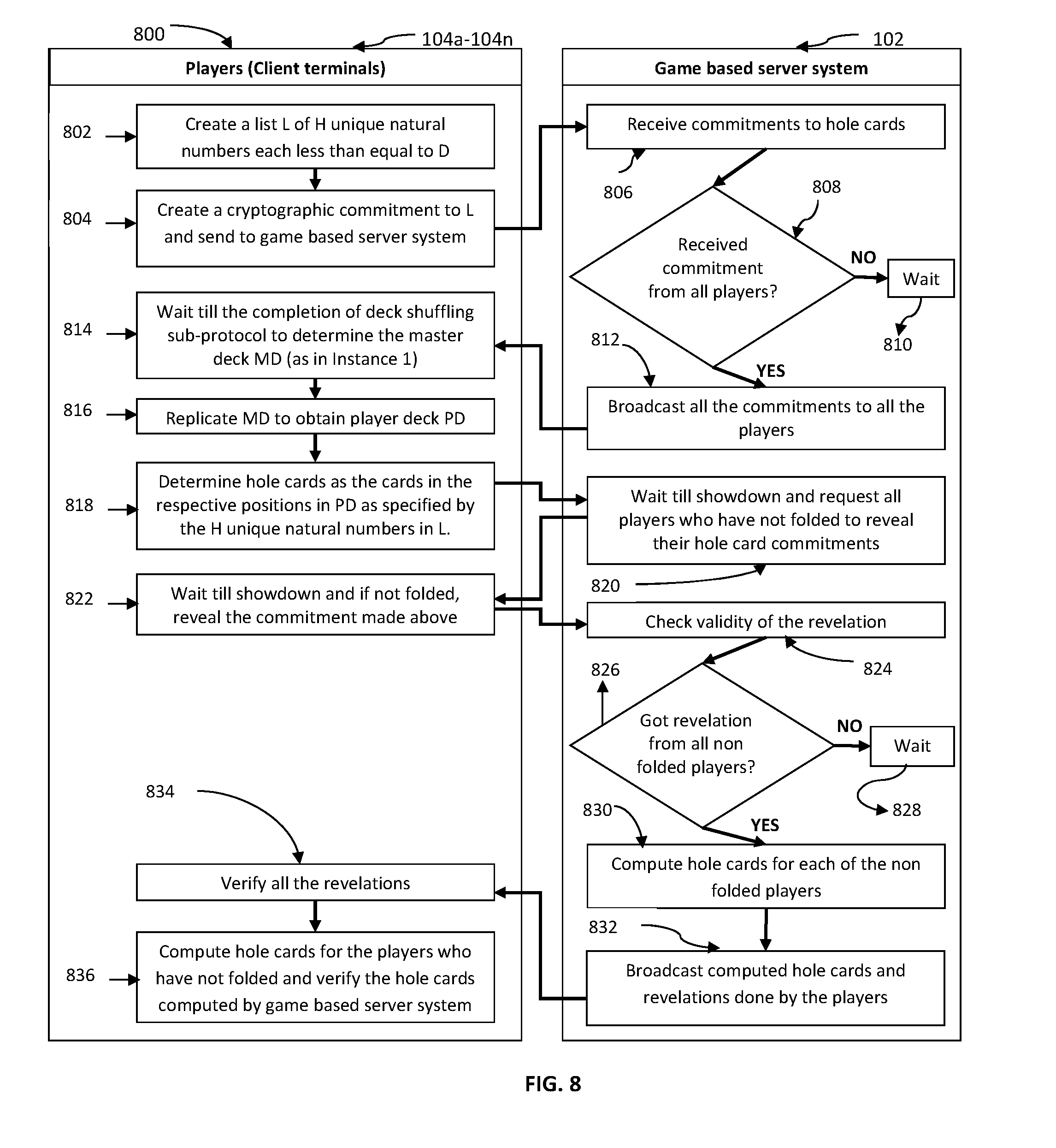 FIG. 8 is a flow diagram 800 depicting a sub-protocol for a player to select H hole cards, from its player deck PD having D cards, with provision for showdown, according to an exemplary embodiment of the present disclosure. The process starts at 802 where a list L of H unique natural numbers each less than or equal to D is created independently by each of the players 104a-104n. A cryptographic commitment to L is created and sent to game based server system 102 at 804. Commitments to hole cards are received by game based server system 102 at 806. A receipt of commitment from all players 104a-104n is enquired at 808. If no, then there is a wait at 810. If yes, then all the commitments to all the players 104a-104n are broadcast at 812. There is a wait till the completion of deck shuffling sub-protocol (as in Instance 1) to determine the master deck MD at 814. MD is replicated by players to obtain their player deck PD at 816. Determination of the hole cards as the cards in the respective positions in PD as specified by the H unique numbers in L is done at 818. The 820 proceeds to game based server system 102, where it waits till showdown and subsequently requests all players 104a-104n who have not folded to reveal their hole card commitments at 820. Further at 822, players 104a-104n wait till showdown and if not folded, reveal their respective commitments made above. The validity of the revelation is checked at 824 by game based server system 102 followed by an enquiry about the receipt of revelations from all the non-folded players 104a-104n at 826. If no, then there is a wait at 828, else hole cards are computed for each of the non-folded players 104a-104n at 830. The computed hole cards are broadcast, along with the revelations done by players 104a-104n who have not folded, at 832. All the revelations are verified at 834 by all the players 104a-104n. And finally, at 836, the hole cards are computed for the players 104a-104n who have not folded and verified against the hole cards computed and broadcast by game based server system 102 previously at steps 830 and 832 respectively.