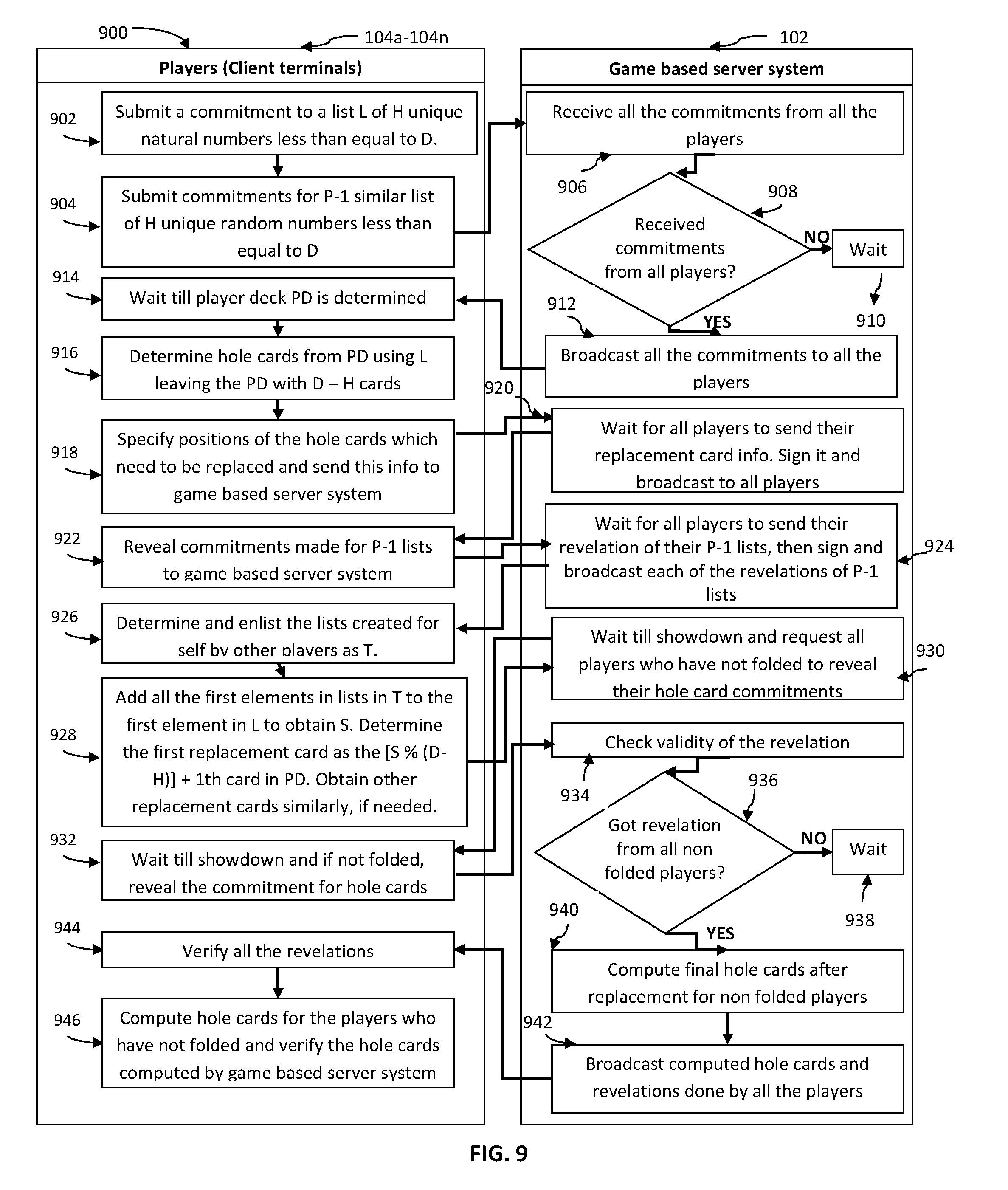 There is a wait till showdown by game based server system 102 and then it requests all players 104a-104n who have not folded to reveal their hole card commitments at 930. There is a further wait till showdown by players 104a-104n and if not folded, they reveal the commitment for hole cards at 932. The validity of the revelation is checked at 934. Further the receipt of revelations from all non-folded players 104a-104n is enquired at 936 if not then there is a wait at 938 and if yes, then computation of final hole cards after replacement for each of the players 104a-104n who have not folded takes place at 940. Further at 942, a broadcast of computed hole cards and revelations done by all the players 104a-104n is done by the game based server system 102. All the revelations are verified at 944 by all the players 104a-104n, and finally hole cards are computed for the players 104a-104n who have not folded and verification against the hole cards computed by game based server system 102 is done at 946.