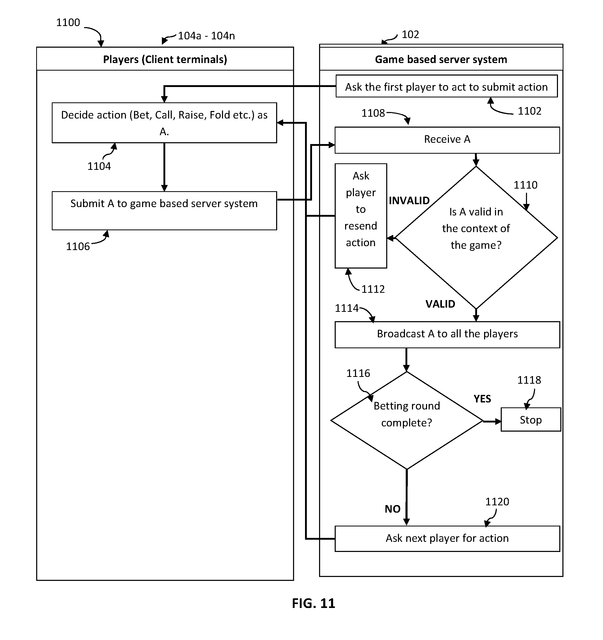 FIG. 11 is a flow diagram 1100; depicting a sub-protocol to carry out a round of betting in a verifiable and provably fair manner, according to an exemplary embodiment of the present disclosure. The player 104a-104n to act first in the betting round is asked by the game based server system 102 to submit an action at 1102. The first player 104a-104n who needs to act commits to their action (Bet, Call, Raise, Check, Fold etc.) by deciding upon a valid action given the rules and current context of the game, and sends the action to the game based server system 102. An action (Bet, Call, Raise, Check, Fold etc.) is decided as A by the player 104a-104n to act first in the betting round at 1104. Further, A is sent to game based server system 102 at 1106, and received by game based server system 102 at 1108, which enquires the validity of A in the context of the game at 1110. In case of invalidity, at 1112, the player 104a-104n is asked to resend the message. In case of validity, A is broadcast to all the players 104a-104n at 1114. Further, at 1116, game based server system 102 decides whether the betting round is complete according to the rules of the game. If yes, then the process stops at 1118, else the next player 104a-104n is asked for an action at 1120 and the process resumes at 1104.