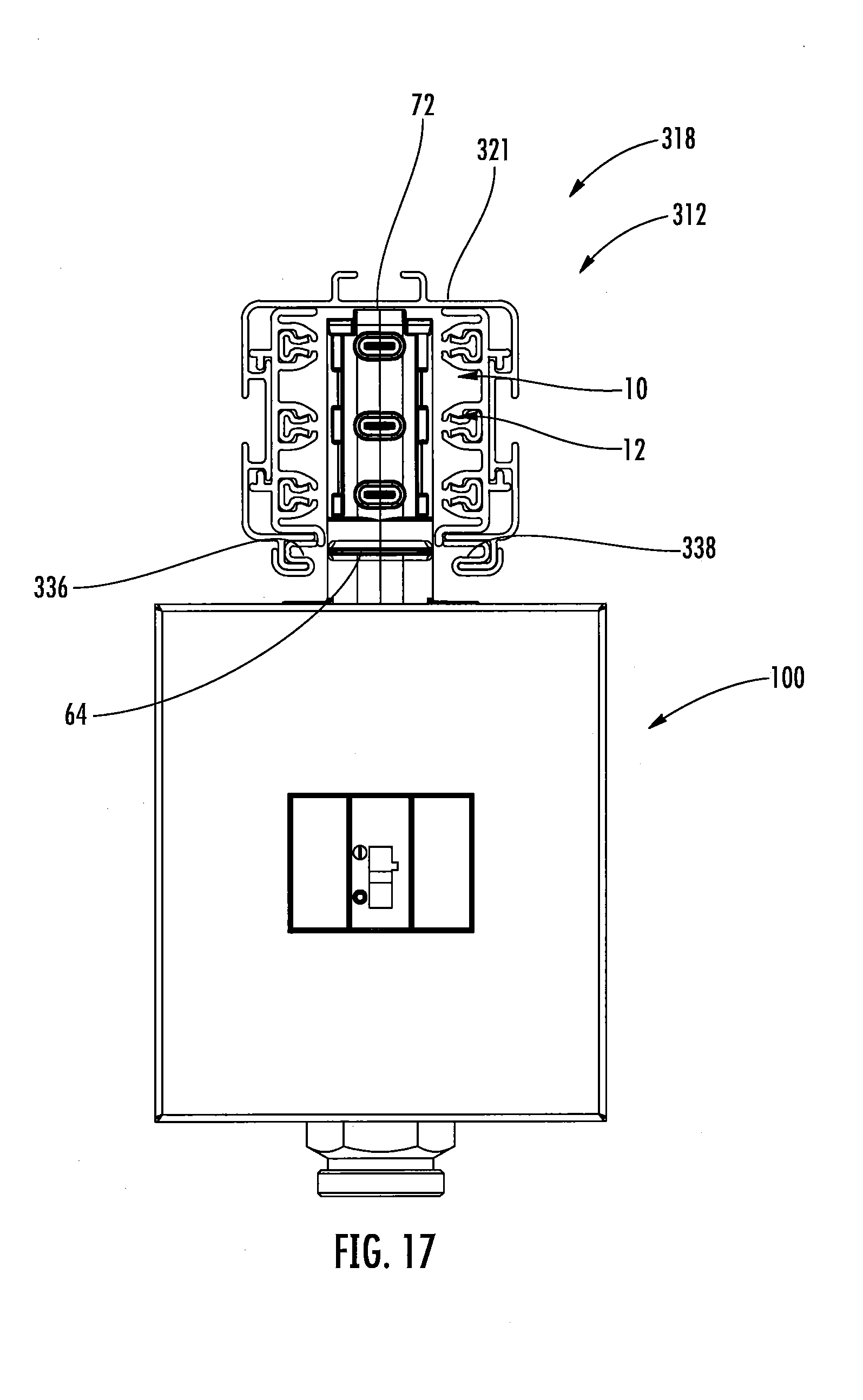 1. (canceled) 2. A plug-in device for use with a busway system comprising a busway housing defining a longitudinal axis and having an opening therein defined by at least one wall, the plug-in device comprising: