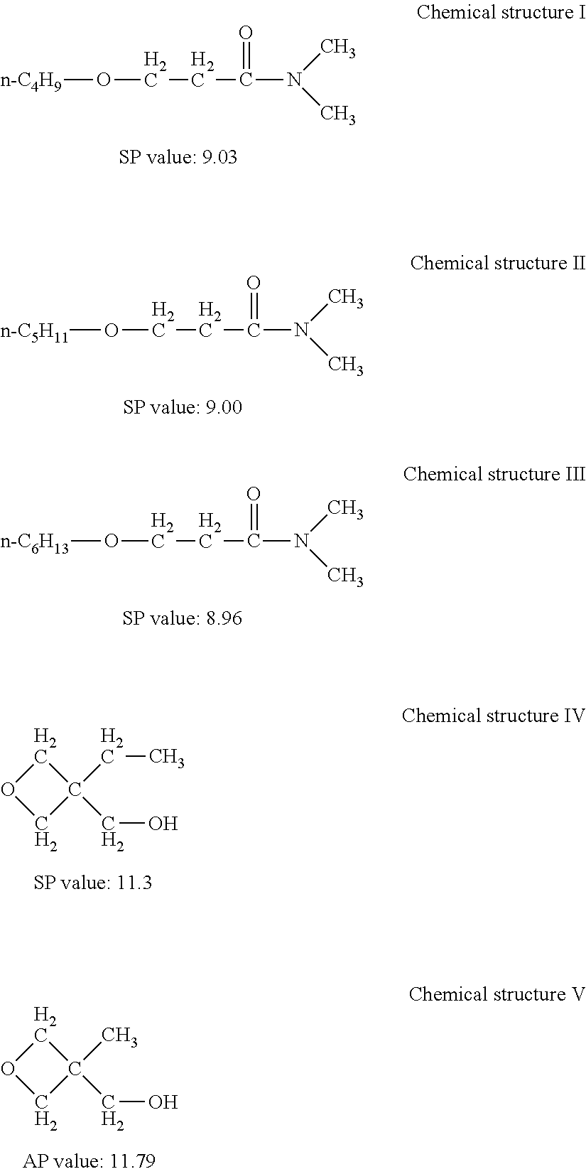 Under an environment at 22.5 to 23.5° C. and 45 to 55 percent RH, using an image forming apparatus (IPSiO GXe-5500, manufactured by RICOH CO., LTD.), the drive voltage of the piezo element was changed to discharge the same amount of ink in order to attach the same amount of the ink onto OK topcoat+ (weight: 104.7 g/m2, OJI PAPER CO., LTD.) as recording medium.