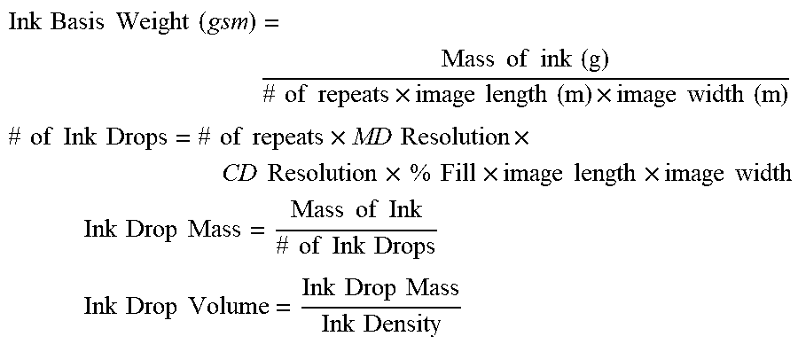 InkBasisWeight(gsm)=Massofink(g)#ofrepeats×imagelength(m)×imagewidth(m)#ofInkDrops=#ofrepeats×MDResolution×CDResolution×%Fill×imagelength×imagewidthInkDropMass=MassofInk#ofInkDropsInkDropVolume=InkDropMassInkDensity