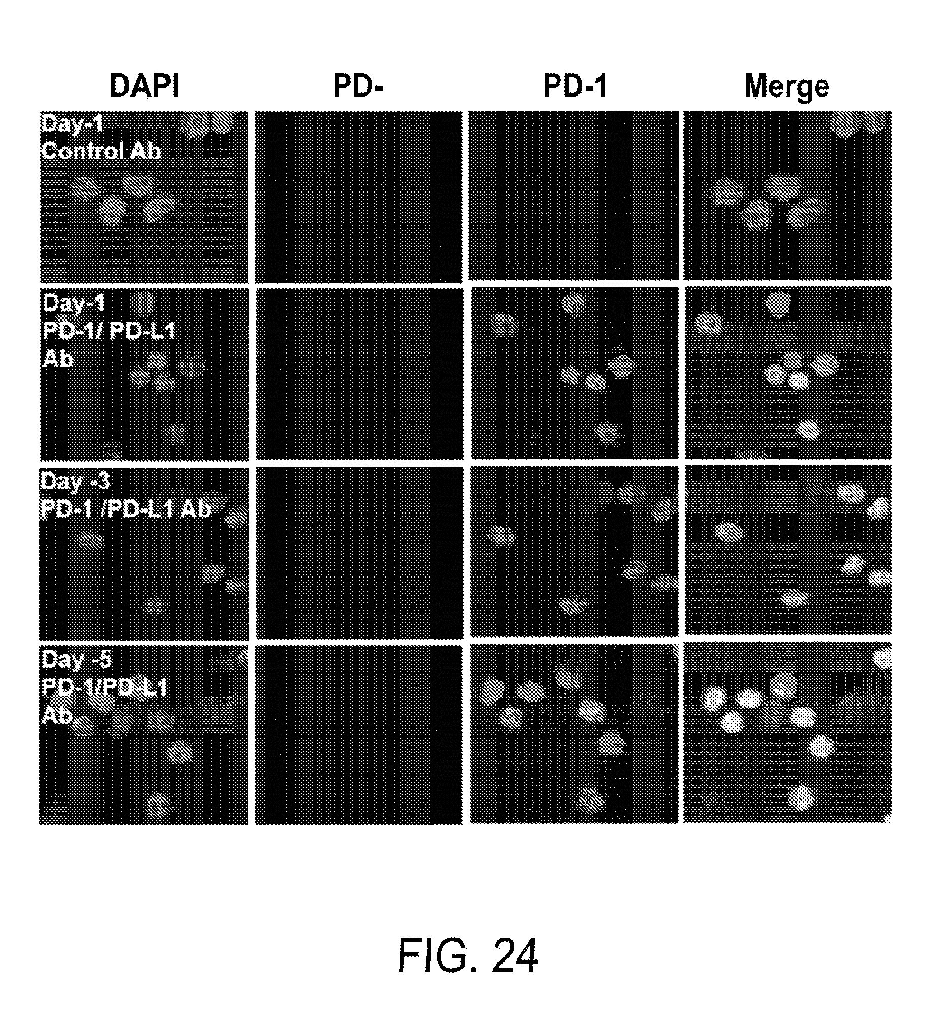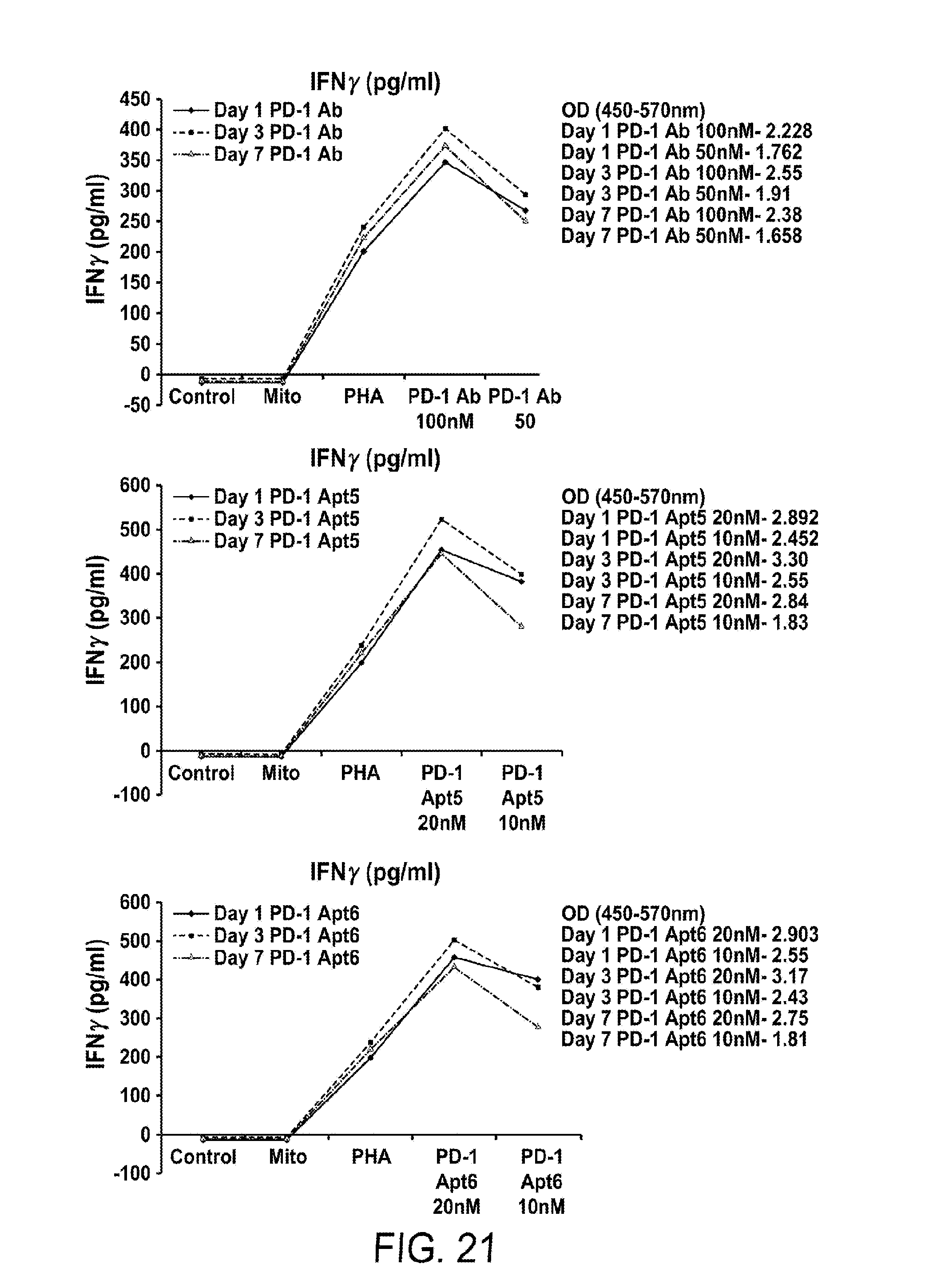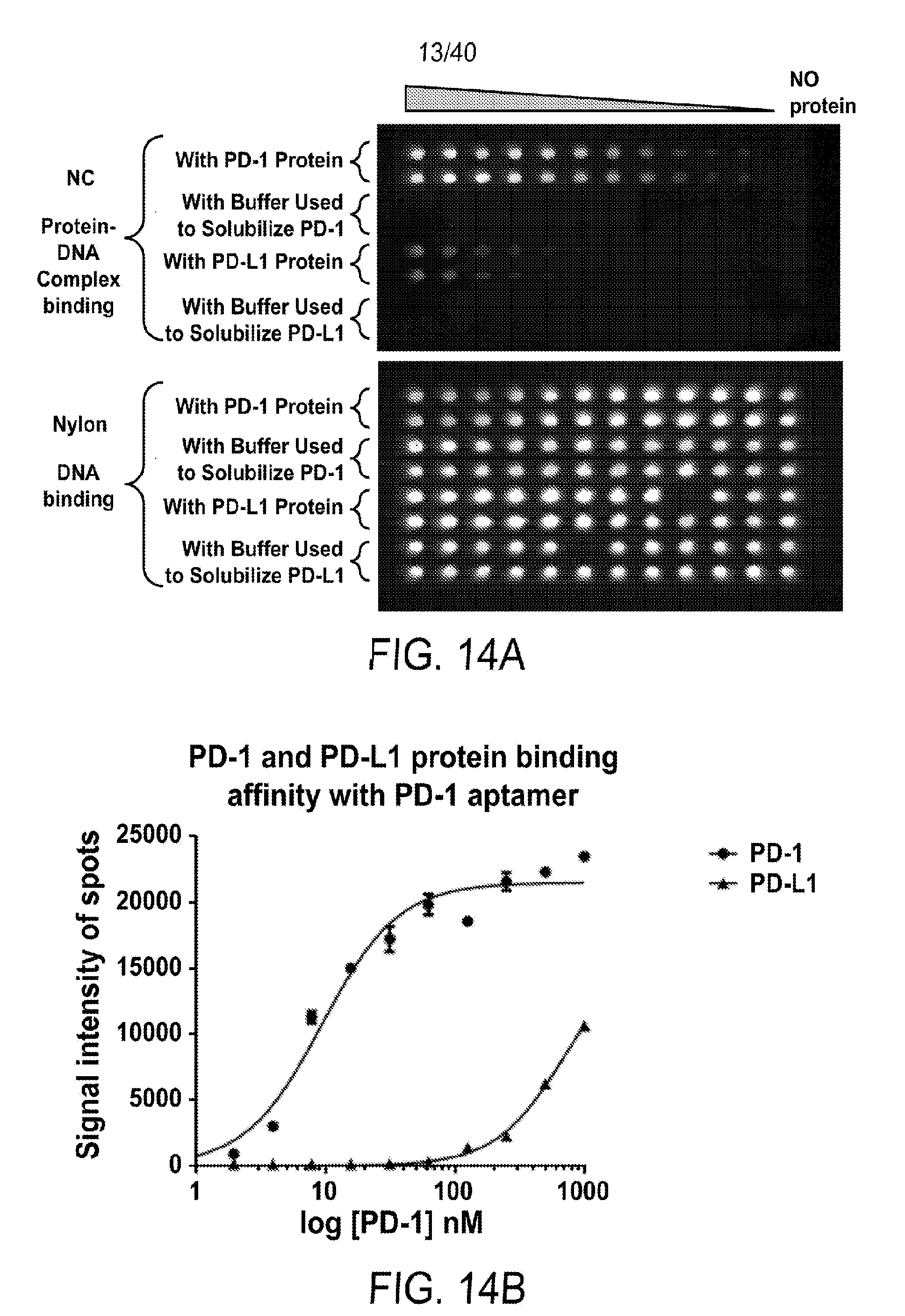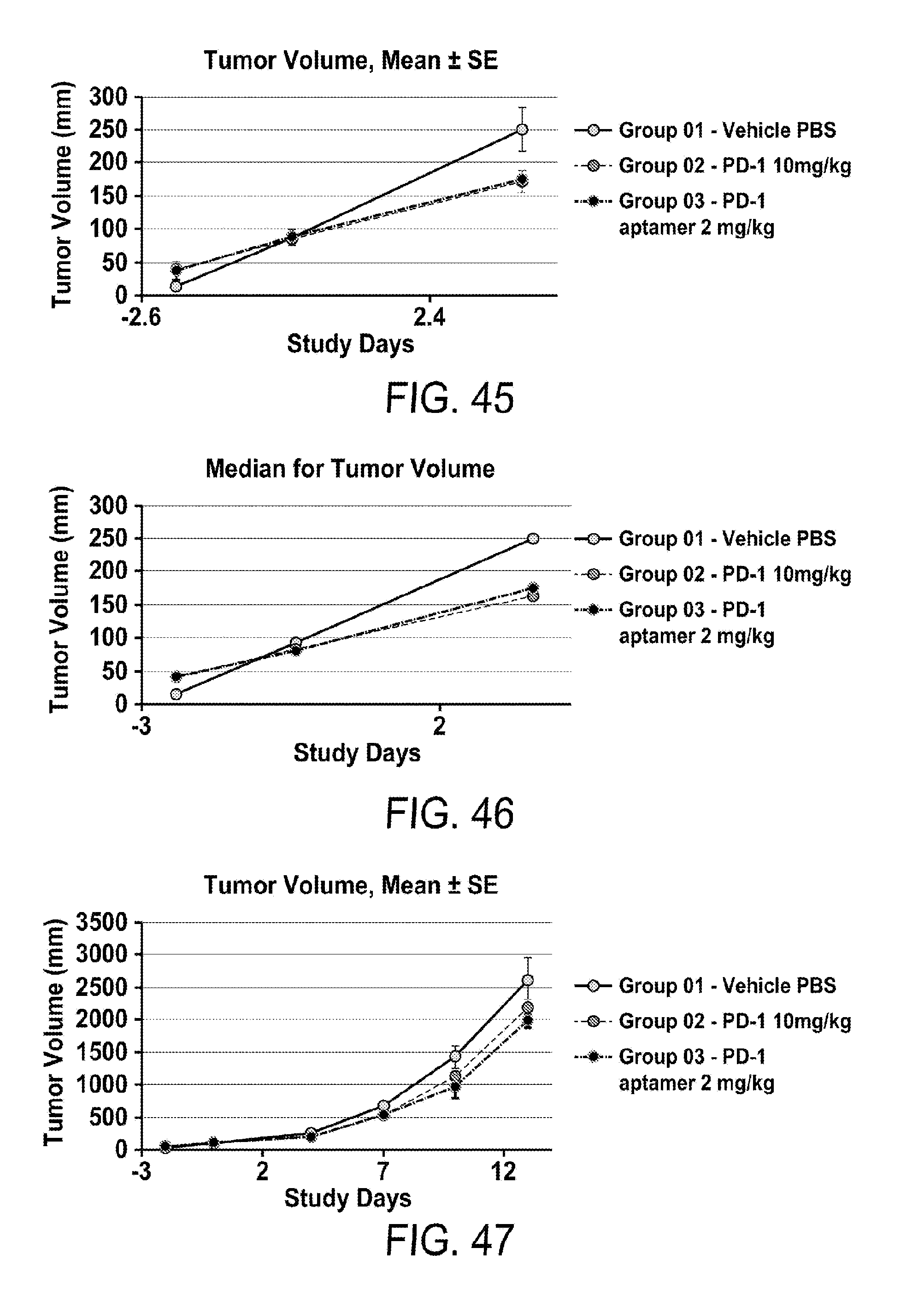 PD-1 and PD-L1 Overexpression is Associated with Poor Survival in Cancer Patients First, the hematological cancer (HC) dataset of The Cancer Genome Atlas (TCGA) database was analyzed to determine the association of immune-checkpoint PD-1 and its ligand PD-L1 expression with HC patient survival ( Identification of Human Endogenous PD-1 Binding DNA Aptamers In vitro-based SELEX was performed to identify DNA aptamers which specifically recognize the endogenous human PD-1 (hPD-1) by screening a random DNA library against endogenously expressed immuno-precipitated PD-1 from leukemic cells lines HEL 92.1.7 and KG-1 using specific PD-1 antibody ( Clustal X multiple sequence analysis of converged sequences from rounds 6 and 7 revealed a highly repetitive element with “T and G”s which were observed in all present converged sequences ( Anti-PD-1 DNA Aptamers are Stable The highest enriched best represented biotinylated anti PD-1 DNA aptamer sequences were chosen for further evaluation. Structural predictions performed using M fold algorithm on selected aptamer sequences has revealed a complex hairpin-bulge folding state. The folded aptamer sequences with the optimal and suboptimal structures of minimum Gibbs free energy of −1.5 to −4.0 kcal/mol was observed ( Anti-PD-1 DNA Aptamers Bind with Nanomolar Affinity to Purified Overexpressed PD-1 Protein and Picomolar Affinity to Endogenous PD-1 Protein Present in Total Cell Extract Biolayer interferometry was used to generate binding kinetics data with purified PD-1 protein and total cell lysate (HEL and KG-1 cell line) defined the dissociation constant of anti PD1-DNA aptamer as 5 nM and 500 pM ( Competition Binding Assay of Anti-PD-1 DNA Aptamer Binding Sites Followed by Anti PD-1 Antibody. To further validate whether anti PD-1 DNA aptamers and anti PD-1 antibody compete for the same PD-1 binding sites by flow cytometry, immunofluorescence and gel-shift assays were performed. To determine the competition between PD-1 DNA aptamer and antibody for PD-1 binding sites HEL 92.1.7 and KG-1 cell lines incubated with 100 nM and 10 nM of carboxyfluorescein (FAM) labeled PD-1 specific aptamers followed by 500 nM and 50 nM of PD-1 antibody for 15 min in 50 μl of binding buffer. Mean fluorescence intensity by flow cytometry revealed in the presence of antibody the aptamer binding affinity is down regulated suggesting both antibody and antibody share at least similar PD-1 binding sites ( Biological Activity of Anti PD-1 DNA Aptamer in PD-1 and its Ligand PD-L1 Interaction Using in vitro Cell-Based Assay The functionality of anti PD-1 DNA aptamer was validated using PD-1: PD-L1 cell based assay. Jurkat T cells expressing PD-1/NFAT were used as effector cells whereas HEK293 cells over-expressing an engineered T cell receptor (TCR) along with PD-L1 are used as activator cells. Co-culturing of these two cells (effector+TCR activator) results in expression of the NFAT luciferase reporter whereas (effector+TCR activator+PD-L1) results in prevention of TCR activation and hence suppressing the NFAT-responsive luciferase activity. Specific inhibition relief was observed when treated with anti-PD-1 DNA aptamer in this combination (effector+TCR activator+PD-L1) and anti PD-1 neutralizing Ab were used as positive control ( In vitro biological activity of anti PD-1 DNA aptamer by MLR assay In order to assess the kinetics of the MLR response in the presence of anti PD-1 DNA aptamer to promote T-cell activation, proliferation assays were performed. Serial measurement of BrdU incorporation was demonstrated after 5 day stimulation. Maximal lymphocyte proliferation was seen around day 1 after 5 day stimulation in the presence of anti PD-1 DNA aptamer (concentration of 20 nM/ml and 10 nM/ml) ( Biotinylated Anti PD-1 DNA Aptamer as Diagnostic Agent for PD-1 in Human Tissues with Immunohistochemistry The PD-1 aptamer was examined on human tonsil and lung cancer tissues using IHC-DAB method. This determines the best working condition and dilution of this PD-1 apatmer. The best PD-1 aptamer positive staining was found at 1:1000 nM concentration with IHC-Tek Epitope Retrieval steam pretreatment ( Target Cell Lysis Activity of Anti PD-1 DNA Aptamer Using Incucyte Annexin V-Based Assay The functionality of anti PD-1 DNA aptamer was also validated using target cell lysis analysis by Incucyte. HEL.92.1.7 cells were used as target cells whereas PBMCs with T cell subpopulation were used as effector cells. Co-culturing of these two cells (effector+target cells) in the presence of Annexin V results in the mean total green object area. In the presence of PD-1 aptamer, an increase is seen in green object area comparable to presence of PD-1 antibody and a decrease is seen in green object area in control conditions. These results show that anti PD-1 DNA aptamer promotes T cell activation in lower concentration than the antibody ( PEGlyated Anti PD-1 DNA Aptamer (Anti-PD-1-p10) Exhibits Improved Pharmacokinetics Conjugation of polyethylene glycol (PEG) to the biomolecules like aptamers (nucleic acids), proteins and vaccines is one of the most common and important strategy for improving the half-life and stability of these molecules in the blood and also to protect these molecules from recognition of immune cells as well as renal and hepatic clearance (Yoshihiro Morita et al Molecular Therapy-Nucleic acids (2016) 5, e399) ( Anti PD1 Aptamer-p10 Efficacy is Comparable to Anti-PD-1 Antibody Anti PD1 aptamer efficacy was examined for comparison to the anti PD-1 antibody using HEL92.1.7 model to engraft in humanized NSG ( Unless defined otherwise, all technical and scientific terms used herein have the same meanings as commonly understood by one of skill in the art to which the disclosed invention belongs. Publications cited herein and the materials for which they are cited are specifically incorporated by reference. Those skilled in the art will recognize, or be able to ascertain using no more 