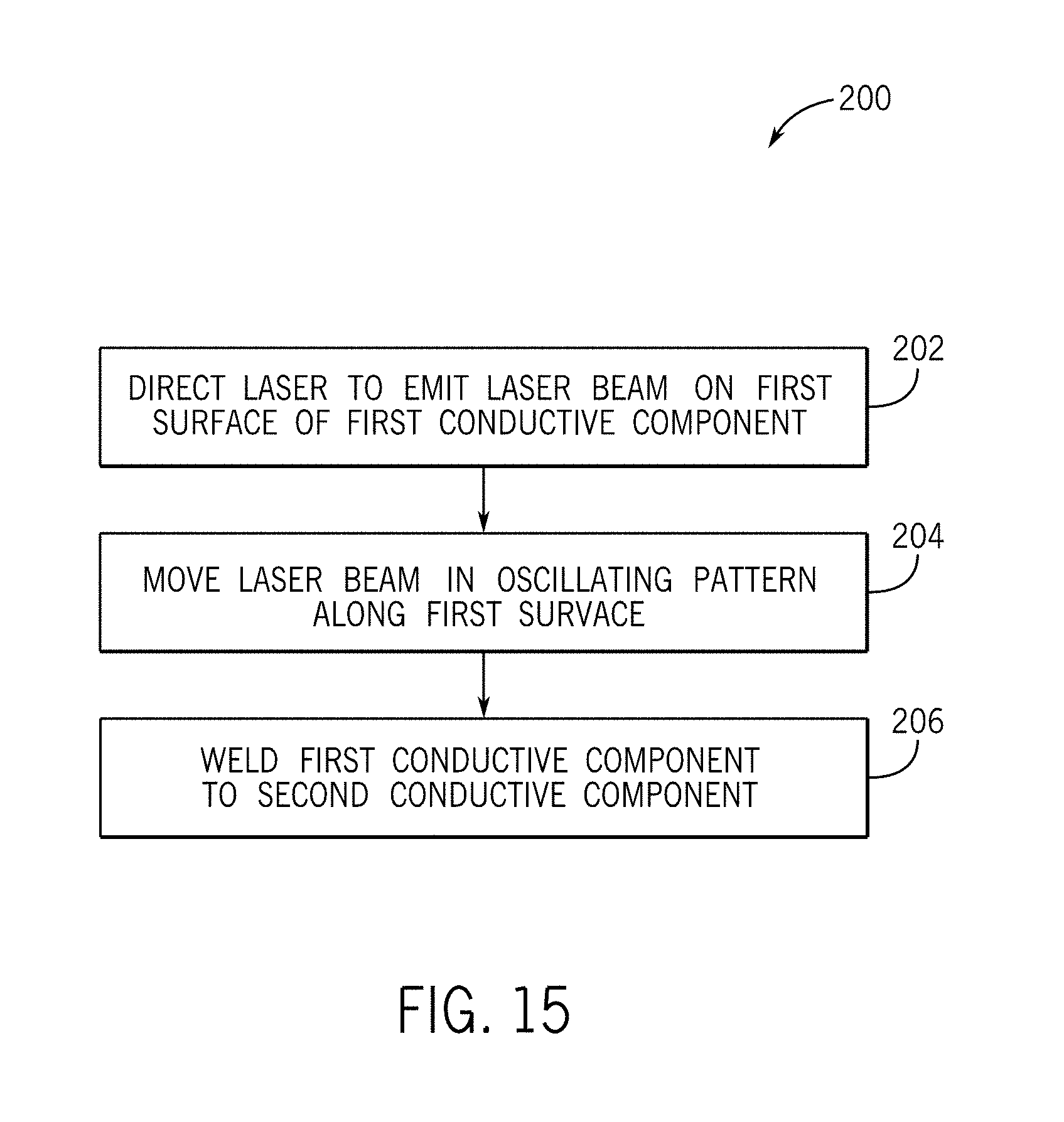 FIG. 15 illustrates an embodiment of a flow chart 200 of a method for controlling the laser 50 to produce the oscillation pattern 60. At block 202, the controller 62 may send a signal to the laser actuator 52 to direct the laser 50 to emit the laser beam 54 onto a first surface of the first battery module component 64. For example, the controller 62 may instruct an actuator to close a circuit that supplies power to the laser 50, thereby enabling the laser 50 to emit the laser beam 54. At block 204, the controller 62 may send a signal to the laser actuator 52 to move the laser beam 54 along the first surface of the first battery module component 64 in the oscillating pattern 60. Accordingly, at block 206, the laser beam 54 moves along the first surface of the battery module component to weld the first battery module component 64 to the second battery module component 66 (e.g., via a lap weld). In certain embodiments, the controller 62 is configured to adjust a power density of the laser beam 54. For example, when the movement of the laser beam 54 causes it to be closer to a surface of the first component 64 and/or the second component 66 for a portion of the oscillation period, the controller 62 may adjust the power density to coincide with the change in distance of the laser from the surface.