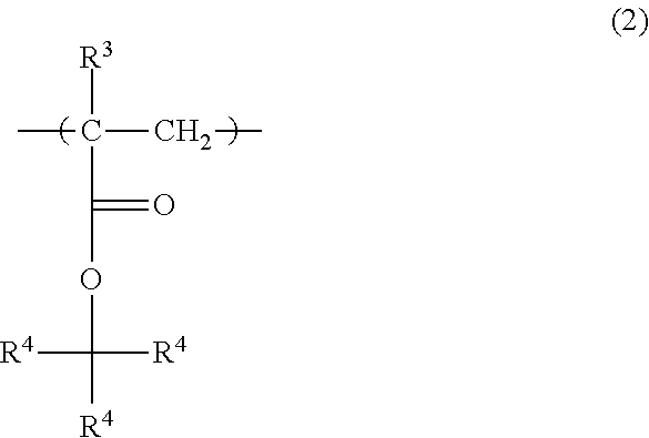 A monomer solution was prepared by dissolving 53.93 g (50 mol %) of the monomer (M-7), 35.38 g (40 mol %) of the monomer (M-1), and 10.69 g (10 mol %) of the monomer (M-8) in 200 g of 2-butanone, and further adding 5.58 g of dimethyl 2,2′-azobis(2-methylpropionate). On the other hand, 100 g of 2-butanone was charged into a 500-mL three-necked flask and nitrogen was purged for 30 minutes. After purging nitrogen to the flask, the content was heated to 80° C. while stirring and the above monomer solution was added dropwise using a dropping funnel over three hours. The initiation of the addition was set to a polymerization starting time and polymerization was carried out for six hours. After the polymerization, the polymer solution was cooled with water to a temperature of 30° C. or lower and was poured into 2,000 g of methanol. A white precipitate produced was collected by filtration. The white powder collected by filtration was washed twice with 400 g of methanol in a slurry state, filtered again, and dried at 50° C. for 17 hours to obtain a polymer in the form of white powder (74 g, yield 74%). The polymer was a copolymer having Mw of 6,900, Mw/Mn=1.70 and mol % ratio of the repeating units originating from the monomer (M-7), the monomer (M-1) and the monomer (M-8) determined by13C-NMR analysis of 53.0:37.2:9.8 (mol %). This polymer is indicated as resin (B-1). The content of low-molecular weight compounds originating from the monomers in the resin (B-1) was 0.03% by weight based on 100% by weight of the polymer. A monomer solution was prepared by dissolving 55.44 g (50 mol %) of the monomer (M-7), 33.57 g (40 mol %) of the monomer (M-9), and 10.99 g (10 mol %) of the monomer (M-8) in 200 g of 2-butanone, and further adding 5.74 g of dimethyl 2,2′-azobis(2-methylpropionate). On the other hand, 100 g of 2-butanone was charged into a 500-mL three-necked flask and nitrogen was purged for 30 minutes. After purging nitrogen to the flask, the content was heated to 80° C. while stirring and the above monomer solution was added dropwise using a dropping funnel over three hours. The initiation of the addition was set to a polymerization starting time and polymerization was carried out for six hours. After the polymerization, the polymer solution was cooled with water to a temperature of 30° C. or lower and was poured into 2,000 g of methanol. A white precipitate produced was collected by filtration. The white powder collected by filtration was washed twice with 400 g of methanol in a slurry state, filtered again, and dried at 50° C. for 17 hours to obtain a polymer in the form of white powder (72 g, yield 72%). The polymer was a copolymer having Mw of 9,100, Mw/Mn=1.56 and mol % ratio of the repeating units originating from the monomer (M-7), the monomer (M-9) and the monomer (M-8) determined by13C-NMR analysis of 52.2:38.1:9.7 (mol %). This polymer is indicated as resin (B-2). The content of low-molecular weight compounds originating from the monomers in the resin (B-2) was 0.02% by weight based on 100% by weight of the polymer. A monomer solution was prepared by dissolving 41.32 g (41 mol %) of the monomer (M-7), 44.63 g (42 mol %) of the monomer (M-11), and 14.05 g (17 mol %) of the monomer (M-12) in 200 g of 2-butanone, and further adding 5.74 g of dimethyl 2,2′-azobis(2-methylpropionate). On the other hand, 100 g of 2-butanone was charged into a 500-mL three-necked flask and nitrogen was purged for 30 minutes. After purging nitrogen to the flask, the content was heated to 80° C. while stirring and the above monomer solution was added dropwise using a dropping funnel over three hours. The initiation of the addition was set to a polymerization starting time and polymerization was carried out for six hours. After the polymerization, the polymer solution was cooled with water to a temperature of 30° C. or lower and was poured into 2,000 g of methanol. A white precipitate produced was collected by filtration. The white powder collected by filtration was washed twice with 400 g of methanol in a slurry state, filtered again, and dried at 50° C. for 17 hours to obtain a polymer in the form of white powder (72 g, yield 72%). The polymer was a copolymer having Mw of 5,900, Mw/Mn=1.60 and mol % ratio of the repeating units originating from the monomer (M-7), the monomer (M-11) and the monomer (M-12) determined by13C-NMR analysis of 41.1:42.3:16.6 (mol %). This polymer is indicated as resin (B-3). The content of low-molecular weight compounds originating from the monomers in the resin (B-3) was 0.1% or less by weight based on 100% by weight of the polymer. A monomer solution was prepared by dissolving 39.36 g (40 mol %) of the monomer (M-7), 5.65 g (7 mol %) of the monomer (M-1), and 54.99 g (53 mol %) of the monomer (M-11) in 200 g of 2-butanone, and further adding 6.54 g of dimethyl 2,2′-azobis(isobutylonitrile). On the other hand, 100 g of 2-butanone was charged into a 500-mL three-necked flask and nitrogen was purged for 30 minutes. After purging nitrogen to the flask, the content was heated to 80° C. while stirring and the above monomer solution was added dropwise using a dropping funnel over three hours. The initiation of the addition was set to a polymerization starting time and polymerization was carried out for six hours. After the polymerization, the polymer solution was cooled with water to a temperature of 30° C. or lower and was poured into 2,000 g of methanol. A white precipitate produced was collected by filtration. The white powder collected by filtration was washed twice with 400 g of methanol in a slurry state, filtered again, and dried at 50° C. for 17 hours to obtain a polymer in the form of white powder (75 g, yield 75%). The polymer was a copolymer having Mw of 3,700, Mw/Mn=1.40 and mol % ratio of the repeating units originating from the monomer (M-7), the monomer (M-1) and the monomer (M-11) determined by13C-NMR analysis of 41.1:6.9:52.0 (mol %). This polymer is