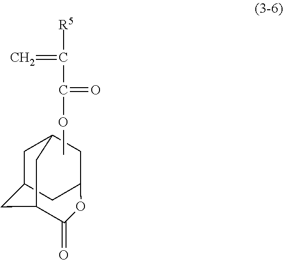 wherein R3represents hydrogen atom, methyl group or a trifluoromethyl group, and R4individually represents a monovalent alicyclic hydrocarbon group having 4 to 20 carbon atoms or a derivative thereof, or a linear or branched alkyl group having 1 to 4 carbon atoms.