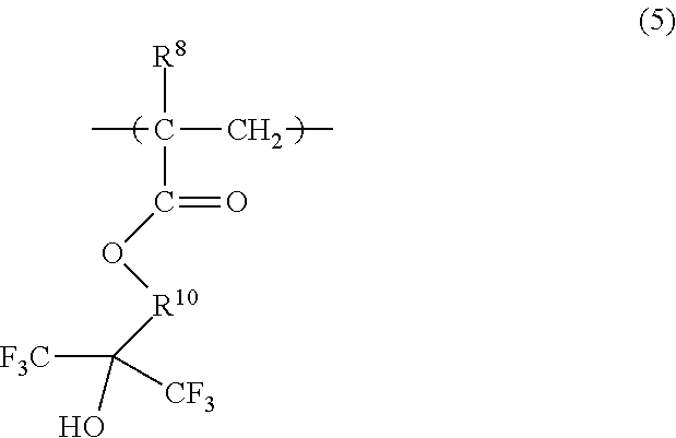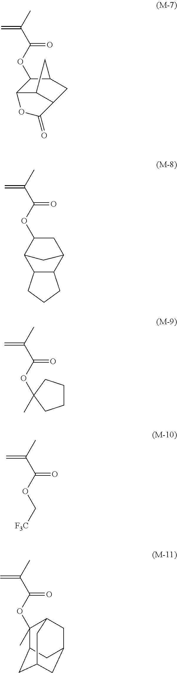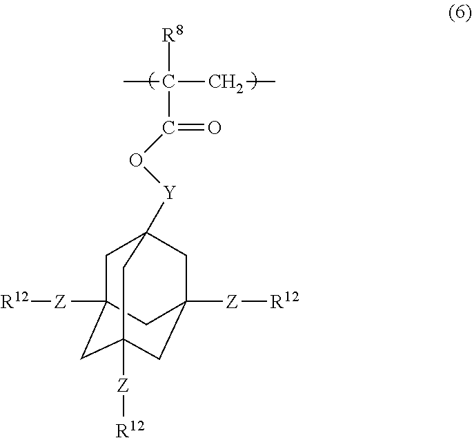 A 12-inch silicon wafer on which an underlayer antireflection film with a thickness of 77 nm (“ARC29A” manufactured by Bruwer Science) had been formed was used as a substrate. For fabricating this underlayer antireflection film, “CLEAN TRACK ACT 8” (manufactured by Tokyo Electron Ltd.) was used. Subsequently, the resin compositions shown in Tables 3 to 5 (Examples 1 to 13, Examples 21 to 34, and Comparative Example 1) were subjected to spin coating onto the above-mentioned substrate using the “CLEAN TRACK ACT 8” and baking (PB) under the conditions shown in Tables 6 and 7 to form resist films with a thickness of 205 nm. The resist films were exposed to radiation through a patterned mask using an ArF excimer laser exposure apparatus (“NSR S306C” manufactured by Nicon Corp., illuminating conditions: NA=0.78, sigma=0.93/0.69). After that, PEB was carried out under the conditions shown in Tables 6 and 7. The resist film was developed at 23° C. for 30 seconds in a tetramethylammonium hydroxide aqueous solution at a concentration of 2.38% by weight, washed with water, and dried to form a positive-tone resist pattern. An optimum exposure dose at which a 1:1 line-and-space (1L1S) pattern with a line width of 90 nm was formed was taken as sensitivity (i). A scanning electron microscope (“S-9380” manufactured by Hitachi High-Technologies Corporation) was used for the measurement. The cross-sectional shape of a line-and-space pattern with a line width of 90 nm obtained in (3) above was inspected using “S-4800” manufactured by Hitachi High-Technologies Corporation to measure the line width Lb at the middle of the resist pattern and the line width La at the upper part of the film according to A 12-inch silicon wafer on which an underlayer antireflection film with a thickness of 77 nm (“ARC29A” manufactured by Bruwer Science) had been formed was used as a substrate. For fabricating this underlayer antireflection film, “CLEAN TRACK ACT 12” (manufactured by Tokyo Electron Ltd.) was used. Subsequently, the resin compositions shown in Tables 4 and 5 (Examples 14 and 15, and Comparative Example 2) were subjected to spin coating onto the above-mentioned substrate using the “CLEAN TRACK ACT 12” and baking (PB) under the conditions shown in Table 8 to form resist films with a thickness of 120 nm. The resist films were exposed to radiation through a patterned mask under the conditions of NA=0.85, σ0/σ1=0.96/0.7 and dipole illumination using an ArF excimer laser liquid immersion exposure apparatus (“ASML AT1250i” manufactured by ASML). Pure water was used as an immersion liquid medium between the resist surface and the lens of the liquid immersion lithographic instrument. After that, PEB was carried out under the conditions shown in Table 8. The resist film was developed at 23° C. for 60 seconds in a tetramethylammonium hydroxide aqueous solution at a concentration of 2.38% by weight, washed with water, and dried to form a positive-tone resist pattern. An optimum exposure dose at which a 1:1 line-and-space (1L1S) pattern with a line width of 65 nm was formed was taken as sensitivity (ii). A scanning electron microscope (“S-9380” manufactured by Hitachi High-Technologies Corporation) was used for the measurement. A line-and-space pattern (1L1S) with a line width of 65 nm was formed in the same manner as in (5) above. In this instance, the exposure dose required for forming the line-and-space pattern having 1:1 line width, which is the depth of focus performance (DOF performance) at the sensitivity (optimal exposure dose) shown in Table 8, was measured using scanning electron microscope (“S-9380” manufactured by Hitachi High-Technologies Corporation). The cross-sectional shape of a line-and-space pattern with a line width of 65 nm obtained in the same manner as (5) above was inspected using “S-4800” manufactured by Hitachi High-Technologies Corporation to measure the line width Lb at the middle of the resist pattern and the line width La at the upper part of the film according to A 12-inch silicon wafer on which an underlayer antireflection film with a thickness of 77 nm (“ARC29A” manufactured by Bruwer Science) had been formed was used as a substrate. For fabricating this underlayer antireflection film, “CLEAN TRACK ACT 12” (manufactured by Tokyo Electron Ltd.) was used. Subsequently, the resin compositions shown in Tables 4 and 5 (Examples 14 and 15, and Comparative Example 2) were subjected to spin coating onto the above-mentioned substrate using the “CLEAN TRACK ACT 12” and baking (PB) under the conditions shown in Table 8 to form resist films with a thickness of 150 nm. The resist films were exposed to radiation through a patterned mask under the conditions of NA=0.85, σ0/σ1=0.96/0.76 and annular illumination using an ArF excimer laser liquid immersion exposure apparatus (“ASML AT1250i” manufactured by ASML). Pure water was used as an immersion liquid medium between the resist surface and the lens of the liquid immersion lithographic instrument. After that, PEB was carried out under the conditions shown in Table 8. The resist film was developed at 23° C. for 60 seconds in a tetramethylammonium hydroxide aqueous solution at a concentration of 2.38% by weight, washed with water, and dried to form a positive-tone resist pattern. An optimum exposure dose at which a 1:1 line-and-space (1L1S) pattern with a line width of 100 nm was formed was taken as sensitivity. A scanning electron microscope (“S-9380” manufactured by Hitachi High-Technologies Corporation) was used for the measurement. After that, the number of defects on the line-and-space (1L1S) pattern with a line width of 100 nm was measured using “KLA2351” manufactured by KLA-Tencor Corp. In addition, the defects measured by “KLA2351” were observed using a scanning electron microscope (“S-9380” manufactured by Hitachi High Technologies Corp.) to classify the defects i