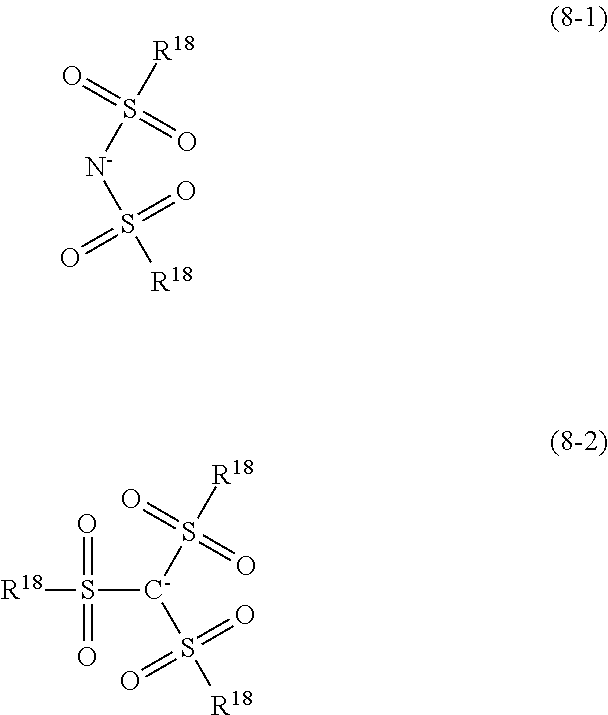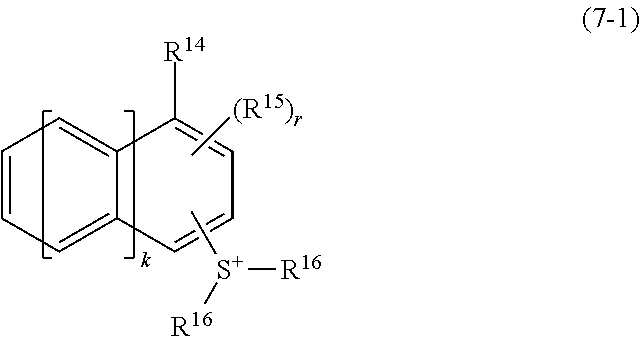 Example 1 A-1 (5) B-1 (95) C-1 (1.5) D-1 (0.65) E-1 (1400) C-2 (6.0) E-2 (30) Example 2 A-2 (5) B-1 (95) C-1 (1.5) D-1 (0.65) E-1 (1400) C-2 (6.0) E-2 (30) Example 3 A-3 (5) B-1 (95) C-1 (1.5) D-1 (0.65) E-1 (1400) C-2 (6.0) E-2 (30) Example 4 A-4 (5) B-1 (95) C-1 (1.5) D-1 (0.65) E-1 (1400) C-2 (6.0) E-2 (30) Example 5 A-5 (5) B-1 (95) C-1 (1.5) D-1 (0.65) E-1 (1400) C-2 (6.0) E-2 (30) Example 6 A-6 (5) B-1 (95) C-1 (1.5) D-1 (0.65) E-1 (1400) C-2 (6.0) E-2 (30) Example 7 A-7 (5) B-1 (95) C-1 (1.5) D-1 (0.65) E-1 (1400) C-2 (6.0) E-2 (30) Example 8 A-8 (5) B-1 (95) C-1 (1.5) D-1 (0.65) E-1 (1400) C-2 (6.0) E-2 (30) Example 9 A-9 (5) B-1 (95) C-1 (1.5) D-1 (0.65) E-1 (1400) C-2 (6.0) E-2 (30) Example 10 A-5 (5) B-1 (95) C-1 (1.5) D-1 (0.65) E-1 (1400) C-2 (6.0) E-2 (30) Example 11 A-5 (5) B-1 (95) C-1 (1.5) D-1 (0.65) E-1 (980) C-2 (6.0) E-4 (420) Example 12 A-5 (5) B-1 (95) C-1 (1.5) D-1 (0.65) E-1 (980) C-2 (6.0) E-3 (420) Example 13 A-10 (5) B-1 (95) C-1 (1.5) D-1 (0.65) E-1 (1400) C-2 (6.0) E-2 (30) Example 14 A-8 (5) B-2 (95) C-4 (6.5) D-1 (1.10) E-1 (1400) C-5 (2.0) E-2 (30) E-4 (600) Example 15 A-11 (5) B-2 (95) C-4 (6.5) D-1 (1.10) E-1 (1400) C-5 (2.0) E-2 (30) E-4 (600) Example 16 A-12 (5) B-3 (85) C-1 (4.0) D-1 (1.10) E-1 (1400) B-5 (15) C-2 (4.0) E-2 (30) E-4 (600) Example 17 A-12 (5) B-3 (85) C-1 (2.0) D-1 (1.10) E-1 (1400) B-5 (15) C-2 (6.0) E-2 (30) E-4 (600) Example 18 A-12 (5) B-3 (30) C-1 (4.0) D-1 (1.10) E-1 (1400) B-5 (70) C-2 (5.0) E-2 (30) E-4 (600) Example 19 A-12 (5) B-3 (30) C-6 (4.0) D-1 (1.10) E-1 (1400) B-5 (70) C-2 (5.0) E-2 (30) E-4 (600) Example 20 A-12 (5) B-5 (100) C-1 (7.0) D-1 (1.10) E-1 (1400) C-2 (2.0) E-2 (30) E-4 (600) Example 21 A-12 (5) B-3 (30) C-1 (4.0) D-1 (1.10) E-1 (1400) B-4 (70) C-2 (5.0) E-2 (30) E-4 (600) Example 22 A-12 (5) B-3 (40) C-6 (4.0) D-1 (1.10) E-1 (1400) B-6 (60) C-2 (5.0) E-2 (30) E-4 (600) Example 23 A-12 (5) B-3 (30) C-1 (7.0) D-1 (1.10) E-1 (1400) B-4 (70) C-2 (2.0) E-2 (30) E-4 (600) Example 24 A-12 (5) B-3 (30) C-1 (7.0) D-1 (1.10) E-1 (1400) B-4 (70) C-5 (2.0) E-2 (30) E-4 (600) Example 25 A-13 (5) B-5 (100) C-1 (7.0) D-1 (1.10) E-1 (140) C-2 (2.0) E-2 (30) E-4 (600) Example 26 A-12 (5) B-5 (100) C-1 (3.0) D-1 (1.10) E-1 (1400) C-2 (2.0) E-2 (30) C-6 (4.5) E-4 (600) Example 27 A-12 (5) B-5 (100) C-1 (7.0) D-1 (1.10) E-1 (1400) C-2 (2.0) E-2 (30) E-4 (600) Example 28 A-12 (5) B-6 (100) C-7 (2.0) D-1 (1.10) E-1 (1400) C-2 (4.0) E-2 (30) C-5 (2.0) E-4 (600) Example 29 A-12 (5) B-6 (100) C-7 (2.0) D-1 (1.10) E-1 (1400) C-2 (6.0) E-2 (30) E-4 (600) Example 30 A-12 (5) B-6 (100) C-7 (4.0) D-1 (1.10) E-1 (1400) C-1 (3.0) E-2 (30) E-4 (600) Example 31 A-13 (5) B-1 (100) C-1 (1.5) D-1 (1.10) E-1 (1400) C-2 (6.0) E-2 (30) E-4 (600) Example 32 A-12 (5) B-1 (100) C-1 (1.5) D-1 (1.10) E-1 (1400) C-2 (6.0) E-2 (30) E-4 (600) Example 33 A-12 (5) B-7 (100) C-7 (7.5) D-1 (1.10) E-1 (1400) E-2 (30) E-4 (600) Example 34 A-12 (5) B-7 (100) C-6 (7.0) D-1 (1.10) E-1 (1400) E-2 (30) E-4 (600) Comparative — B-1 (100) C-1 (1.5) D-1 (0.65) E-1 (1400) Example 1 C-2 (6.0) E-2 (30) Comparative — B-2 (100) C-4 (6.5) D-1 (1.10) E-1 (1400) Example 2 C-5 (2.0) E-2 (30) E-4 (600) <Acid Generator (C)>