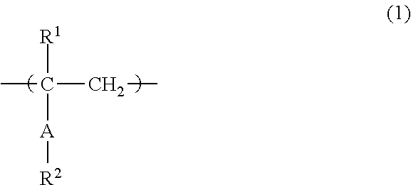 Polymerization Example 1 A-1 M-1 70 M-3 30 — 8 Methanol Polymerization Example 2 A-2 M-2 70 M-3 30 — 8 Methanol/water = 4/1 Polymerization Example 3 A-3 M-1 70 M-4 30 — 8 Methanol/water = 4/1 Polymerization Example 4 A-4 M-1 70 M-5 30 — 8 Methanol/water = 4/1 Polymerization Example 5 A-5 M-1 85 M-5 15 — 8 Methanol/water = 4/1 Polymerization Example 6 A-6 M-1 30 M-5 70 — 8 Methanol/water = 4/1 Polymerization Example 7 A-7 M-1 70 M-6 30 — 8 Methanol Polymerization Example 8 A-8 M-1 85 M-5 15 — 12 Methanol Polymerization Example 9 A-9 M-1 70 M-5 15 M-7 15 8 Methanol Polymerization Example 10 A-10 M-1 80 M-5 15 M-7 5 8 Methanol Polymerization Example 11 A-11 M-1 70 M-10 30 — 8 Methanol/water = 4/1 Polymerization Example 12 A-12 M-1 70 M-10 30 — 8 — Polymerization Example 13 A-13 M-1 85 M-5 15 — 12 — Polymerization Example 1 A-1 64 <0.1 6,600 1.51 67.4 32.6 — Polymerization Example 2 A-2 29 <0.1 9,100 1.77 57.4 42.6 — Polymerization Example 3 A-3 86 <0.1 8,200 1.87 68.8 31.2 — Polymerization Example 4 A-4 82 <0.1 5,900 1.87 71.6 28.4 — Polymerization Example 5 A-5 79 <0.1 5,200 1.82 85.5 14.5 — Polymerization Example 6 A-6 68 <0.1 6,400 1.63 33.2 66.8 — Polymerization Example 7 A-7 50 <0.1 7,200 2.00 71.1 28.9 — Polymerization Example 8 A-8 45 <0.1 4,000 1.80 85.3 14.7 — Polymerization Example 9 A-9 78 <0.1 8,000 1.63 70.1 14.1 15.8 Polymerization Example 10 A-10 75 <0.1 6,800 1.65 79.1 15.6 5.3 Polymerization Example 11 A-11 66 <0.1 7,000 1.60 70.5 29.5 — Polymerization Example 12 A-12 60 <0.1 7,200 2.00 71.1 28.9 — Polymerization Example 13 A-13 60 <0.1 4,000 1.80 85.3 14.7 —
