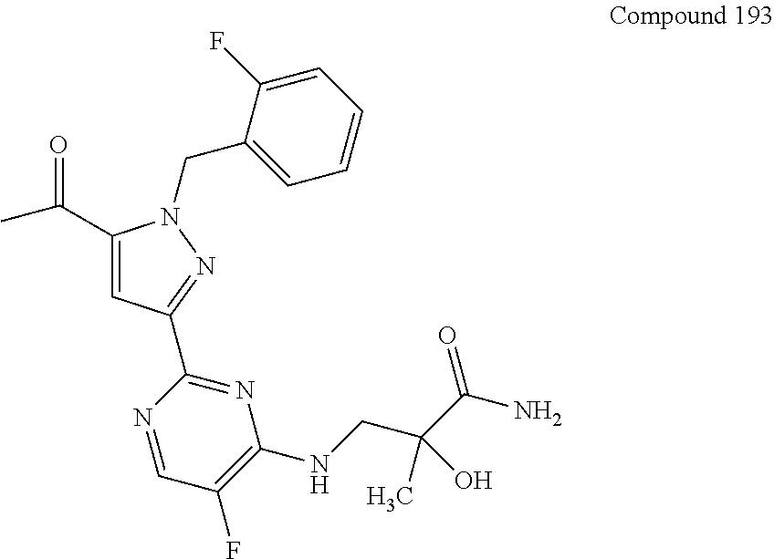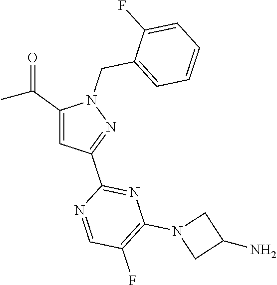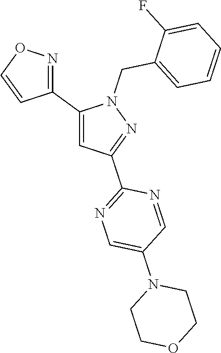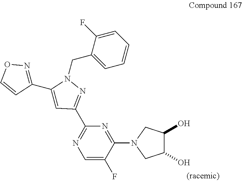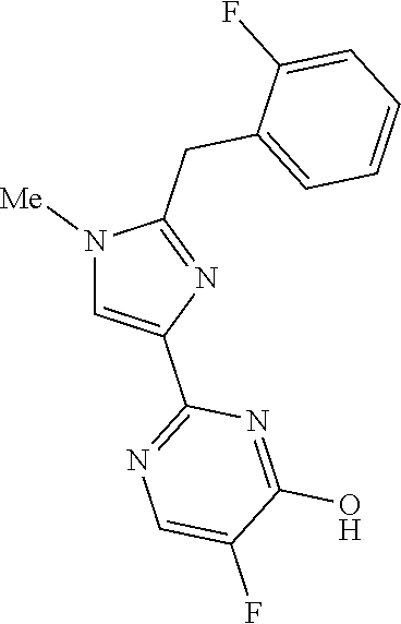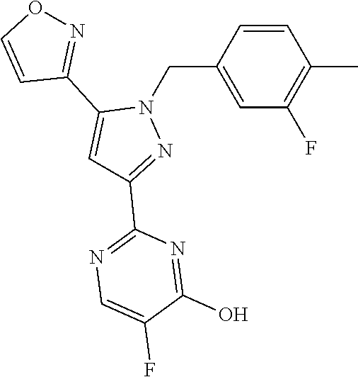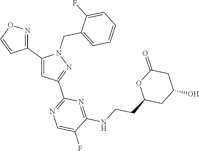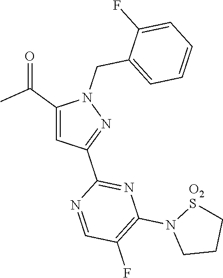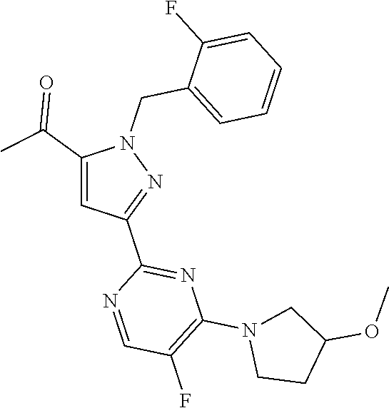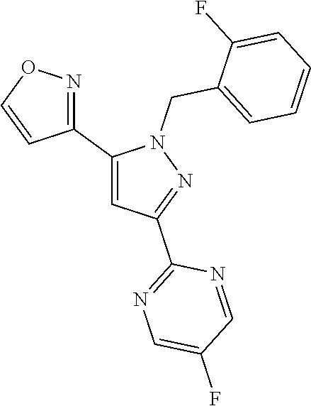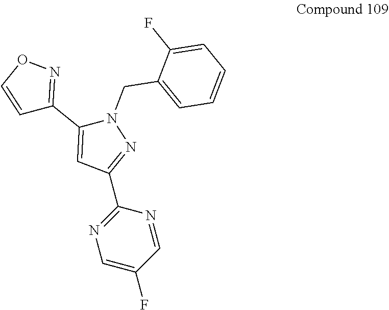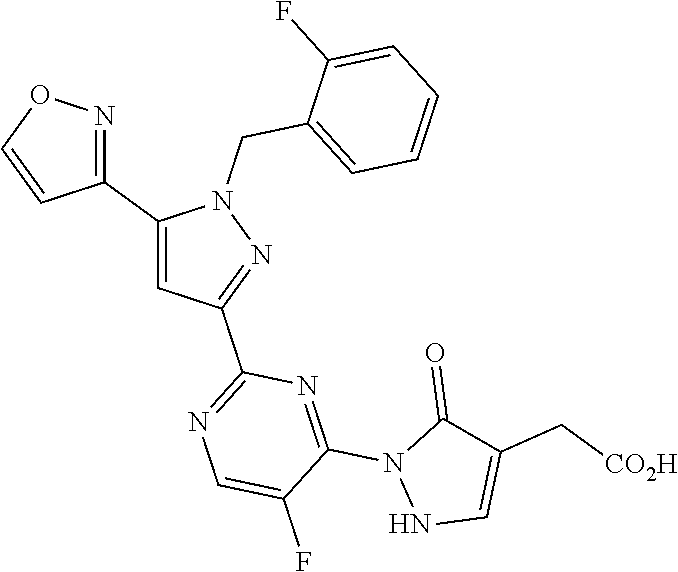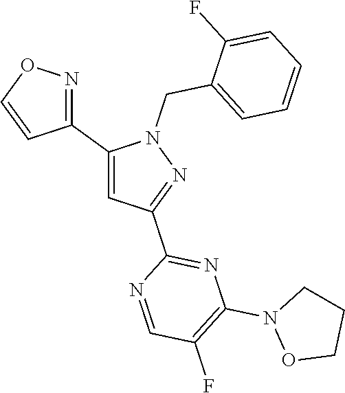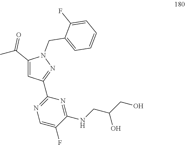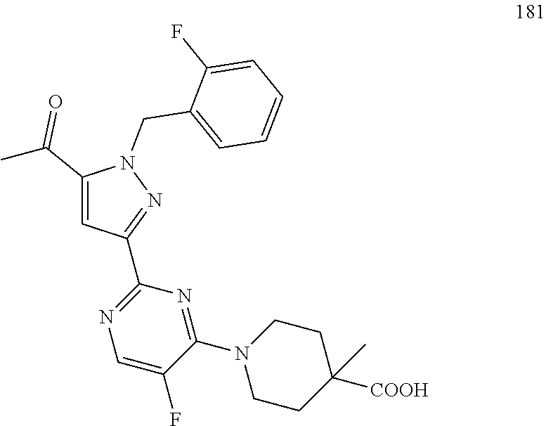 MS: Thermo Vantage Ion Mode: ESI+ Scan Type: MRM Dwell Collision Retention Time Energy Time Compound: Transition (msec) (V) S Lens (min) cGMP 346 > 152 100 32 75 0.6 (+3) cGMP IS 349 > 155 100 32 75 0.6 HPLC: Waters Acquity UPLC Column: Thermo Hypersil Gold 2.1 × 50 mm 1.9 micron particle size Flow Rate: 750 uL/min Column Temperature: RT Autosampler Temperature: 6° C. Injection Volume: 20 uL Mobile Phases: A = 100% Water + 0.1% Formic Acid B = 100% Acetonitrile + 0.1% Formic Acid Gradient: Time (min) % A % B 0 100 0 0.2 100 0 0.3 50 50 0.7 50 50 0.8 100 0 Whole cell activity in the HEK assay with LC/MS detection (updated assay conditions, Example 2A). Absolute Absolute EC50 (nM)- EC50 (nM)- Compound binned (~) Compound binned (~) 1 C 51 B 52 A 3 ND 4 C 54 A 5 C 55 B 6 C 56 C 7 ND 57 ND 8 B 9 C 59 B 10 C 60 A 11 C 61 C 12 ND 62 C 13 C 64 B 14 B 65 A 15 A 66 C 16 B 67 B 17 ND 68 B 19 C 69 A 20 ND 70 B 21 C 71 B 22 C 72 B 73 C 24 B 74 B 25 NA 75 B 26 B 76 B 27 C 77 C 28 A 78 C 29 A 79 B 30 B 80 B 81 C 32 B 82 33 C 83 C 34 B 84 C 35 C 85 B 36 B 86 C 37 ND 87 B 38 B 88 B 39 C 89 B 40 C 90 A 41 C 91 B 42 B 92 C 43 C 93 B 44 A 94 C 45 C 95 B 46 C 96 B 47 B 97 C 48 C 98 C 49 C 99 B 50 C 106 A 102 B 107 A 103 B 108 B 109 B 105 ND 179 B 150 A 112 B 151 A 113 B 152 A 114 C 131 B 115 C 194 C 116 B 127 A 117 B 125 C 180 B 153 B 181 B 126 ND 118 C 154 B 119 C 193 C 120 ND 155 B 121 C 195 C 122 C 156 B 135 B 196 ND 136 B 199 B 139 B 200 C 140 C 202 B 137 B 157 C 138 B 158 C 123 B 206 A 124 C 162 B 129 C 163 A 182 C 164 A 183 C 165 B 184 C 159 ND 147 C 160 B 148 A 161 B 149 A 166 C 130 B 195 C 194 C (~) Code definitions for the sGC enzyme activity values, expressed as Absolute EC50which is defined as the concentration at which a given compound elicits 50% of the high control response (Compound Y). Compounds failing to elicit a minimum response of 50% are reported as > 30 μM or ND. EC50Abs ≤ 100 nM = A; 100 nM < EC50Abs ≤ 1000 nM = B; 1000 nM < EC50Abs = C. Example 2B: Biological Activity Measurement by the cGMP GloSensor Cell-Based Assay, 384-Well Format