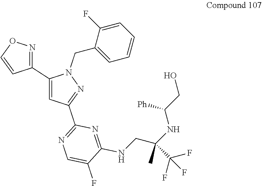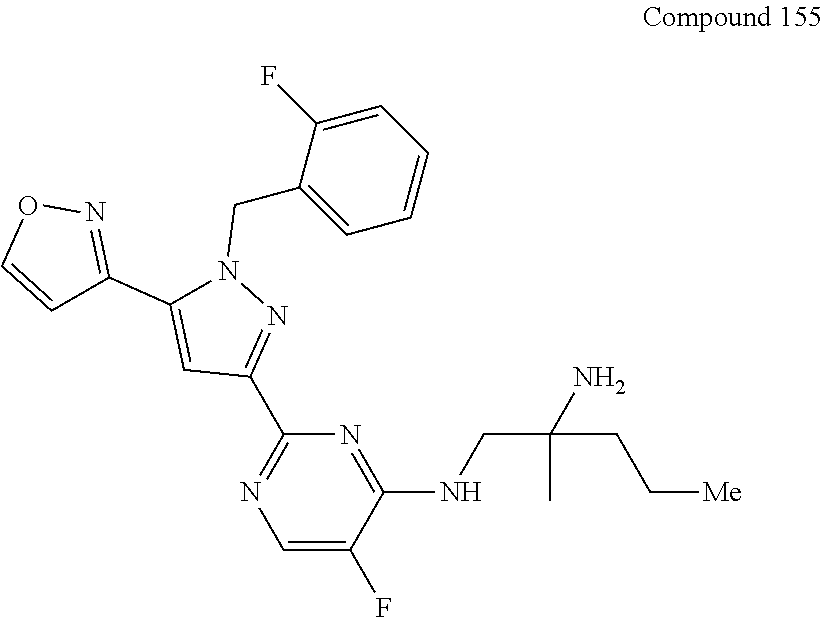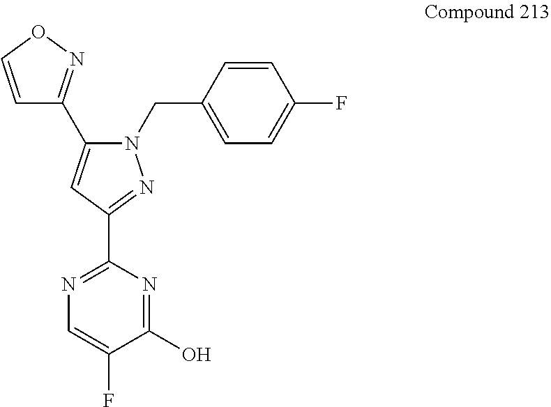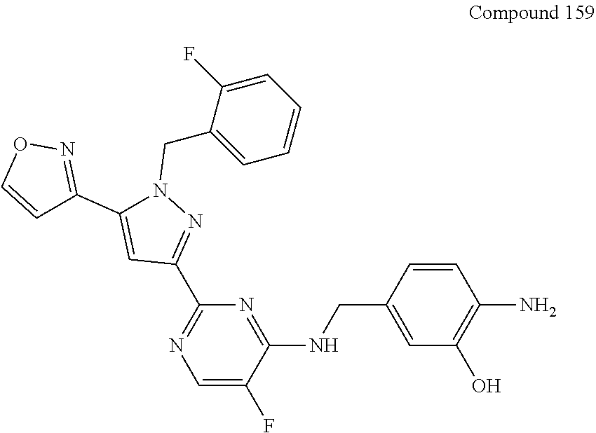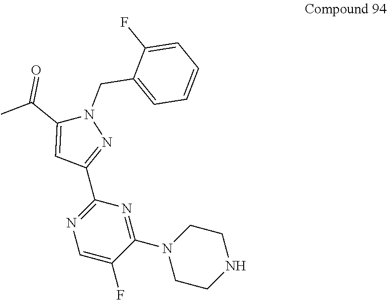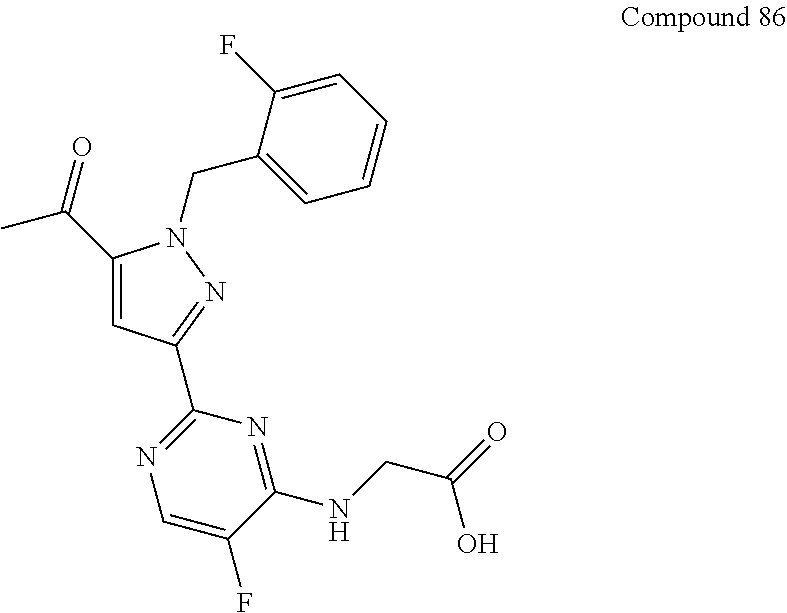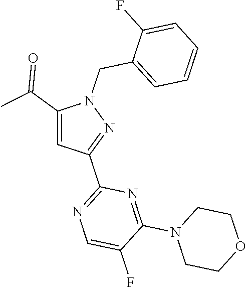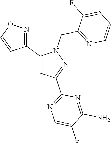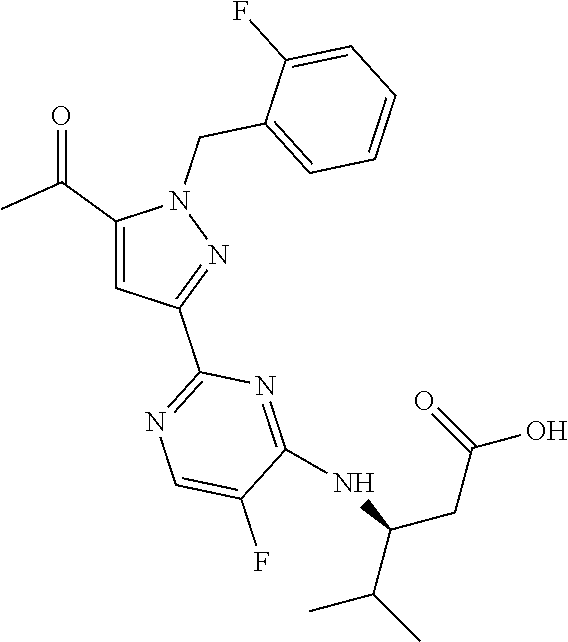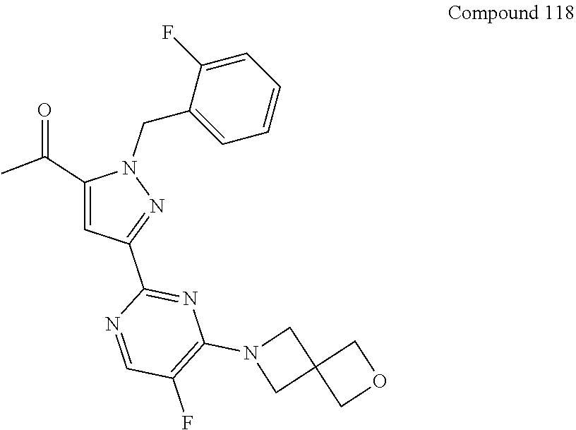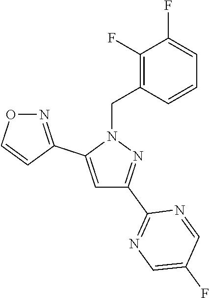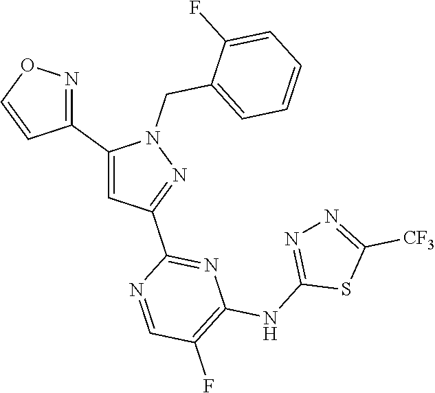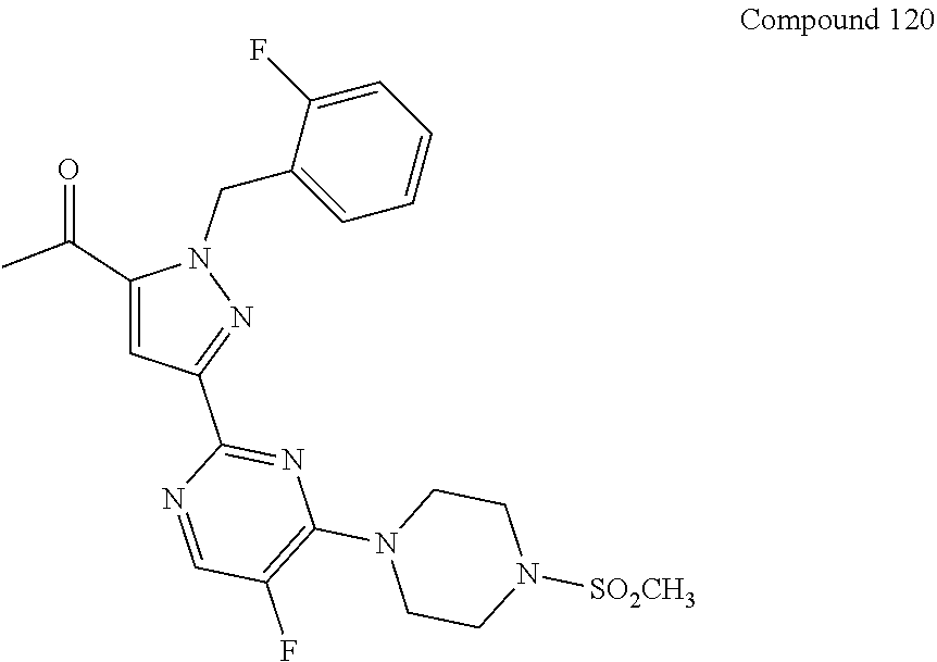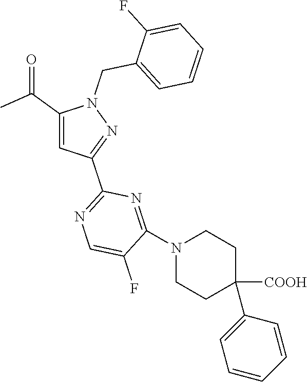 MS: Thermo Vantage Ion Mode: ESI+ Scan Type: MRM Dwell Collision Retention Time Energy Time Compound: Transition (msec) (V) S Lens (min) cGMP 346 > 152 100 32 75 0.6 (+3) cGMP IS 349 > 155 100 32 75 0.6 HPLC: Waters Acquity UPLC Column: Thermo Hypersil Gold 2.1 × 50 mm 1.9 micron particle size Flow Rate: 750 uL/min Column Temperature: RT Autosampler Temperature: 6° C. Injection Volume: 20 uL Mobile Phases: A = 100% Water + 0.1% Formic Acid B = 100% Acetonitrile + 0.1% Formic Acid Gradient: Time (min) % A % B 0 100 0 0.2 100 0 0.3 50 50 0.7 50 50 0.8 100 0 Whole cell activity in the HEK assay with LC/MS detection (updated assay conditions, Example 2A). Absolute Absolute EC50 (nM)- EC50 (nM)- Compound binned (~) Compound binned (~) 1 C 51 B 52 A 3 ND 4 C 54 A 5 C 55 B 6 C 56 C 7 ND 57 ND 8 B 9 C 59 B 10 C 60 A 11 C 61 C 12 ND 62 C 13 C 64 B 14 B 65 A 15 A 66 C 16 B 67 B 17 ND 68 B 19 C 69 A 20 ND 70 B 21 C 71 B 22 C 72 B 73 C 24 B 74 B 25 NA 75 B 26 B 76 B 27 C 77 C 28 A 78 C 29 A 79 B 30 B 80 B 81 C 32 B 82 33 C 83 C 34 B 84 C 35 C 85 B 36 B 86 C 37 ND 87 B 38 B 88 B 39 C 89 B 40 C 90 A 41 C 91 B 42 B 92 C 43 C 93 B 44 A 94 C 45 C 95 B 46 C 96 B 47 B 97 C 48 C 98 C 49 C 99 B 50 C 106 A 102 B 107 A 103 B 108 B 109 B 105 ND 179 B 150 A 112 B 151 A 113 B 152 A 114 C 131 B 115 C 194 C 116 B 127 A 117 B 125 C 180 B 153 B 181 B 126 ND 118 C 154 B 119 C 193 C 120 ND 155 B 121 C 195 C 122 C 156 B 135 B 196 ND 136 B 199 B 139 B 200 C 140 C 202 B 137 B 157 C 138 B 158 C 123 B 206 A 124 C 162 B 129 C 163 A 182 C 164 A 183 C 165 B 184 C 159 ND 147 C 160 B 148 A 161 B 149 A 166 C 130 B 195 C 194 C (~) Code definitions for the sGC enzyme activity values, expressed as Absolute EC50which is defined as the concentration at which a given compound elicits 50% of the high control response (Compound Y). Compounds failing to elicit a minimum response of 50% are reported as > 30 μM or ND. EC50Abs ≤ 100 nM = A; 100 nM < EC50Abs ≤ 1000 nM = B; 1000 nM < EC50Abs = C. Example 2B: Biological Activity Measurement by the cGMP GloSensor Cell-Based Assay, 384-Well Format