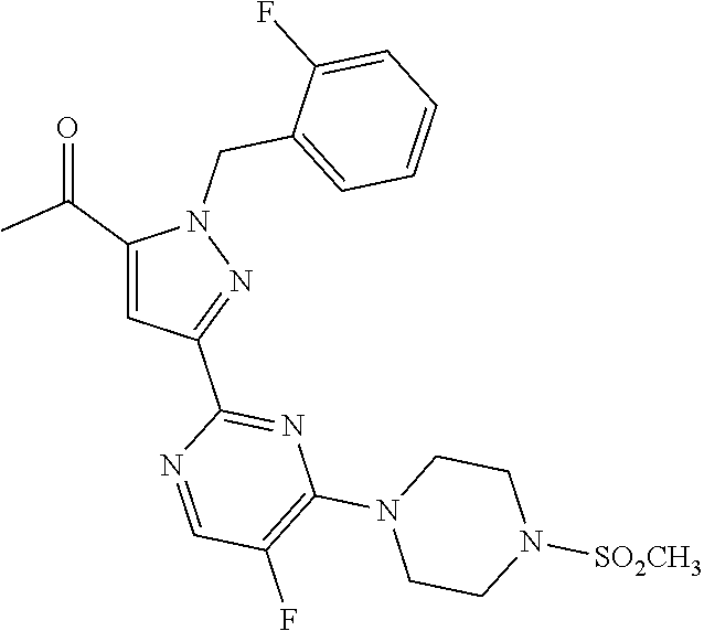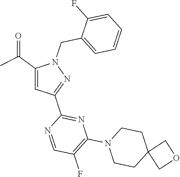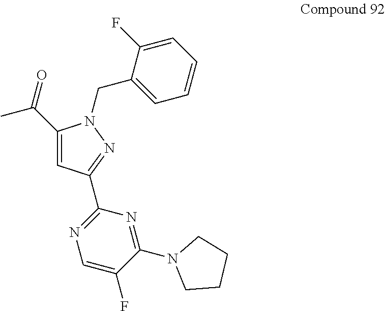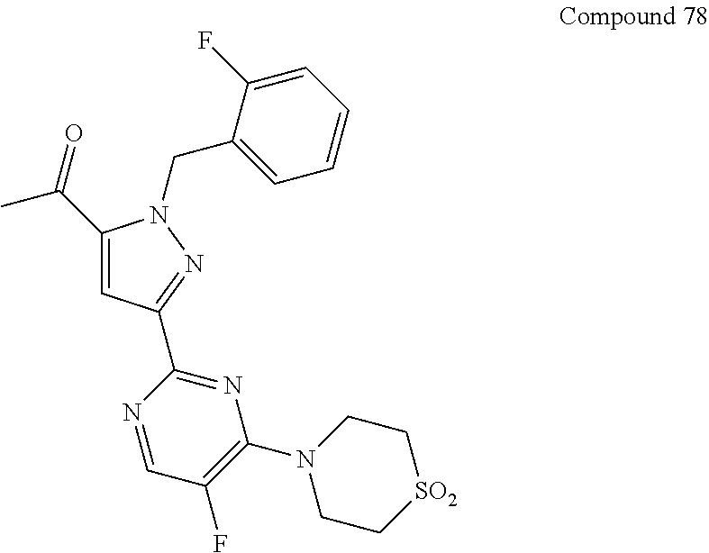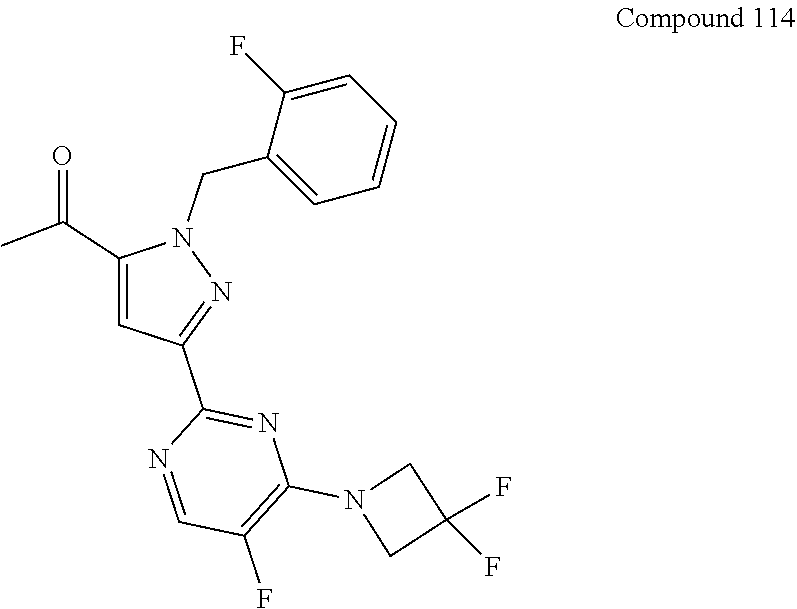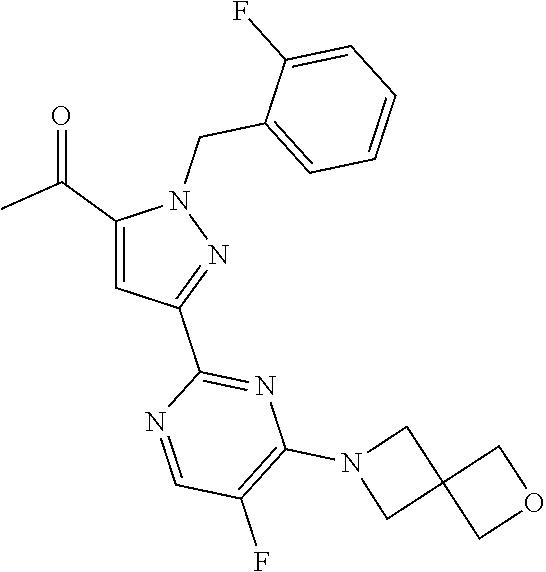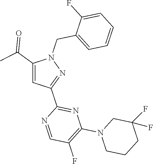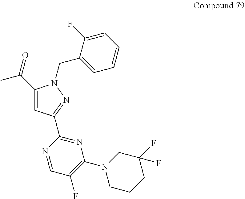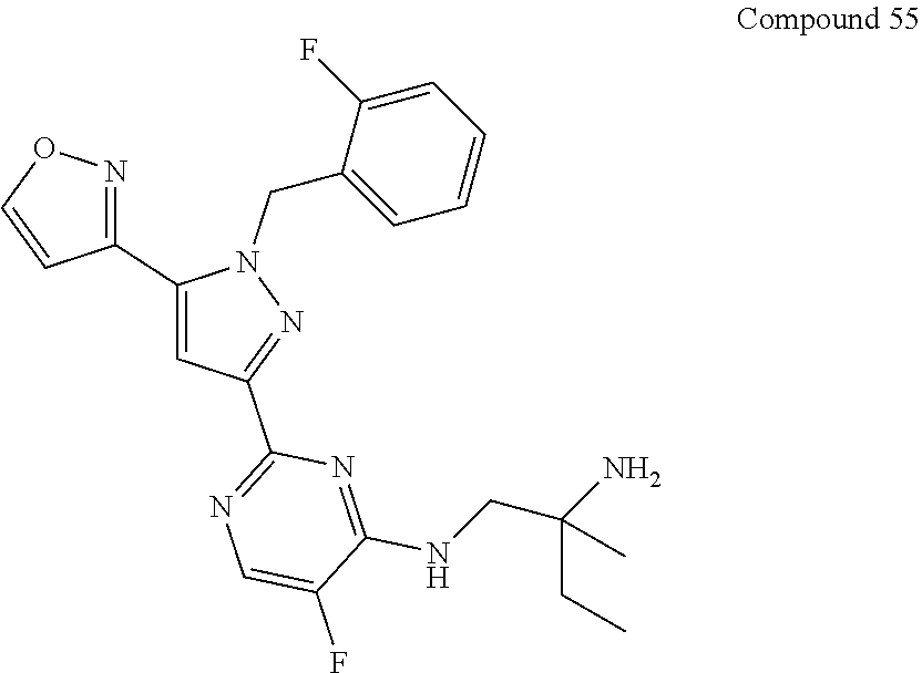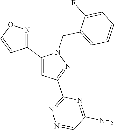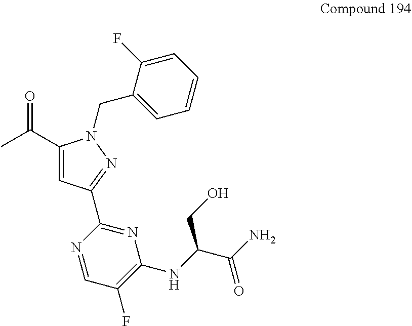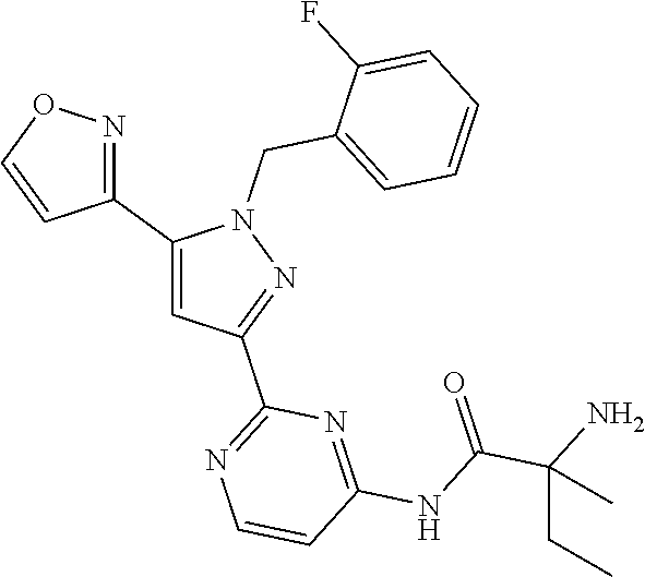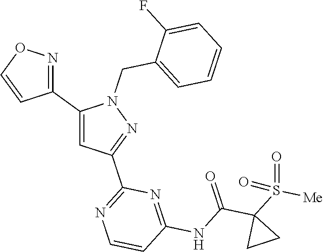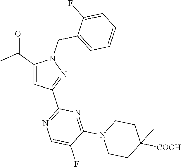 MS: Thermo Vantage Ion Mode: ESI+ Scan Type: MRM Dwell Collision Retention Time Energy Time Compound: Transition (msec) (V) S Lens (min) cGMP 346 > 152 100 32 75 0.6 (+3) cGMP IS 349 > 155 100 32 75 0.6 HPLC: Waters Acquity UPLC Column: Thermo Hypersil Gold 2.1 × 50 mm 1.9 micron particle size Flow Rate: 750 uL/min Column Temperature: RT Autosampler Temperature: 6° C. Injection Volume: 20 uL Mobile Phases: A = 100% Water + 0.1% Formic Acid B = 100% Acetonitrile + 0.1% Formic Acid Gradient: Time (min) % A % B 0 100 0 0.2 100 0 0.3 50 50 0.7 50 50 0.8 100 0 Whole cell activity in the HEK assay with LC/MS detection (updated assay conditions, Example 2A). Absolute Absolute EC50 (nM)- EC50 (nM)- Compound binned (~) Compound binned (~) 1 C 51 B 52 A 3 ND 4 C 54 A 5 C 55 B 6 C 56 C 7 ND 57 ND 8 B 9 C 59 B 10 C 60 A 11 C 61 C 12 ND 62 C 13 C 64 B 14 B 65 A 15 A 66 C 16 B 67 B 17 ND 68 B 19 C 69 A 20 ND 70 B 21 C 71 B 22 C 72 B 73 C 24 B 74 B 25 NA 75 B 26 B 76 B 27 C 77 C 28 A 78 C 29 A 79 B 30 B 80 B 81 C 32 B 82 33 C 83 C 34 B 84 C 35 C 85 B 36 B 86 C 37 ND 87 B 38 B 88 B 39 C 89 B 40 C 90 A 41 C 91 B 42 B 92 C 43 C 93 B 44 A 94 C 45 C 95 B 46 C 96 B 47 B 97 C 48 C 98 C 49 C 99 B 50 C 106 A 102 B 107 A 103 B 108 B 109 B 105 ND 179 B 150 A 112 B 151 A 113 B 152 A 114 C 131 B 115 C 194 C 116 B 127 A 117 B 125 C 180 B 153 B 181 B 126 ND 118 C 154 B 119 C 193 C 120 ND 155 B 121 C 195 C 122 C 156 B 135 B 196 ND 136 B 199 B 139 B 200 C 140 C 202 B 137 B 157 C 138 B 158 C 123 B 206 A 124 C 162 B 129 C 163 A 182 C 164 A 183 C 165 B 184 C 159 ND 147 C 160 B 148 A 161 B 149 A 166 C 130 B 195 C 194 C (~) Code definitions for the sGC enzyme activity values, expressed as Absolute EC50which is defined as the concentration at which a given compound elicits 50% of the high control response (Compound Y). Compounds failing to elicit a minimum response of 50% are reported as > 30 μM or ND. EC50Abs ≤ 100 nM = A; 100 nM < EC50Abs ≤ 1000 nM = B; 1000 nM < EC50Abs = C. Example 2B: Biological Activity Measurement by the cGMP GloSensor Cell-Based Assay, 384-Well Format