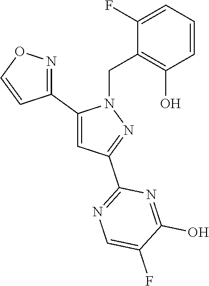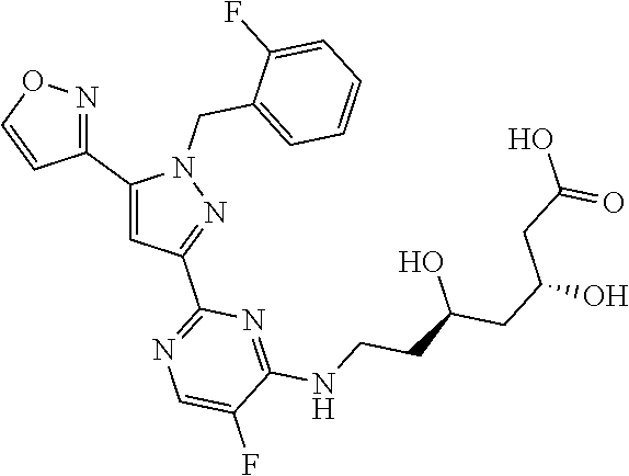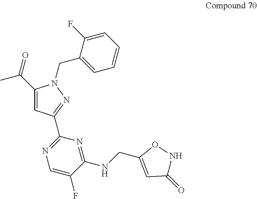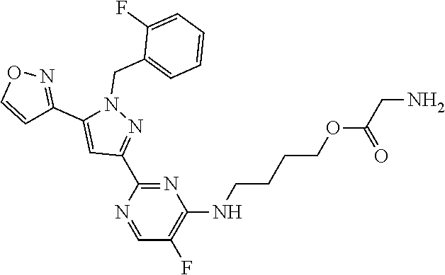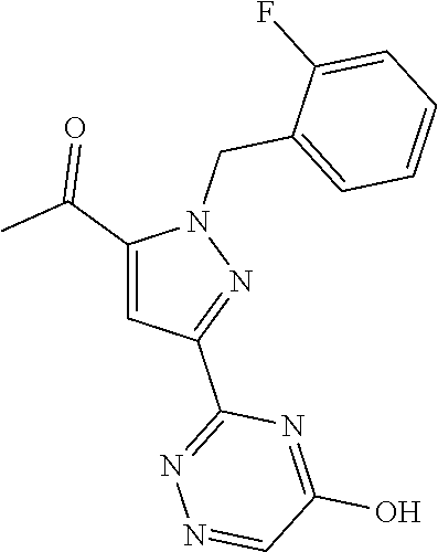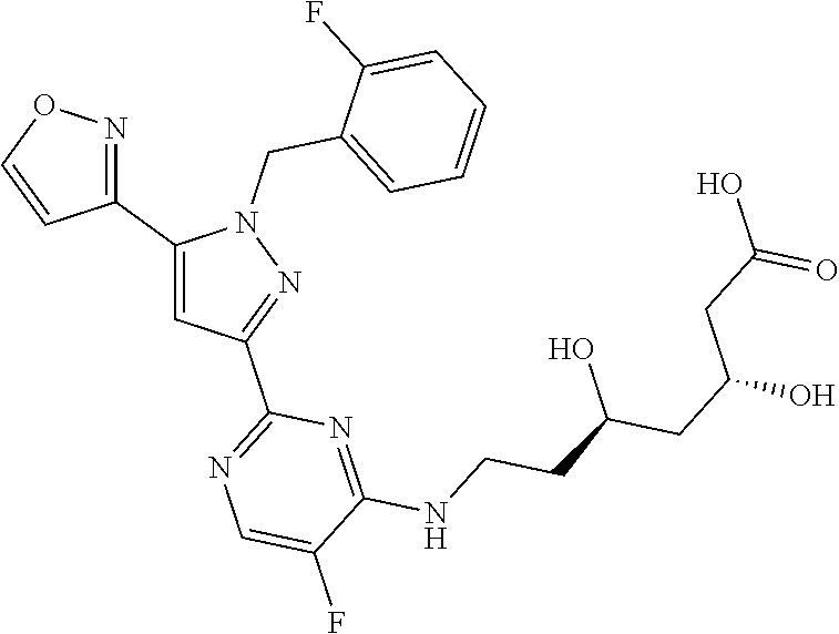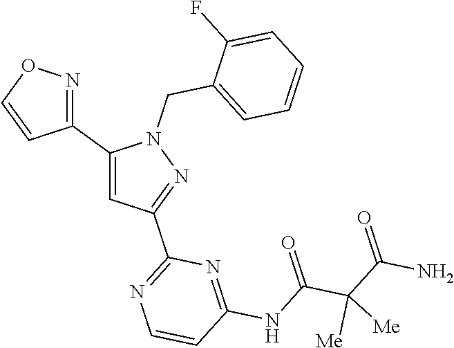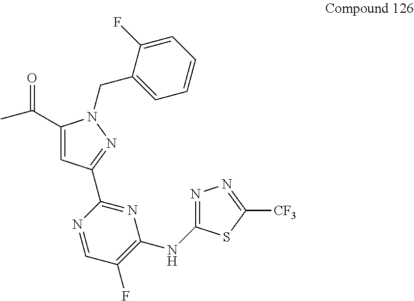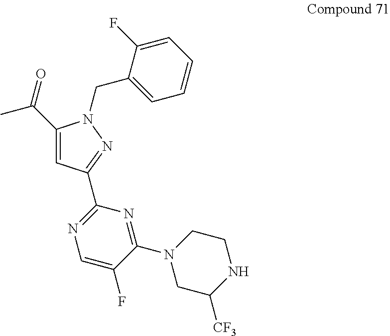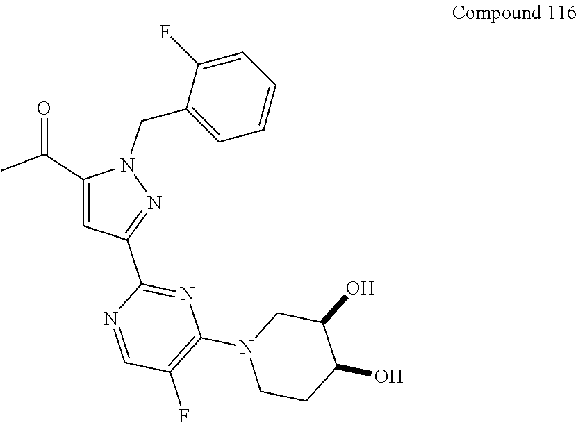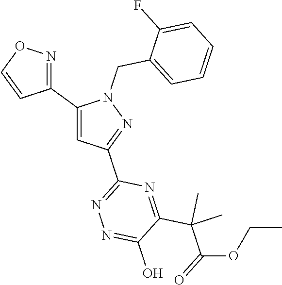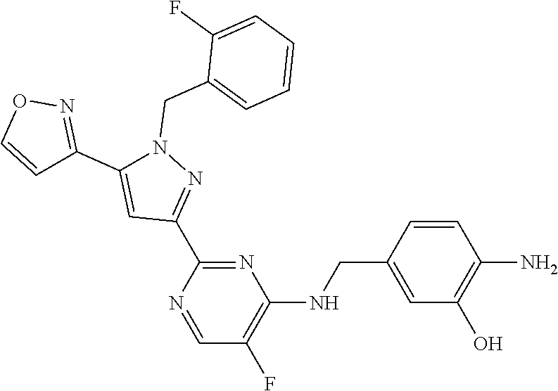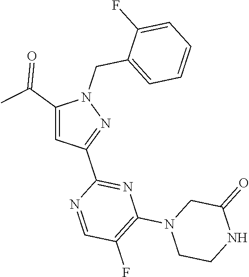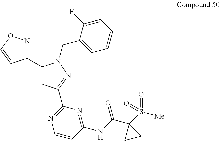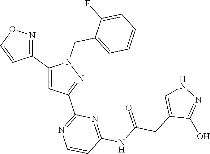 MS: Thermo Vantage Ion Mode: ESI+ Scan Type: MRM Dwell Collision Retention Time Energy Time Compound: Transition (msec) (V) S Lens (min) cGMP 346 > 152 100 32 75 0.6 (+3) cGMP IS 349 > 155 100 32 75 0.6 HPLC: Waters Acquity UPLC Column: Thermo Hypersil Gold 2.1 × 50 mm 1.9 micron particle size Flow Rate: 750 uL/min Column Temperature: RT Autosampler Temperature: 6° C. Injection Volume: 20 uL Mobile Phases: A = 100% Water + 0.1% Formic Acid B = 100% Acetonitrile + 0.1% Formic Acid Gradient: Time (min) % A % B 0 100 0 0.2 100 0 0.3 50 50 0.7 50 50 0.8 100 0 Whole cell activity in the HEK assay with LC/MS detection (updated assay conditions, Example 2A). Absolute Absolute EC50 (nM)- EC50 (nM)- Compound binned (~) Compound binned (~) 1 C 51 B 52 A 3 ND 4 C 54 A 5 C 55 B 6 C 56 C 7 ND 57 ND 8 B 9 C 59 B 10 C 60 A 11 C 61 C 12 ND 62 C 13 C 64 B 14 B 65 A 15 A 66 C 16 B 67 B 17 ND 68 B 19 C 69 A 20 ND 70 B 21 C 71 B 22 C 72 B 73 C 24 B 74 B 25 NA 75 B 26 B 76 B 27 C 77 C 28 A 78 C 29 A 79 B 30 B 80 B 81 C 32 B 82 33 C 83 C 34 B 84 C 35 C 85 B 36 B 86 C 37 ND 87 B 38 B 88 B 39 C 89 B 40 C 90 A 41 C 91 B 42 B 92 C 43 C 93 B 44 A 94 C 45 C 95 B 46 C 96 B 47 B 97 C 48 C 98 C 49 C 99 B 50 C 106 A 102 B 107 A 103 B 108 B 109 B 105 ND 179 B 150 A 112 B 151 A 113 B 152 A 114 C 131 B 115 C 194 C 116 B 127 A 117 B 125 C 180 B 153 B 181 B 126 ND 118 C 154 B 119 C 193 C 120 ND 155 B 121 C 195 C 122 C 156 B 135 B 196 ND 136 B 199 B 139 B 200 C 140 C 202 B 137 B 157 C 138 B 158 C 123 B 206 A 124 C 162 B 129 C 163 A 182 C 164 A 183 C 165 B 184 C 159 ND 147 C 160 B 148 A 161 B 149 A 166 C 130 B 195 C 194 C (~) Code definitions for the sGC enzyme activity values, expressed as Absolute EC50which is defined as the concentration at which a given compound elicits 50% of the high control response (Compound Y). Compounds failing to elicit a minimum response of 50% are reported as > 30 μM or ND. EC50Abs ≤ 100 nM = A; 100 nM < EC50Abs ≤ 1000 nM = B; 1000 nM < EC50Abs = C. Example 2B: Biological Activity Measurement by the cGMP GloSensor Cell-Based Assay, 384-Well Format
