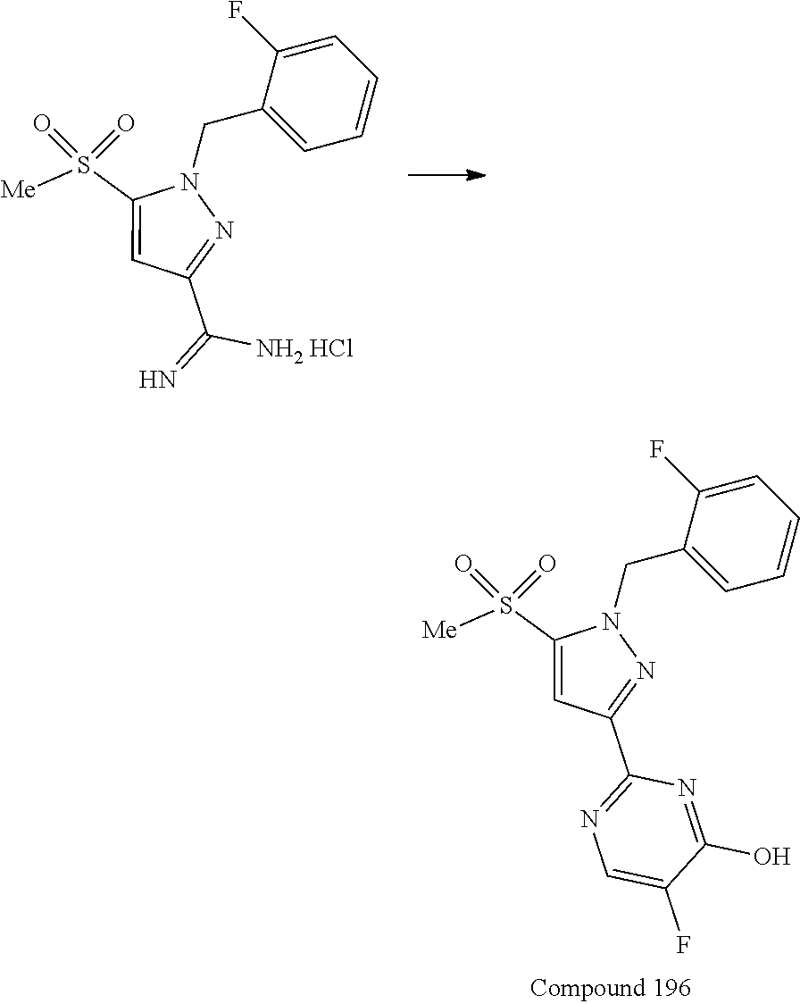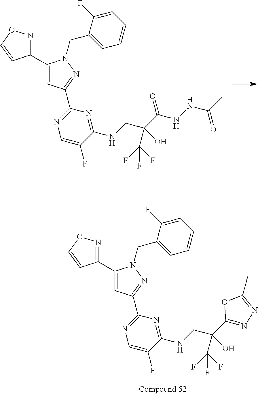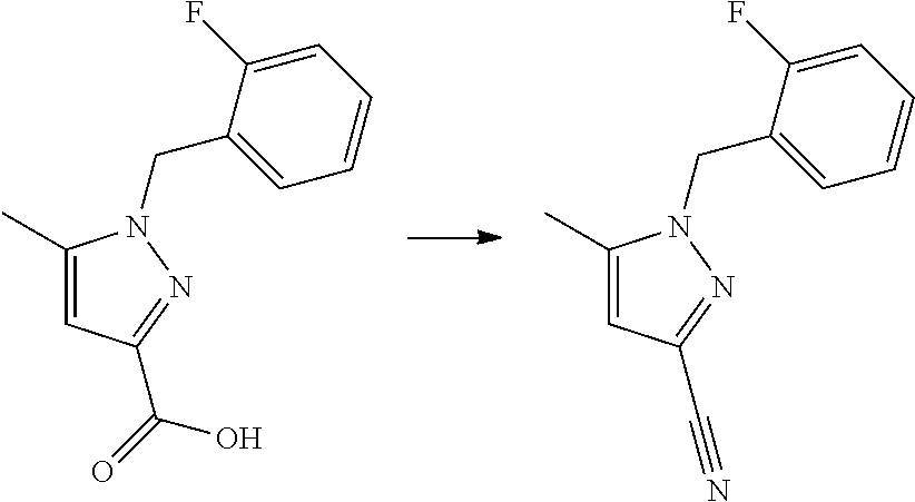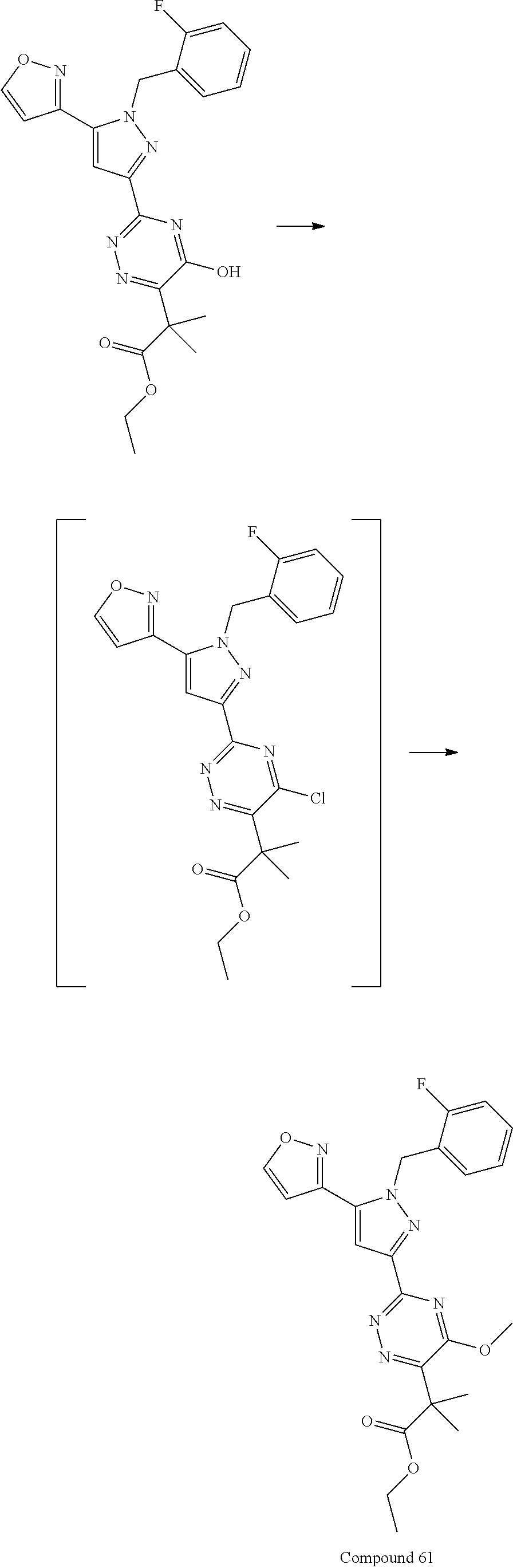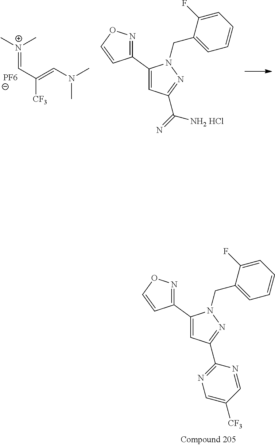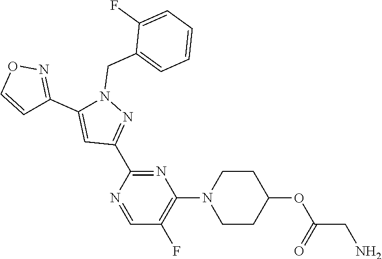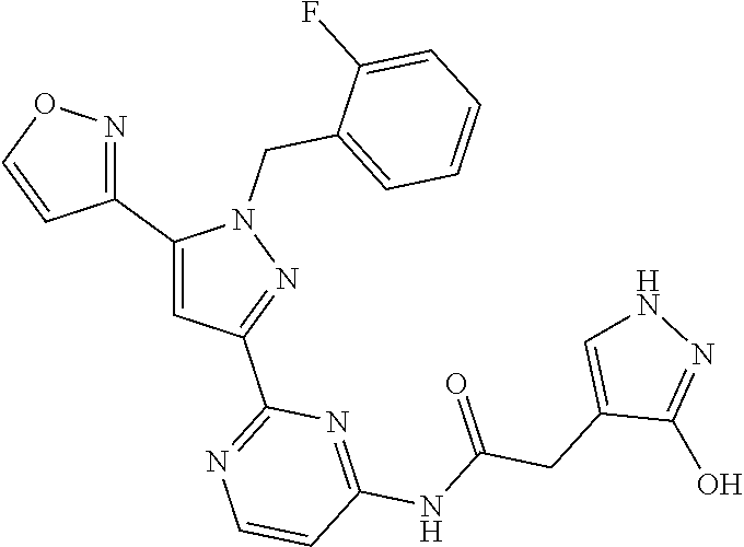 MS: Thermo Vantage Ion Mode: ESI+ Scan Type: MRM Dwell Collision Retention Time Energy Time Compound: Transition (msec) (V) S Lens (min) cGMP 346 > 152 100 32 75 0.6 (+3) cGMP IS 349 > 155 100 32 75 0.6 HPLC: Waters Acquity UPLC Column: Thermo Hypersil Gold 2.1 × 50 mm 1.9 micron particle size Flow Rate: 750 uL/min Column Temperature: RT Autosampler Temperature: 6° C. Injection Volume: 20 uL Mobile Phases: A = 100% Water + 0.1% Formic Acid B = 100% Acetonitrile + 0.1% Formic Acid Gradient: Time (min) % A % B 0 100 0 0.2 100 0 0.3 50 50 0.7 50 50 0.8 100 0 Whole cell activity in the HEK assay with LC/MS detection (updated assay conditions, Example 2A). Absolute Absolute EC50 (nM)- EC50 (nM)- Compound binned (~) Compound binned (~) 1 C 51 B 52 A 3 ND 4 C 54 A 5 C 55 B 6 C 56 C 7 ND 57 ND 8 B 9 C 59 B 10 C 60 A 11 C 61 C 12 ND 62 C 13 C 64 B 14 B 65 A 15 A 66 C 16 B 67 B 17 ND 68 B 19 C 69 A 20 ND 70 B 21 C 71 B 22 C 72 B 73 C 24 B 74 B 25 NA 75 B 26 B 76 B 27 C 77 C 28 A 78 C 29 A 79 B 30 B 80 B 81 C 32 B 82 33 C 83 C 34 B 84 C 35 C 85 B 36 B 86 C 37 ND 87 B 38 B 88 B 39 C 89 B 40 C 90 A 41 C 91 B 42 B 92 C 43 C 93 B 44 A 94 C 45 C 95 B 46 C 96 B 47 B 97 C 48 C 98 C 49 C 99 B 50 C 106 A 102 B 107 A 103 B 108 B 109 B 105 ND 179 B 150 A 112 B 151 A 113 B 152 A 114 C 131 B 115 C 194 C 116 B 127 A 117 B 125 C 180 B 153 B 181 B 126 ND 118 C 154 B 119 C 193 C 120 ND 155 B 121 C 195 C 122 C 156 B 135 B 196 ND 136 B 199 B 139 B 200 C 140 C 202 B 137 B 157 C 138 B 158 C 123 B 206 A 124 C 162 B 129 C 163 A 182 C 164 A 183 C 165 B 184 C 159 ND 147 C 160 B 148 A 161 B 149 A 166 C 130 B 195 C 194 C (~) Code definitions for the sGC enzyme activity values, expressed as Absolute EC50which is defined as the concentration at which a given compound elicits 50% of the high control response (Compound Y). Compounds failing to elicit a minimum response of 50% are reported as > 30 μM or ND. EC50Abs ≤ 100 nM = A; 100 nM < EC50Abs ≤ 1000 nM = B; 1000 nM < EC50Abs = C. Example 2B: Biological Activity Measurement by the cGMP GloSensor Cell-Based Assay, 384-Well Format