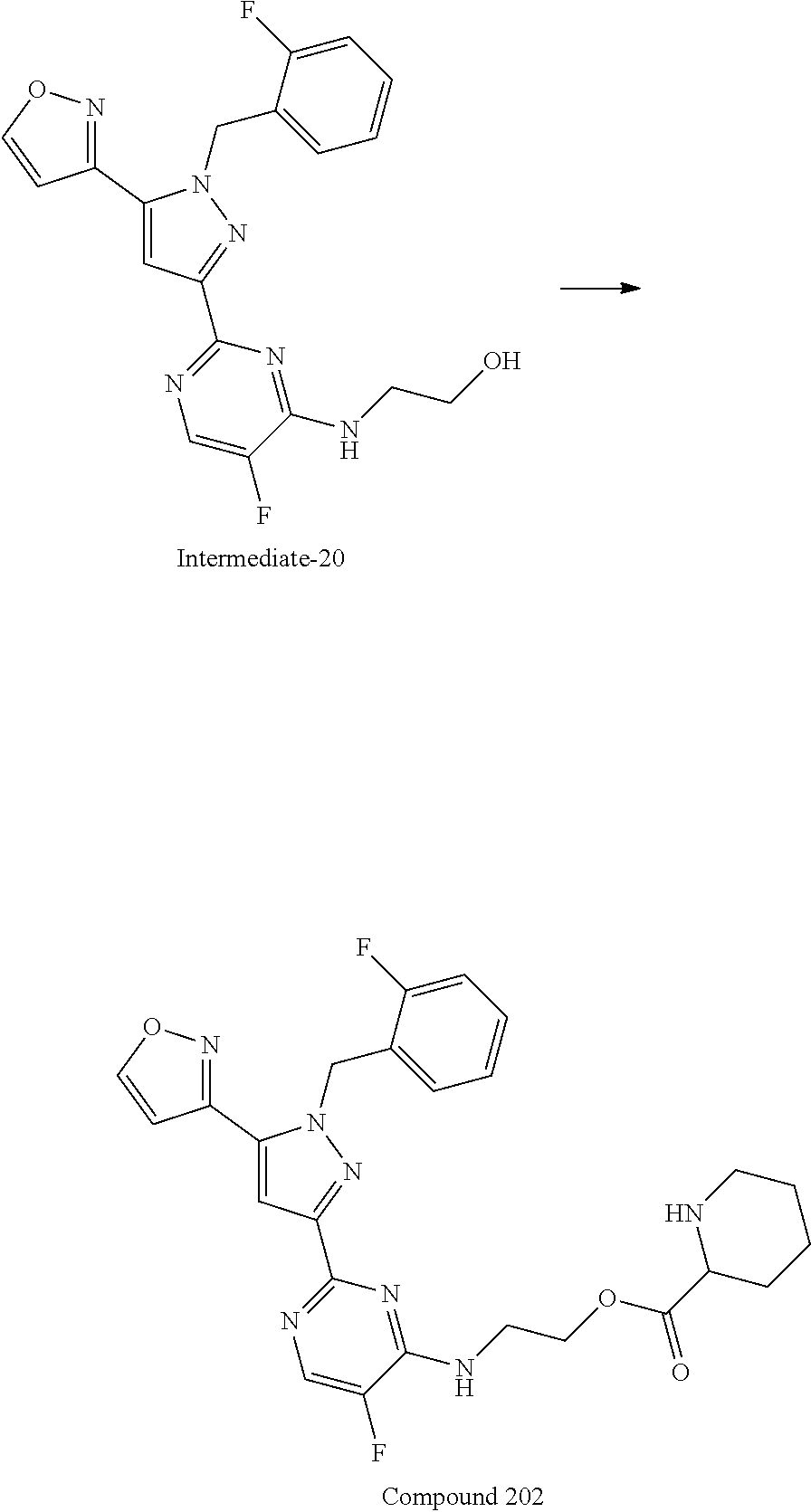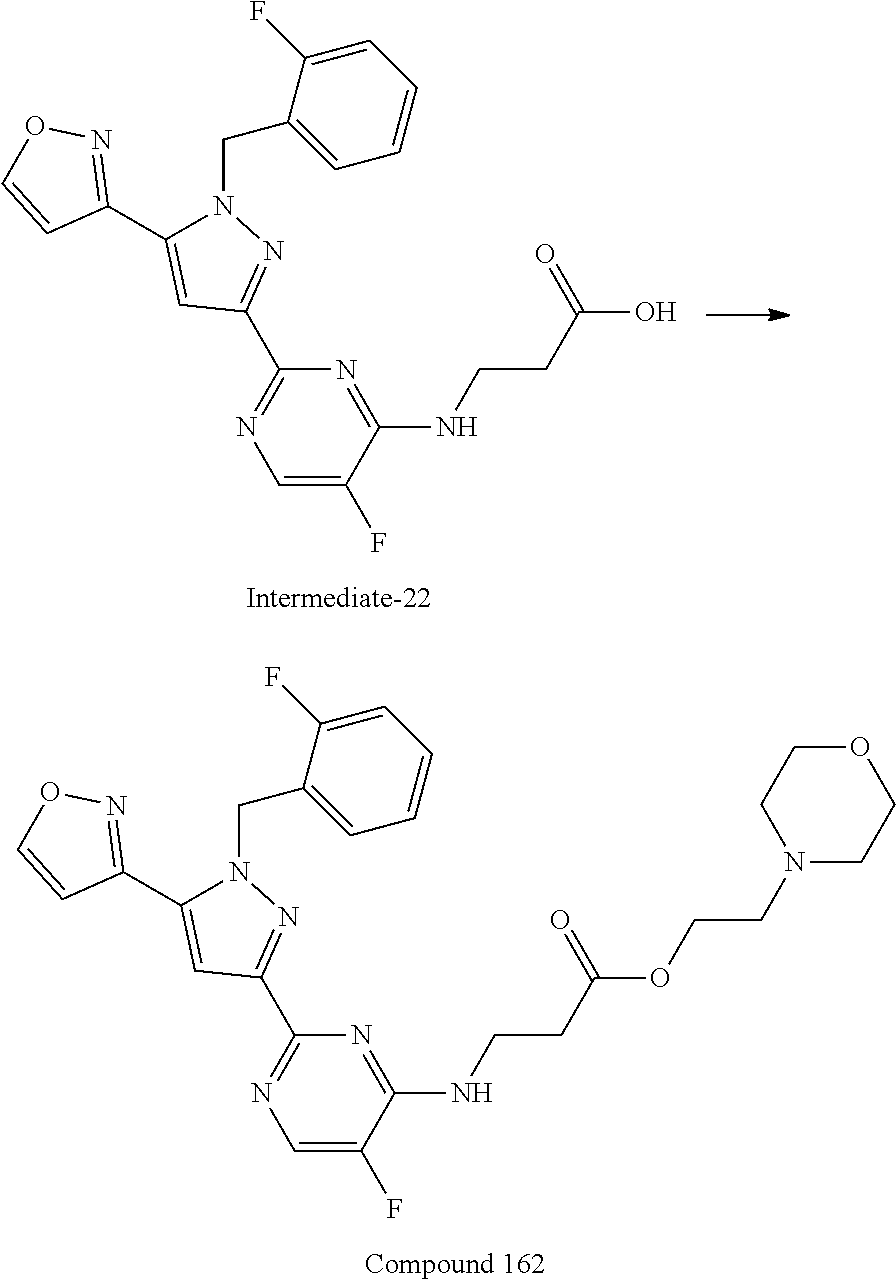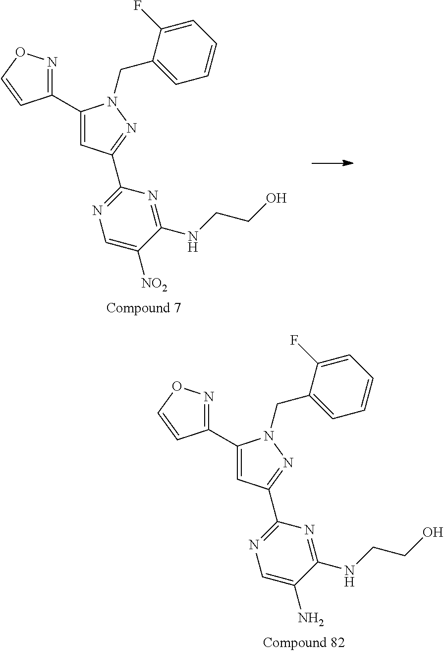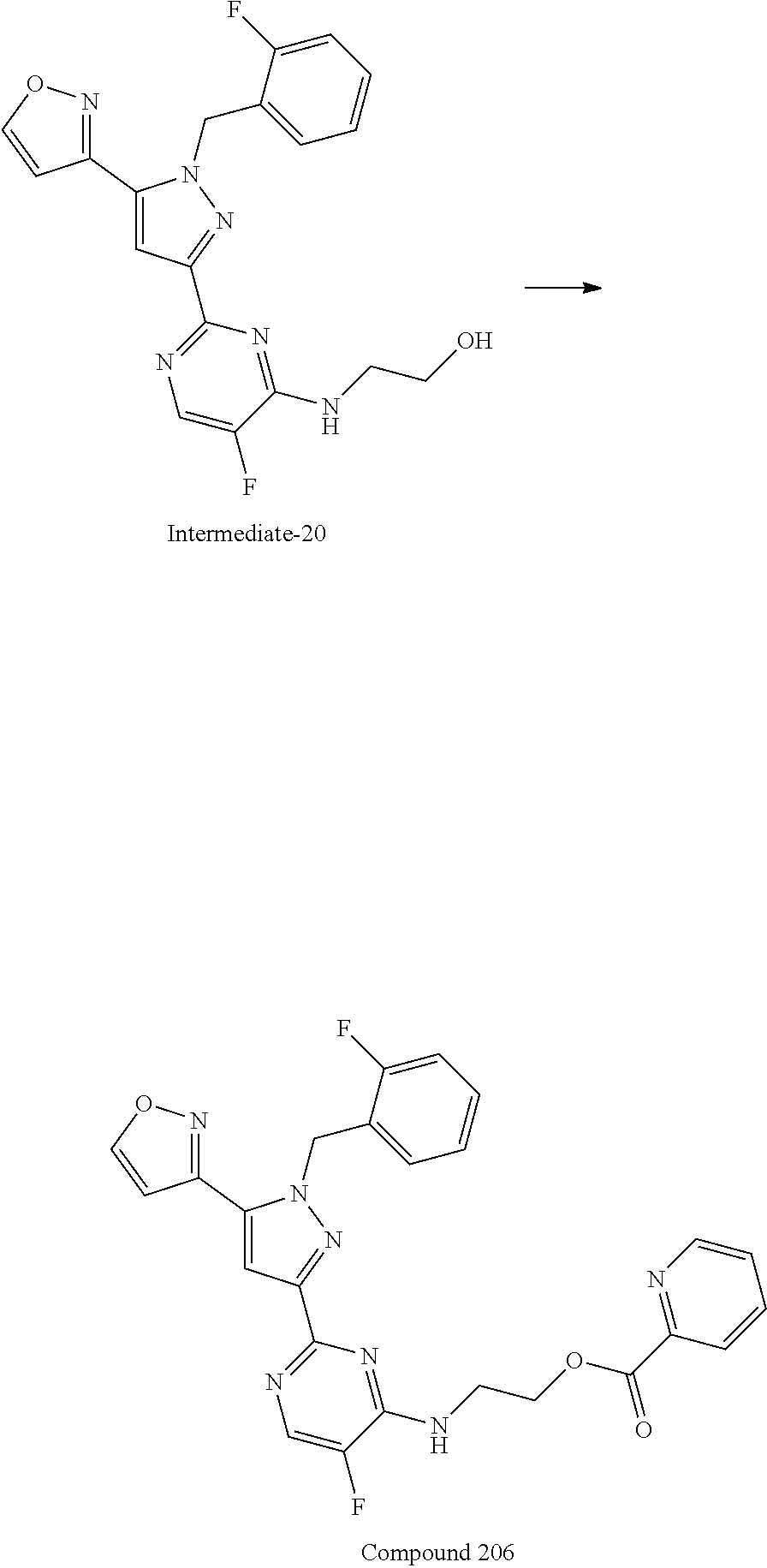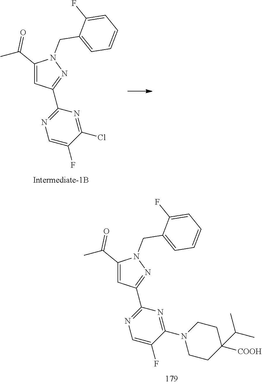 MS: Thermo Vantage Ion Mode: ESI+ Scan Type: MRM Dwell Collision Retention Time Energy Time Compound: Transition (msec) (V) S Lens (min) cGMP 346 > 152 100 32 75 0.6 (+3) cGMP IS 349 > 155 100 32 75 0.6 HPLC: Waters Acquity UPLC Column: Thermo Hypersil Gold 2.1 × 50 mm 1.9 micron particle size Flow Rate: 750 uL/min Column Temperature: RT Autosampler Temperature: 6° C. Injection Volume: 20 uL Mobile Phases: A = 100% Water + 0.1% Formic Acid B = 100% Acetonitrile + 0.1% Formic Acid Gradient: Time (min) % A % B 0 100 0 0.2 100 0 0.3 50 50 0.7 50 50 0.8 100 0 Whole cell activity in the HEK assay with LC/MS detection (updated assay conditions, Example 2A). Absolute Absolute EC50 (nM)- EC50 (nM)- Compound binned (~) Compound binned (~) 1 C 51 B 52 A 3 ND 4 C 54 A 5 C 55 B 6 C 56 C 7 ND 57 ND 8 B 9 C 59 B 10 C 60 A 11 C 61 C 12 ND 62 C 13 C 64 B 14 B 65 A 15 A 66 C 16 B 67 B 17 ND 68 B 19 C 69 A 20 ND 70 B 21 C 71 B 22 C 72 B 73 C 24 B 74 B 25 NA 75 B 26 B 76 B 27 C 77 C 28 A 78 C 29 A 79 B 30 B 80 B 81 C 32 B 82 33 C 83 C 34 B 84 C 35 C 85 B 36 B 86 C 37 ND 87 B 38 B 88 B 39 C 89 B 40 C 90 A 41 C 91 B 42 B 92 C 43 C 93 B 44 A 94 C 45 C 95 B 46 C 96 B 47 B 97 C 48 C 98 C 49 C 99 B 50 C 106 A 102 B 107 A 103 B 108 B 109 B 105 ND 179 B 150 A 112 B 151 A 113 B 152 A 114 C 131 B 115 C 194 C 116 B 127 A 117 B 125 C 180 B 153 B 181 B 126 ND 118 C 154 B 119 C 193 C 120 ND 155 B 121 C 195 C 122 C 156 B 135 B 196 ND 136 B 199 B 139 B 200 C 140 C 202 B 137 B 157 C 138 B 158 C 123 B 206 A 124 C 162 B 129 C 163 A 182 C 164 A 183 C 165 B 184 C 159 ND 147 C 160 B 148 A 161 B 149 A 166 C 130 B 195 C 194 C (~) Code definitions for the sGC enzyme activity values, expressed as Absolute EC50which is defined as the concentration at which a given compound elicits 50% of the high control response (Compound Y). Compounds failing to elicit a minimum response of 50% are reported as > 30 μM or ND. EC50Abs ≤ 100 nM = A; 100 nM < EC50Abs ≤ 1000 nM = B; 1000 nM < EC50Abs = C. Example 2B: Biological Activity Measurement by the cGMP GloSensor Cell-Based Assay, 384-Well Format