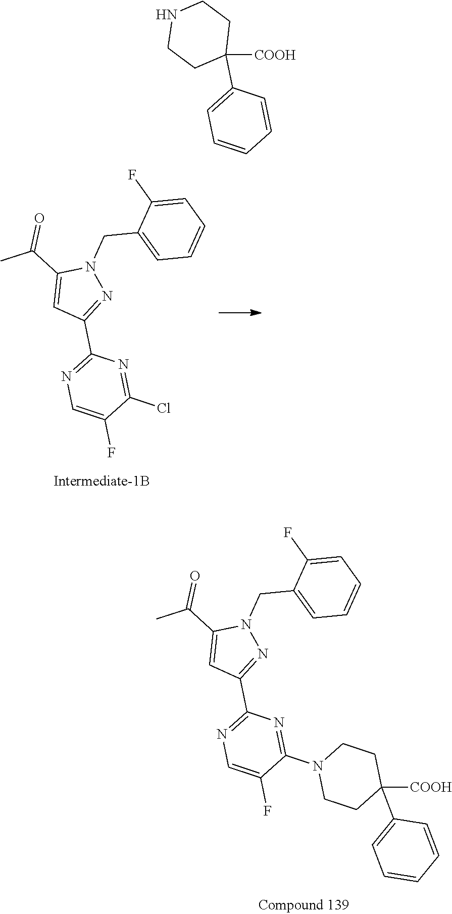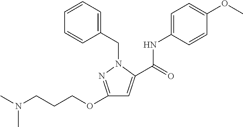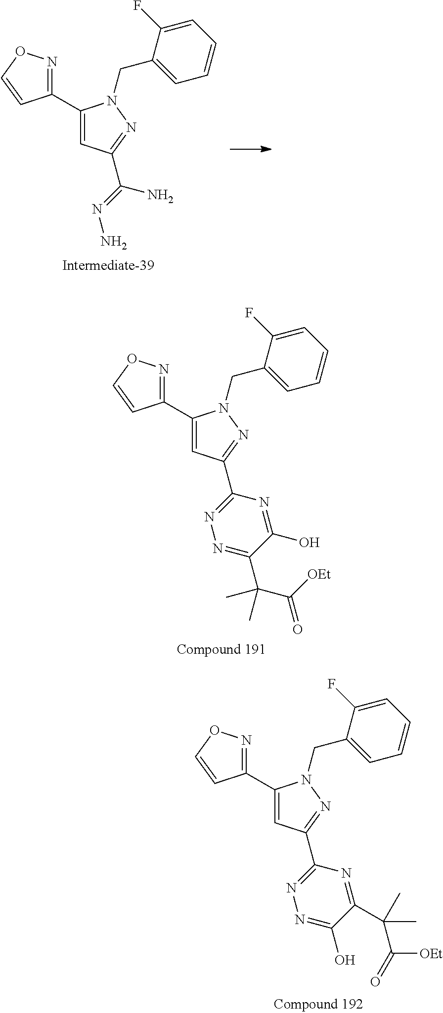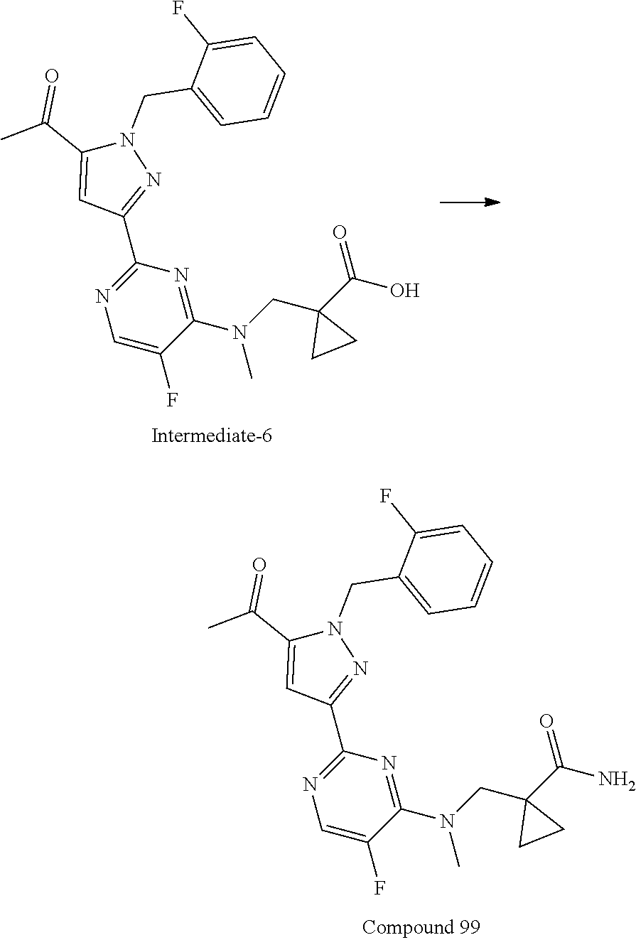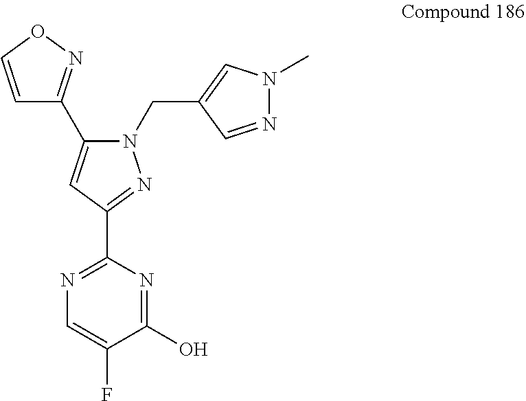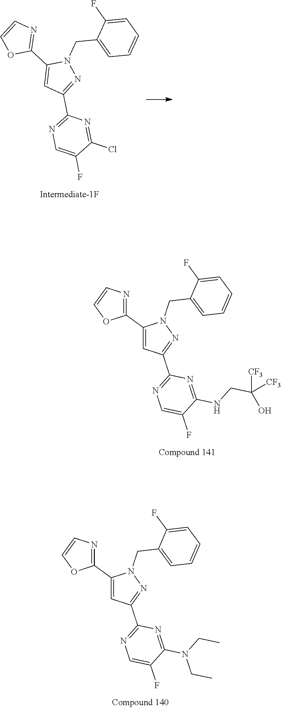 MS: Thermo Vantage Ion Mode: ESI+ Scan Type: MRM Dwell Collision Retention Time Energy Time Compound: Transition (msec) (V) S Lens (min) cGMP 346 > 152 100 32 75 0.6 (+3) cGMP IS 349 > 155 100 32 75 0.6 HPLC: Waters Acquity UPLC Column: Thermo Hypersil Gold 2.1 × 50 mm 1.9 micron particle size Flow Rate: 750 uL/min Column Temperature: RT Autosampler Temperature: 6° C. Injection Volume: 20 uL Mobile Phases: A = 100% Water + 0.1% Formic Acid B = 100% Acetonitrile + 0.1% Formic Acid Gradient: Time (min) % A % B 0 100 0 0.2 100 0 0.3 50 50 0.7 50 50 0.8 100 0 Whole cell activity in the HEK assay with LC/MS detection (updated assay conditions, Example 2A). Absolute Absolute EC50 (nM)- EC50 (nM)- Compound binned (~) Compound binned (~) 1 C 51 B 52 A 3 ND 4 C 54 A 5 C 55 B 6 C 56 C 7 ND 57 ND 8 B 9 C 59 B 10 C 60 A 11 C 61 C 12 ND 62 C 13 C 64 B 14 B 65 A 15 A 66 C 16 B 67 B 17 ND 68 B 19 C 69 A 20 ND 70 B 21 C 71 B 22 C 72 B 73 C 24 B 74 B 25 NA 75 B 26 B 76 B 27 C 77 C 28 A 78 C 29 A 79 B 30 B 80 B 81 C 32 B 82 33 C 83 C 34 B 84 C 35 C 85 B 36 B 86 C 37 ND 87 B 38 B 88 B 39 C 89 B 40 C 90 A 41 C 91 B 42 B 92 C 43 C 93 B 44 A 94 C 45 C 95 B 46 C 96 B 47 B 97 C 48 C 98 C 49 C 99 B 50 C 106 A 102 B 107 A 103 B 108 B 109 B 105 ND 179 B 150 A 112 B 151 A 113 B 152 A 114 C 131 B 115 C 194 C 116 B 127 A 117 B 125 C 180 B 153 B 181 B 126 ND 118 C 154 B 119 C 193 C 120 ND 155 B 121 C 195 C 122 C 156 B 135 B 196 ND 136 B 199 B 139 B 200 C 140 C 202 B 137 B 157 C 138 B 158 C 123 B 206 A 124 C 162 B 129 C 163 A 182 C 164 A 183 C 165 B 184 C 159 ND 147 C 160 B 148 A 161 B 149 A 166 C 130 B 195 C 194 C (~) Code definitions for the sGC enzyme activity values, expressed as Absolute EC50which is defined as the concentration at which a given compound elicits 50% of the high control response (Compound Y). Compounds failing to elicit a minimum response of 50% are reported as > 30 μM or ND. EC50Abs ≤ 100 nM = A; 100 nM < EC50Abs ≤ 1000 nM = B; 1000 nM < EC50Abs = C. Example 2B: Biological Activity Measurement by the cGMP GloSensor Cell-Based Assay, 384-Well Format