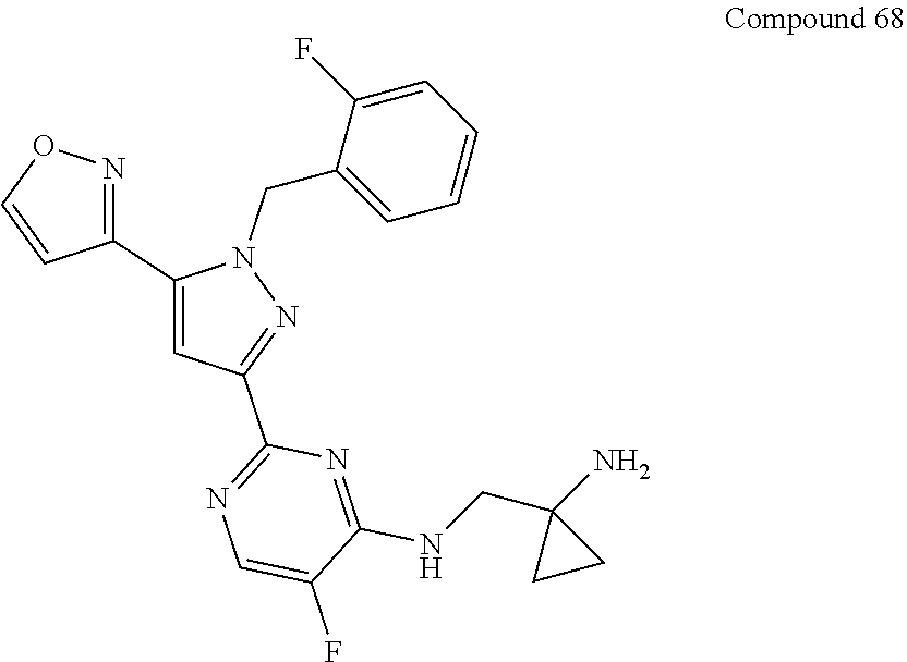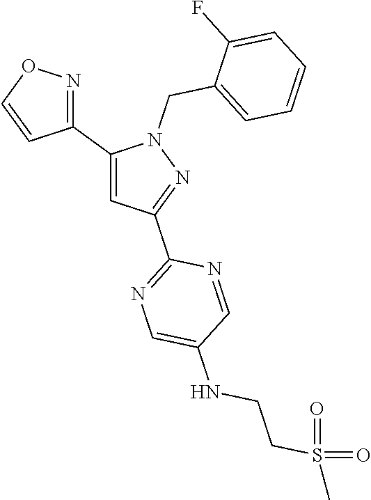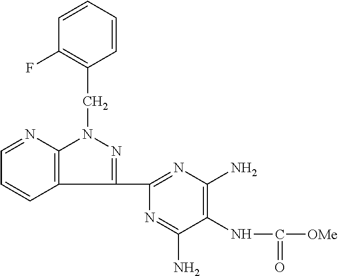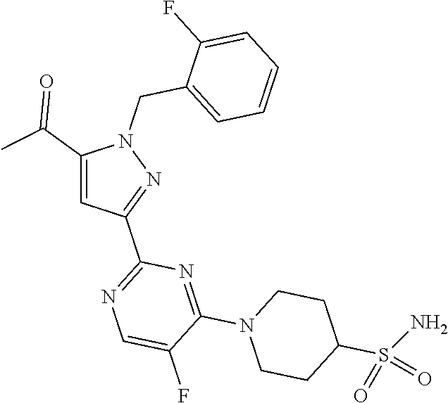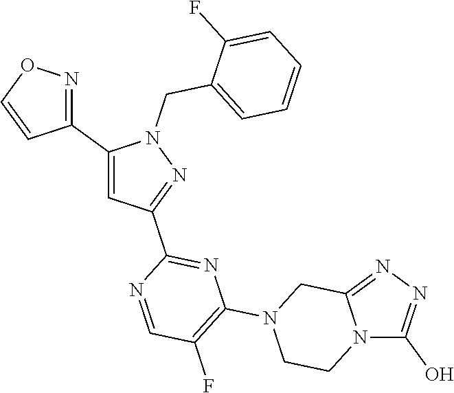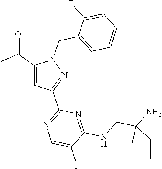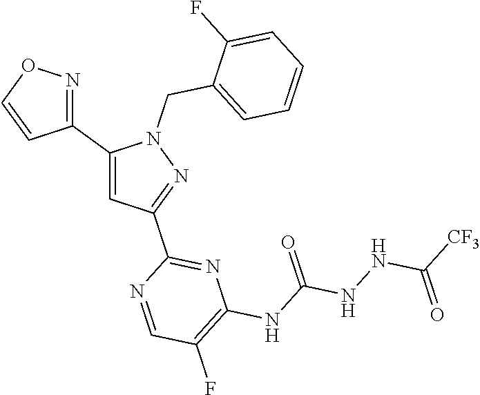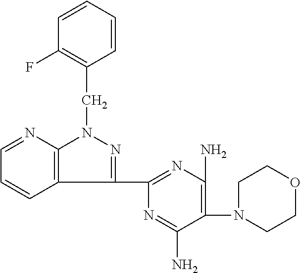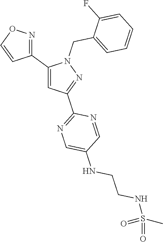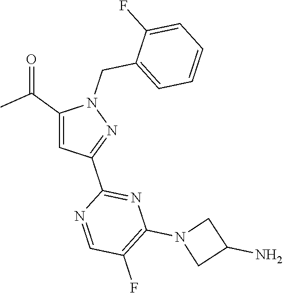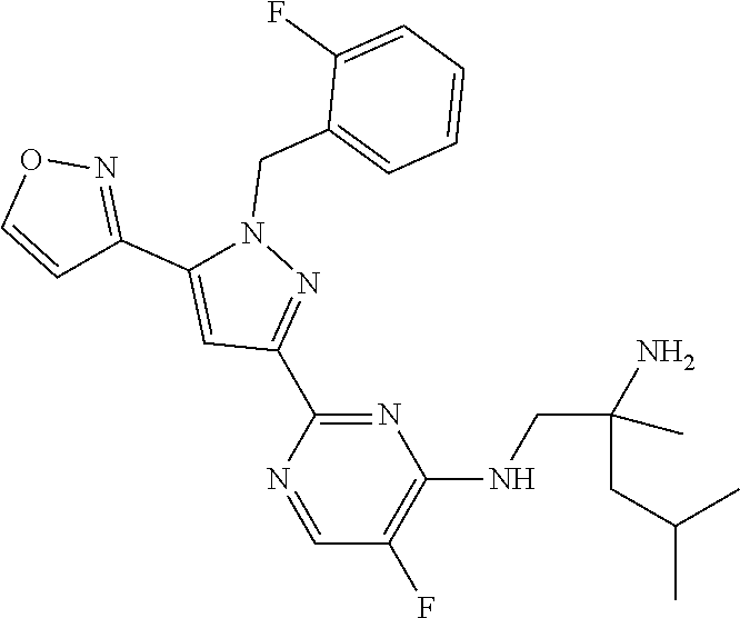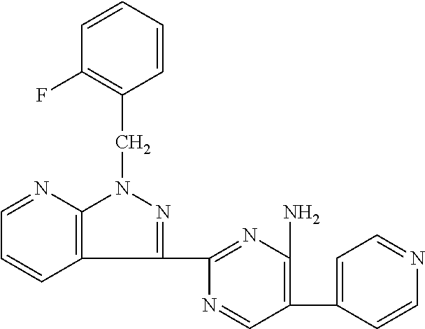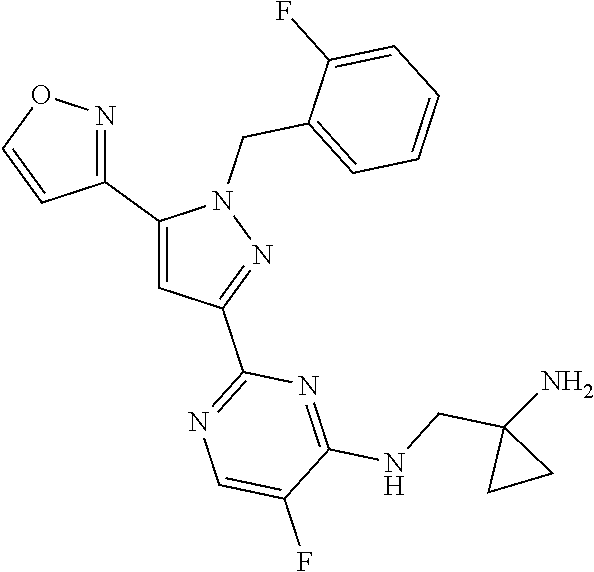 For the kinetics studies, luminescense was measured right away for 0.2 sec per well with Envision (Perkin Elmer model No). For endpoint SAR screening, data were collected after 55 min incubation at room temperature. Data analysis was carried out as indicated above in Example 2A. Thoracic aortic rings are dissected from anesthetized (isoflurane) male Sprague-Dawley rats weighing 275-299 g. Tissues are immediately transferred to ice-cold Krebs-Henseleit solution, which has been aerated with 95% O2and 5% CO2for 30 minutes. Following removal of connective tissue, aortic sections are cut into 4 rings (˜2 mm each) and suspended on 2 L-shaped hooks, with one hook fixed at the bottom of the tissue bath (Schuler Organ Bath, Harvard Apparatus) and the other connected to a force transducer (F30 Force Transducer, Harvard Apparatus). Baths containing Krebs Henseleit solution (10 mL) are heated to 37° C. and aerated with 95% O2and 5% CO2. Rings are brought to an initial tension of 0.3-0.5 g and gradually raised to a resting tension of 1.0 g over 60 minutes. Rings are rinsed with Krebs Henseleit solution (heated to 37° C. and aerated with 95% O2 and 5% CO2) at 15 minute intervals until a stable baseline is obtained. Rings are considered to be stable after a resting tension of 1.0 g is maintained (for approximately 10 minutes) without need for adjustment. Rings are then contracted with 100 ng/mL phenylephrine by adding 100 uL of a 10 μg/mL phenylephrine stock solution. Tissues achieving a stable contraction are then treated in a cumulative, dose dependent manner with test compounds prepared in dimethylsulfoxide (DMSO). In some cases, tissues are rinsed three times over a 5 minute period with Krebs-Heinseleit's solution (heated to 37° C. and aerated with 95% O2 and 5% CO2), allowed to stabilize at baseline, and then used for characterization of other test articles or DMSO effects. All data are collected using the HSE-ACAD software provided by Harvard Apparatus. Percent relaxation effects are calculated in Microsoft Excel using the recorded tension value of 100 ng/mL phenylephrine treatment as 0% inhibition and treatment with 100 μM 3-isobutyl-1-methylxanthine as 100% inhibition. EC50 values are calculated from concentration-response curves generated with GraphPad Prism Software. As an alternative thoracic aortic rings assay, the procedure of Example 3 is used except that percent relaxation effects are calculated in Microsoft Excel using the recorded tension value of 100 ng/mL phenylephrine treatment as 0% inhibition and, after washing the tissue with buffer, the original resting tension of the tissue is used as 100% inhibition. Male rats (250-350 g body weight, supplied by Harlan Laboratories) were anesthetized with ketamine/xylazine and a heparinized saline fluid filled catheter implanted into the right femoral artery. The catheter was exteriorized between the scapula, capped, and the animal allowed to recover for at least 7 days post surgery prior to any compound testing. Prior to testing animals were maintained on normal diet, with free access to drinking water, under a 12 hour light-dark cycle. On the day of experimentation, under inhaled isoflurane anesthesia, the catheter was uncapped and connected to a tether (Instech Labs) and pressure transducer (Harvard Apparatus). Blood pressure and heart rate were subsequently captured and analyzed with a dedicated data capture system (PowerLab, ADInstruments). Data sampling rates were set at 1 cycle per second. Once connected, each rat was allowed to recover from anesthesia and baseline blood pressure and heart rate levels were established in these conscious, freely-moving animals. Once baseline was established either vehicle (0.5% methylcellulose or 100% PEG400) or test article was administered orally (PO, 10 mg/kg) and the effects on blood pressure and heart rate monitored for up to 24 hours. Data are reported as hourly averages and changes in blood pressure are calculated from subtracting individual baseline on an hourly basis (Table 4) Purified human recombinant soluble guanylate cyclase enzyme α1β1 (h sGC) obtained from Enzo Life Sciences (P/N: ALX-201-177) was used to evaluate the activity of test compounds. The assay reactions contained 0.1 M Tris (pH 8.0), 0.5 mg/mL BSA, 2 mM DTT, 4 mM MgCl2, 30 uM DETA NONOate (Enzo Life Science P/N: ALX-430-014), and 12.5 ng/ml human soluble guanylate cyclase enzyme. Test compounds in DMSO were then added (in a 3-fold titration of compound over a 10-point curve starting at 30 uM final concentration, all samples had a 3% DMSO final concentration). Guanosine 5′-triphosphate (Sigma-Aldrich P/N: G8877) was added to a final concentration of 300 μM and enzyme reactions were incubated (100 μL, 384-well plate format) at 37° C. for 20 minutes. The controls contained 3% DMSO (low control), or 30 uM of Compound Y (high control). After the 20 minute incubation, the reaction was stopped with the addition of 100 μL of ice cold 20% acetic acid. cGMP concentrations in all samples were determined using the cGMP HTRF (Cisbio P/N: 62GM2PEC) assay per manufacturer's instructions. A cGMP standard curve was fit using a 4-parameter fit (log(inhibitor) vs. response—variable slope) using GraphPad Prism Software v.6. Samples were diluted appropriately to ensure that values fell within the linear range of the standard curve. Data were fit using a 4-parameter fit (log(agonist) vs. response—variable slope) using GraphPad Prism Software v.6. The EC50was interpolated from the curve fit and is defined as the concentration at which the compound elicits 50% of the maximal response of the 30 uM of Compound Y, the high control compound. (“Inhaled Agonists of Soluble Guanylate Cyclase Induce Selective Pulmonary Vasodilation”, Oleg V. et al, American J of Resp and Critical Care Medicine, Vol 176, 2007, p 1138) It is possible to test whether inhalation of novel dry-powder microparticle formulations containing sGC stimulators would 