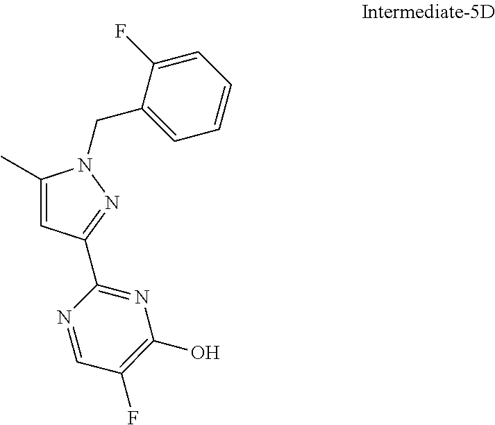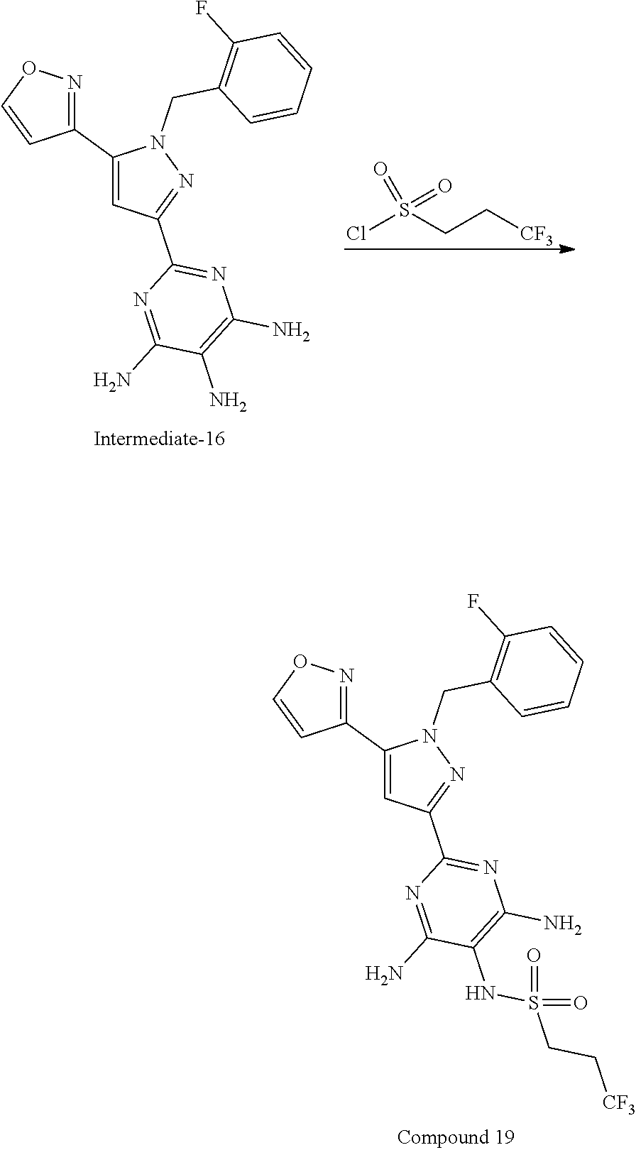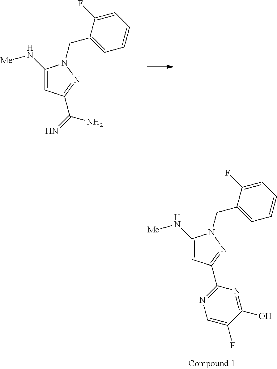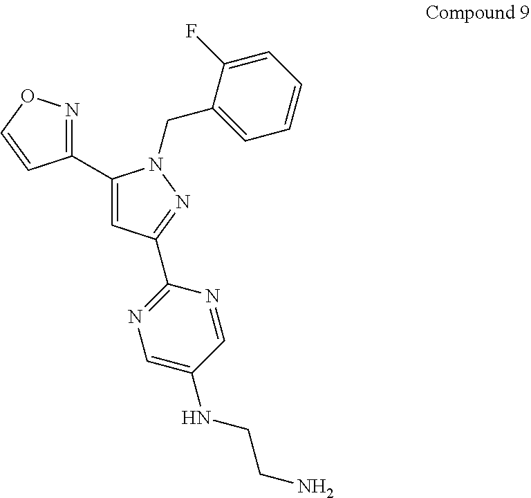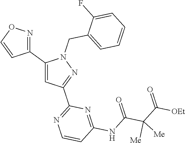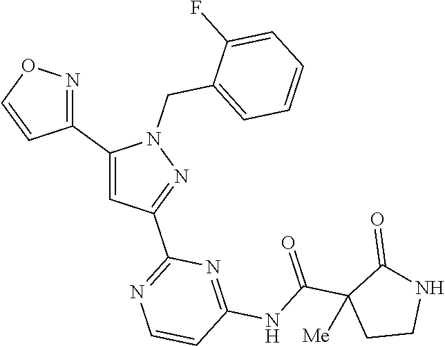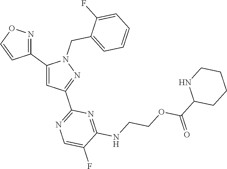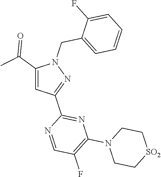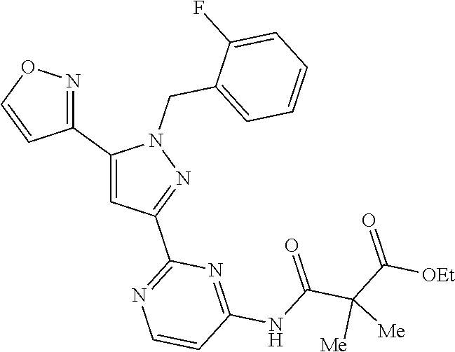For the kinetics studies, luminescense was measured right away for 0.2 sec per well with Envision (Perkin Elmer model No). For endpoint SAR screening, data were collected after 55 min incubation at room temperature. Data analysis was carried out as indicated above in Example 2A. Thoracic aortic rings are dissected from anesthetized (isoflurane) male Sprague-Dawley rats weighing 275-299 g. Tissues are immediately transferred to ice-cold Krebs-Henseleit solution, which has been aerated with 95% O2and 5% CO2for 30 minutes. Following removal of connective tissue, aortic sections are cut into 4 rings (˜2 mm each) and suspended on 2 L-shaped hooks, with one hook fixed at the bottom of the tissue bath (Schuler Organ Bath, Harvard Apparatus) and the other connected to a force transducer (F30 Force Transducer, Harvard Apparatus). Baths containing Krebs Henseleit solution (10 mL) are heated to 37° C. and aerated with 95% O2and 5% CO2. Rings are brought to an initial tension of 0.3-0.5 g and gradually raised to a resting tension of 1.0 g over 60 minutes. Rings are rinsed with Krebs Henseleit solution (heated to 37° C. and aerated with 95% O2 and 5% CO2) at 15 minute intervals until a stable baseline is obtained. Rings are considered to be stable after a resting tension of 1.0 g is maintained (for approximately 10 minutes) without need for adjustment. Rings are then contracted with 100 ng/mL phenylephrine by adding 100 uL of a 10 μg/mL phenylephrine stock solution. Tissues achieving a stable contraction are then treated in a cumulative, dose dependent manner with test compounds prepared in dimethylsulfoxide (DMSO). In some cases, tissues are rinsed three times over a 5 minute period with Krebs-Heinseleit's solution (heated to 37° C. and aerated with 95% O2 and 5% CO2), allowed to stabilize at baseline, and then used for characterization of other test articles or DMSO effects. All data are collected using the HSE-ACAD software provided by Harvard Apparatus. Percent relaxation effects are calculated in Microsoft Excel using the recorded tension value of 100 ng/mL phenylephrine treatment as 0% inhibition and treatment with 100 μM 3-isobutyl-1-methylxanthine as 100% inhibition. EC50 values are calculated from concentration-response curves generated with GraphPad Prism Software. As an alternative thoracic aortic rings assay, the procedure of Example 3 is used except that percent relaxation effects are calculated in Microsoft Excel using the recorded tension value of 100 ng/mL phenylephrine treatment as 0% inhibition and, after washing the tissue with buffer, the original resting tension of the tissue is used as 100% inhibition. Male rats (250-350 g body weight, supplied by Harlan Laboratories) were anesthetized with ketamine/xylazine and a heparinized saline fluid filled catheter implanted into the right femoral artery. The catheter was exteriorized between the scapula, capped, and the animal allowed to recover for at least 7 days post surgery prior to any compound testing. Prior to testing animals were maintained on normal diet, with free access to drinking water, under a 12 hour light-dark cycle. On the day of experimentation, under inhaled isoflurane anesthesia, the catheter was uncapped and connected to a tether (Instech Labs) and pressure transducer (Harvard Apparatus). Blood pressure and heart rate were subsequently captured and analyzed with a dedicated data capture system (PowerLab, ADInstruments). Data sampling rates were set at 1 cycle per second. Once connected, each rat was allowed to recover from anesthesia and baseline blood pressure and heart rate levels were established in these conscious, freely-moving animals. Once baseline was established either vehicle (0.5% methylcellulose or 100% PEG400) or test article was administered orally (PO, 10 mg/kg) and the effects on blood pressure and heart rate monitored for up to 24 hours. Data are reported as hourly averages and changes in blood pressure are calculated from subtracting individual baseline on an hourly basis (Table 4) Purified human recombinant soluble guanylate cyclase enzyme α1β1 (h sGC) obtained from Enzo Life Sciences (P/N: ALX-201-177) was used to evaluate the activity of test compounds. The assay reactions contained 0.1 M Tris (pH 8.0), 0.5 mg/mL BSA, 2 mM DTT, 4 mM MgCl2, 30 uM DETA NONOate (Enzo Life Science P/N: ALX-430-014), and 12.5 ng/ml human soluble guanylate cyclase enzyme. Test compounds in DMSO were then added (in a 3-fold titration of compound over a 10-point curve starting at 30 uM final concentration, all samples had a 3% DMSO final concentration). Guanosine 5′-triphosphate (Sigma-Aldrich P/N: G8877) was added to a final concentration of 300 μM and enzyme reactions were incubated (100 μL, 384-well plate format) at 37° C. for 20 minutes. The controls contained 3% DMSO (low control), or 30 uM of Compound Y (high control). After the 20 minute incubation, the reaction was stopped with the addition of 100 μL of ice cold 20% acetic acid. cGMP concentrations in all samples were determined using the cGMP HTRF (Cisbio P/N: 62GM2PEC) assay per manufacturer's instructions. A cGMP standard curve was fit using a 4-parameter fit (log(inhibitor) vs. response—variable slope) using GraphPad Prism Software v.6. Samples were diluted appropriately to ensure that values fell within the linear range of the standard curve. Data were fit using a 4-parameter fit (log(agonist) vs. response—variable slope) using GraphPad Prism Software v.6. The EC50was interpolated from the curve fit and is defined as the concentration at which the compound elicits 50% of the maximal response of the 30 uM of Compound Y, the high control compound. (“Inhaled Agonists of Soluble Guanylate Cyclase Induce Selective Pulmonary Vasodilation”, Oleg V. et al, American J of Resp and Critical Care Medicine, Vol 176, 2007, p 1138) It is possible to test whether inhalation of novel dry-powder microparticle formulations containing sGC stimulators would 