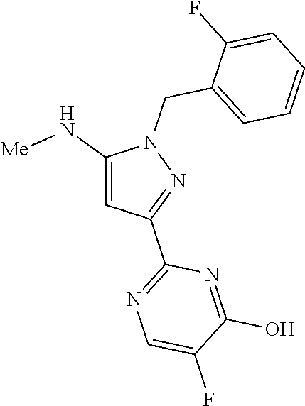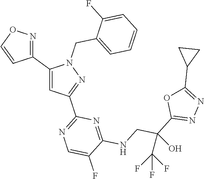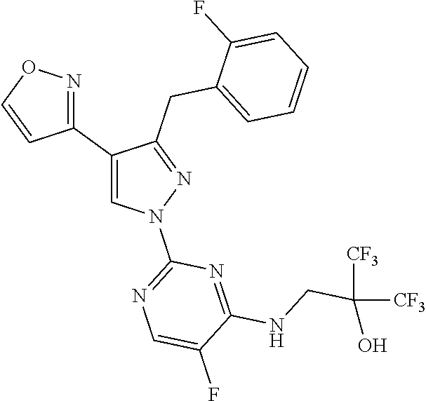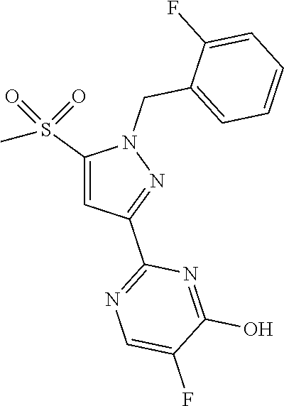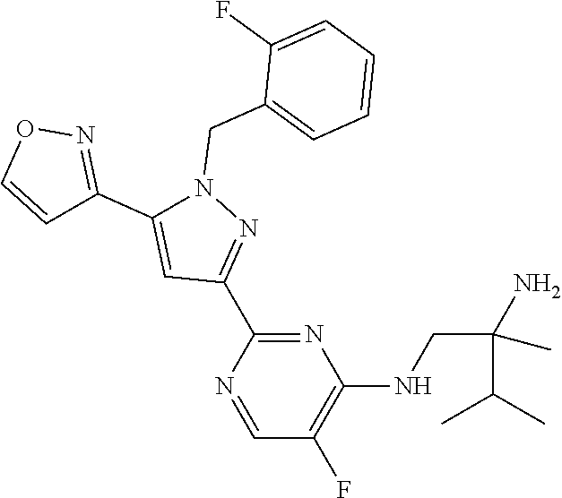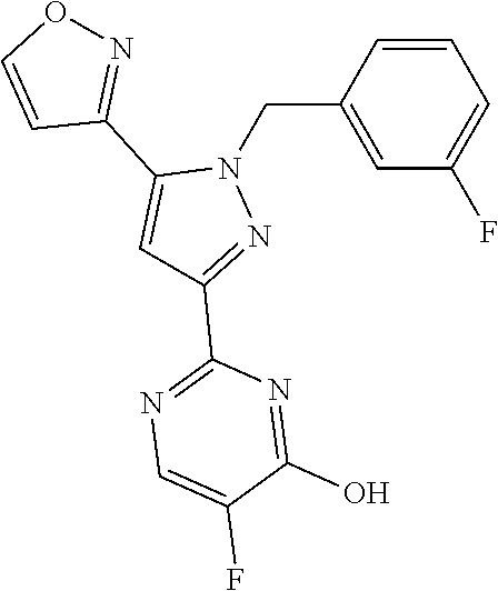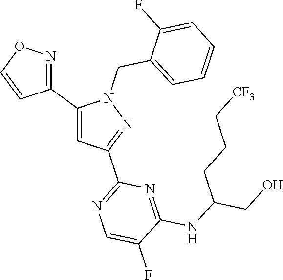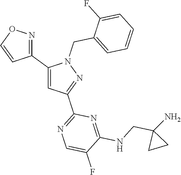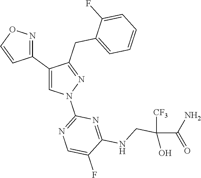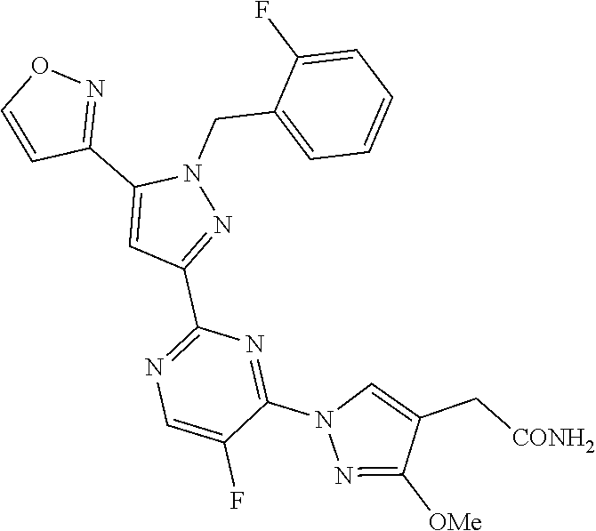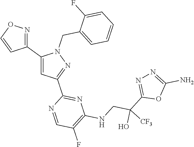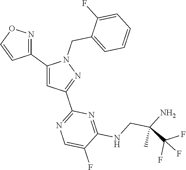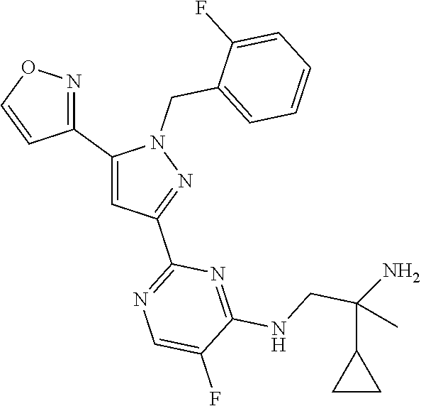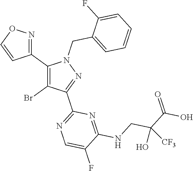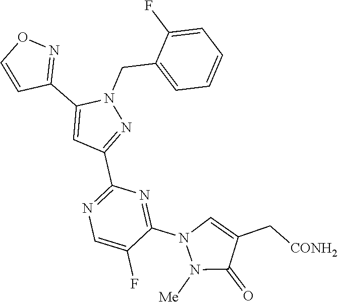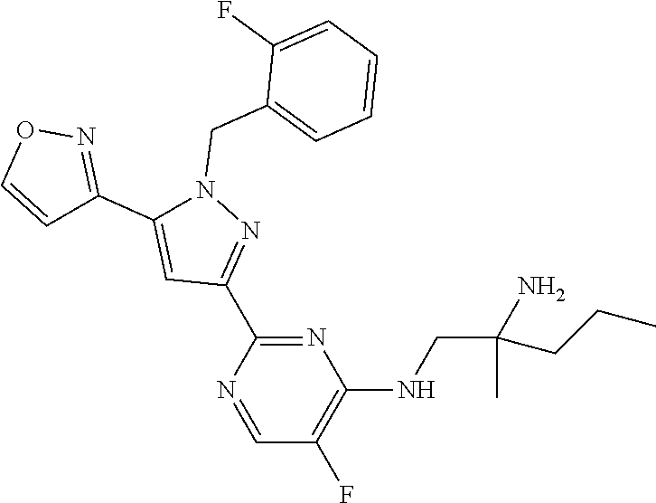 were then added to the assay mixture and the resulting mixture incubated at 37° C. for 20 minutes. After the 20 minute incubation, the assay mixture was aspirated and 10% acetic acid containing 150 ng/mL+3-cGMP (internal standard for LCMS) (50 μL) was added to the cells. The plate was incubated at 4° C. for 30 minutes in the acetic acid solution to stop the reaction and lyse the cells. The plates were then centrifuged at 1,000 g for 3 minutes at 4° C. and the supernatant transferred to a clean reaction plate for LCMS analysis. cGMP concentrations were determined from each sample using the LCMS conditions below (Table 2) and calculated standard curve. The standard curve was prepared in 10% acetic acid with 150 ng/mL+3cGMP (isotopically labelled cGMP with a weight 3 units higher than wild type) with the following final concentrations of cGMP in ng/mL: 1, 5, 10, 50, 100, 250, 500, 1000, 2000. Data were normalized to a high control using the following equation: 100*(Sample−Low Control)/(High Control−Low Control), where the low control is the average of 16 samples treated with 1% DMSO, and the high control is the average of 16 samples treated with 30 μM of Compound Y depicted below. Data were fit using a 4-parameter fit (log(agonist) vs. response—variable slope) using GraphPad Prism Software v.5. n=2 for all compounds. The Absolute EC50was interpolated from the curve fit and is defined as the concentration at which a given compound elicits 50% of the high control response. Compounds failing to elicit a minimum response of 50% are reported as >30 μM. For compounds run in duplicate or n higher than 2, the result herein given is the geometric mean of the several results obtained. Table 3 summarizes results obtained for selected compounds of the invention in this assay. Human embryonic kidney cells (HEK293) cells expressing GloSensor™ 40F cGMP (Part No: CS182801, Promega) were used to evaluate the activity of test compounds. The luminescent biosensors (engineered luciferase) that were incorporated into these cells detect cGMP formed by the compounds stimulating the sGC enzyme and emit luminescence. cGMP GloSensor cells were maintained in Dulbecco's Modification of Eagle's Medium (DMEM) supplemented with fetal bovine serum (FBS) (10% final) and hygromycine (200 ug/ml). The day before assay, cells were plated in DMEM with 10% FBS in a 50 μL volume at a density of 1.5×104cells/well in a poly-D-lysine coated 384-well flat white-bottom plate (Corning Cat No 35661). Cells were incubated overnight at 37° C. in a humidified chamber with 5% CO2. The next day, medium was removed and cells were replaced with 40 ul/well of GloSensor™, 2 mM (Promega Cat No E1291). Cells were treated for 90 minutes at 25° C. to allow the substrate to equilibrate in the cells. Test compounds and Diethylenetriamine NONOate (DETA-NONOate) was diluted to 3 mM (20×) in serum-free CO2independent medium and serially diluted at 4× dilutions to create 5× dose curve from which 10 ul was added to the wells (x μM concentration for test compound solution and 10 μM concentration for DETA-NONOate solution; wherein x is one of the following final concentrations).