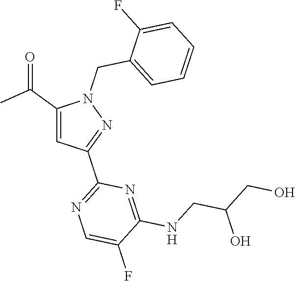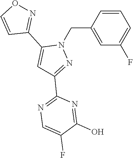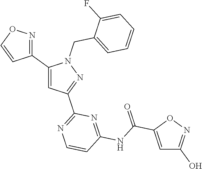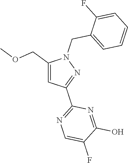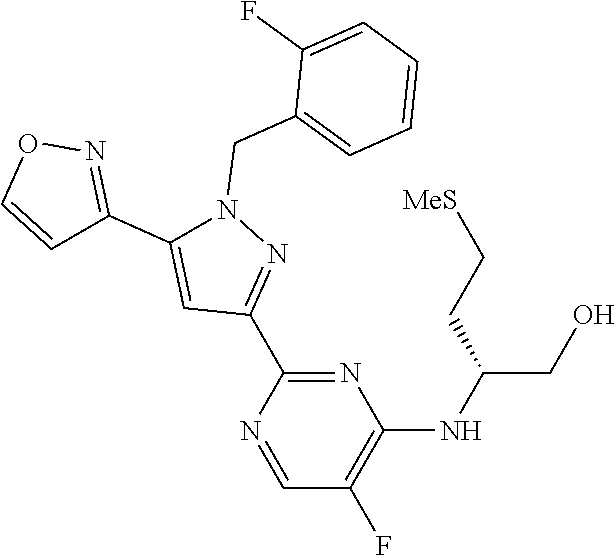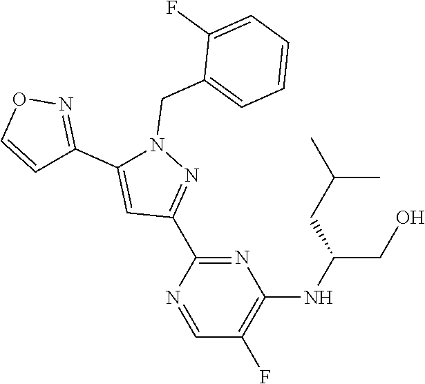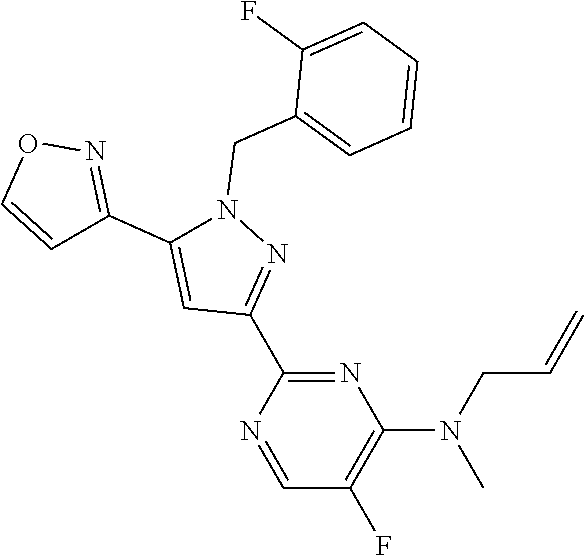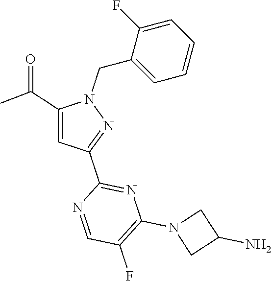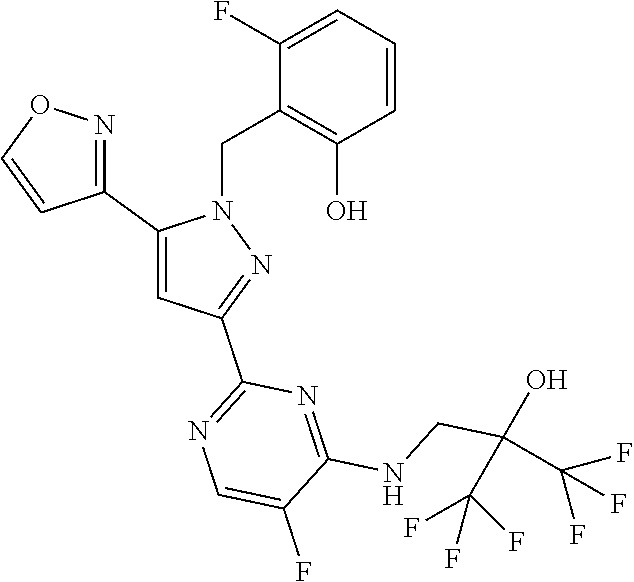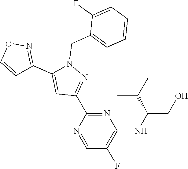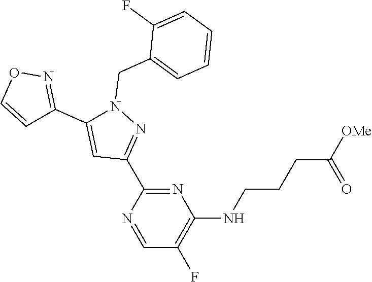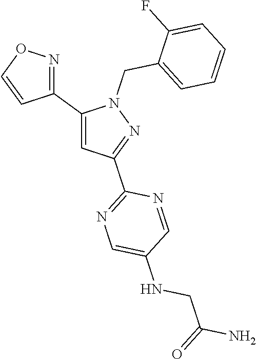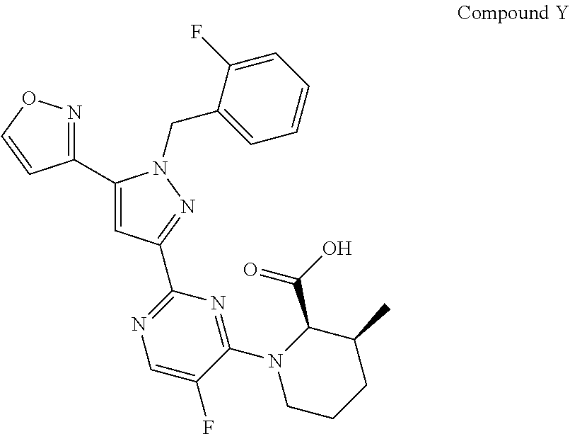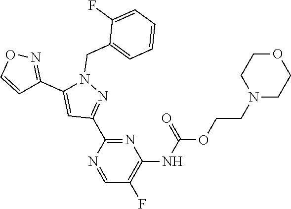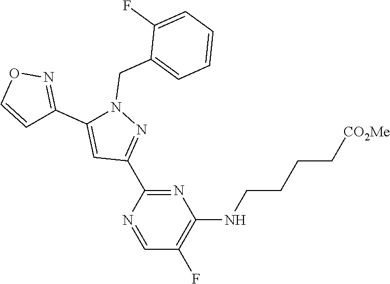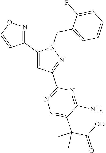 were then added to the assay mixture and the resulting mixture incubated at 37° C. for 20 minutes. After the 20 minute incubation, the assay mixture was aspirated and 10% acetic acid containing 150 ng/mL+3-cGMP (internal standard for LCMS) (50 μL) was added to the cells. The plate was incubated at 4° C. for 30 minutes in the acetic acid solution to stop the reaction and lyse the cells. The plates were then centrifuged at 1,000 g for 3 minutes at 4° C. and the supernatant transferred to a clean reaction plate for LCMS analysis. cGMP concentrations were determined from each sample using the LCMS conditions below (Table 2) and calculated standard curve. The standard curve was prepared in 10% acetic acid with 150 ng/mL+3cGMP (isotopically labelled cGMP with a weight 3 units higher than wild type) with the following final concentrations of cGMP in ng/mL: 1, 5, 10, 50, 100, 250, 500, 1000, 2000. Data were normalized to a high control using the following equation: 100*(Sample−Low Control)/(High Control−Low Control), where the low control is the average of 16 samples treated with 1% DMSO, and the high control is the average of 16 samples treated with 30 μM of Compound Y depicted below. Data were fit using a 4-parameter fit (log(agonist) vs. response—variable slope) using GraphPad Prism Software v.5. n=2 for all compounds. The Absolute EC50was interpolated from the curve fit and is defined as the concentration at which a given compound elicits 50% of the high control response. Compounds failing to elicit a minimum response of 50% are reported as >30 μM. For compounds run in duplicate or n higher than 2, the result herein given is the geometric mean of the several results obtained. Table 3 summarizes results obtained for selected compounds of the invention in this assay. Human embryonic kidney cells (HEK293) cells expressing GloSensor™ 40F cGMP (Part No: CS182801, Promega) were used to evaluate the activity of test compounds. The luminescent biosensors (engineered luciferase) that were incorporated into these cells detect cGMP formed by the compounds stimulating the sGC enzyme and emit luminescence. cGMP GloSensor cells were maintained in Dulbecco's Modification of Eagle's Medium (DMEM) supplemented with fetal bovine serum (FBS) (10% final) and hygromycine (200 ug/ml). The day before assay, cells were plated in DMEM with 10% FBS in a 50 μL volume at a density of 1.5×104cells/well in a poly-D-lysine coated 384-well flat white-bottom plate (Corning Cat No 35661). Cells were incubated overnight at 37° C. in a humidified chamber with 5% CO2. The next day, medium was removed and cells were replaced with 40 ul/well of GloSensor™, 2 mM (Promega Cat No E1291). Cells were treated for 90 minutes at 25° C. to allow the substrate to equilibrate in the cells. Test compounds and Diethylenetriamine NONOate (DETA-NONOate) was diluted to 3 mM (20×) in serum-free CO2independent medium and serially diluted at 4× dilutions to create 5× dose curve from which 10 ul was added to the wells (x μM concentration for test compound solution and 10 μM concentration for DETA-NONOate solution; wherein x is one of the following final concentrations).