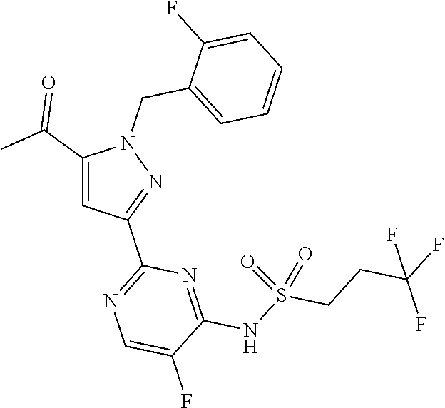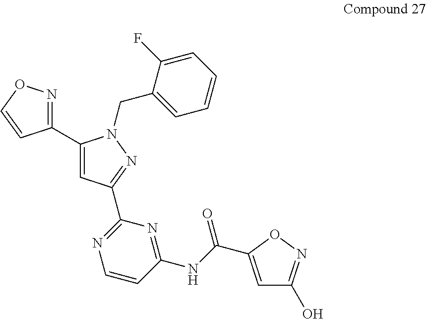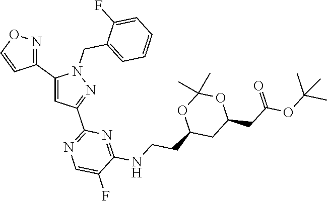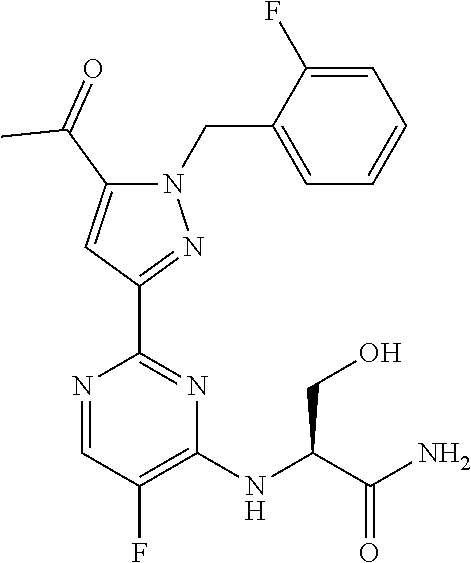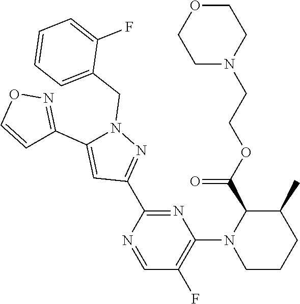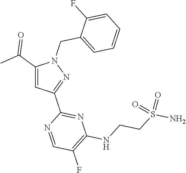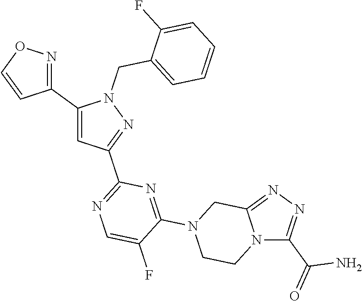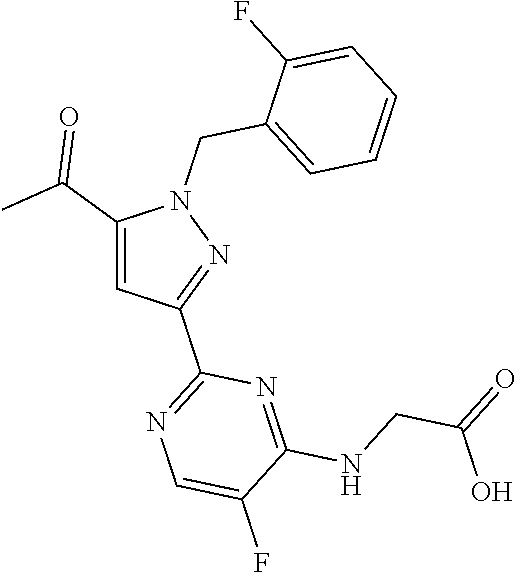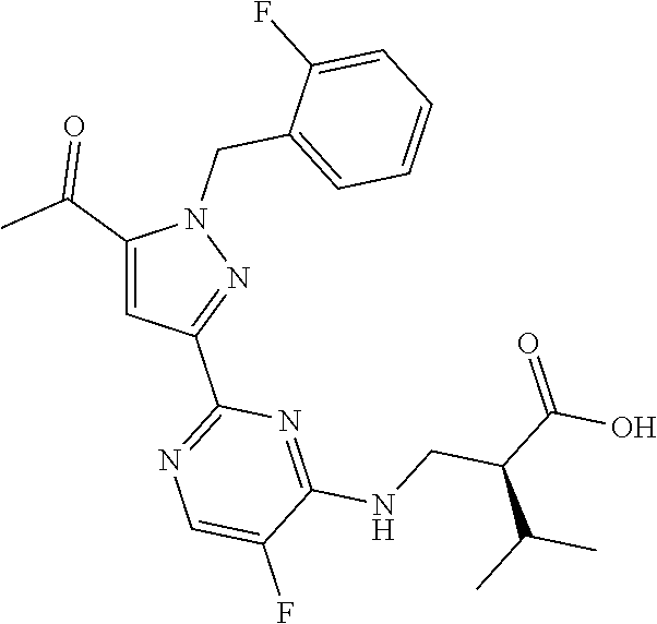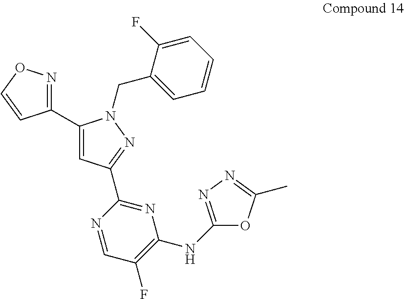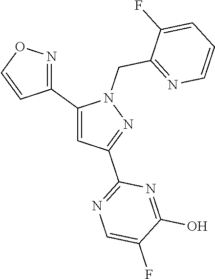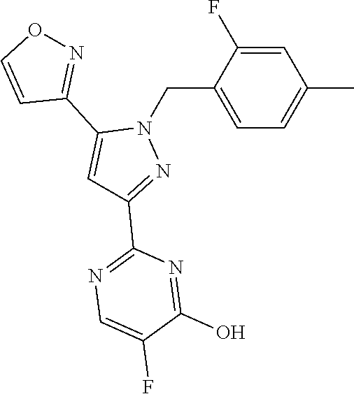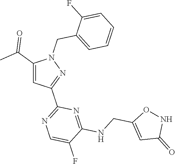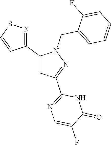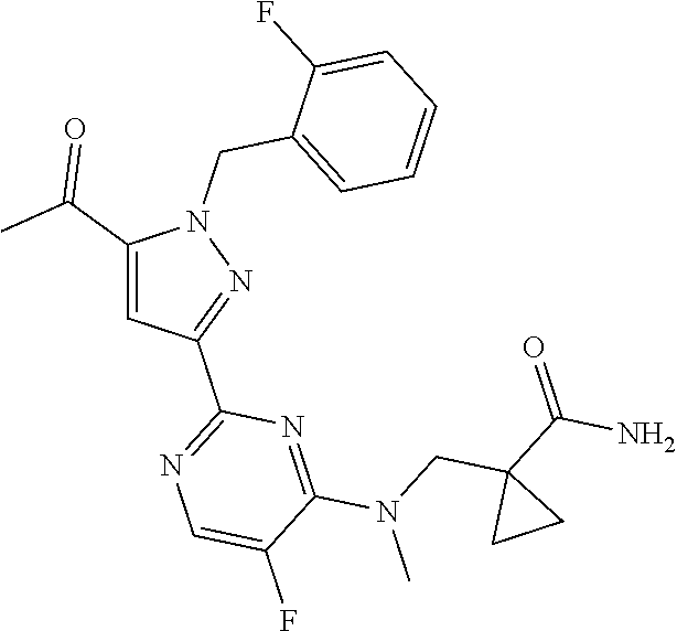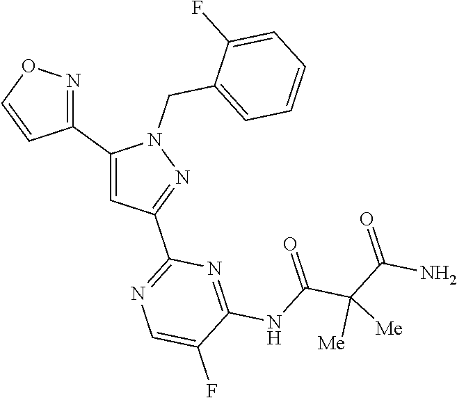 were then added to the assay mixture and the resulting mixture incubated at 37° C. for 20 minutes. After the 20 minute incubation, the assay mixture was aspirated and 10% acetic acid containing 150 ng/mL+3-cGMP (internal standard for LCMS) (50 μL) was added to the cells. The plate was incubated at 4° C. for 30 minutes in the acetic acid solution to stop the reaction and lyse the cells. The plates were then centrifuged at 1,000 g for 3 minutes at 4° C. and the supernatant transferred to a clean reaction plate for LCMS analysis. cGMP concentrations were determined from each sample using the LCMS conditions below (Table 2) and calculated standard curve. The standard curve was prepared in 10% acetic acid with 150 ng/mL+3cGMP (isotopically labelled cGMP with a weight 3 units higher than wild type) with the following final concentrations of cGMP in ng/mL: 1, 5, 10, 50, 100, 250, 500, 1000, 2000. Data were normalized to a high control using the following equation: 100*(Sample−Low Control)/(High Control−Low Control), where the low control is the average of 16 samples treated with 1% DMSO, and the high control is the average of 16 samples treated with 30 μM of Compound Y depicted below. Data were fit using a 4-parameter fit (log(agonist) vs. response—variable slope) using GraphPad Prism Software v.5. n=2 for all compounds. The Absolute EC50was interpolated from the curve fit and is defined as the concentration at which a given compound elicits 50% of the high control response. Compounds failing to elicit a minimum response of 50% are reported as >30 μM. For compounds run in duplicate or n higher than 2, the result herein given is the geometric mean of the several results obtained. Table 3 summarizes results obtained for selected compounds of the invention in this assay. Human embryonic kidney cells (HEK293) cells expressing GloSensor™ 40F cGMP (Part No: CS182801, Promega) were used to evaluate the activity of test compounds. The luminescent biosensors (engineered luciferase) that were incorporated into these cells detect cGMP formed by the compounds stimulating the sGC enzyme and emit luminescence. cGMP GloSensor cells were maintained in Dulbecco's Modification of Eagle's Medium (DMEM) supplemented with fetal bovine serum (FBS) (10% final) and hygromycine (200 ug/ml). The day before assay, cells were plated in DMEM with 10% FBS in a 50 μL volume at a density of 1.5×104cells/well in a poly-D-lysine coated 384-well flat white-bottom plate (Corning Cat No 35661). Cells were incubated overnight at 37° C. in a humidified chamber with 5% CO2. The next day, medium was removed and cells were replaced with 40 ul/well of GloSensor™, 2 mM (Promega Cat No E1291). Cells were treated for 90 minutes at 25° C. to allow the substrate to equilibrate in the cells. Test compounds and Diethylenetriamine NONOate (DETA-NONOate) was diluted to 3 mM (20×) in serum-free CO2independent medium and serially diluted at 4× dilutions to create 5× dose curve from which 10 ul was added to the wells (x μM concentration for test compound solution and 10 μM concentration for DETA-NONOate solution; wherein x is one of the following final concentrations).