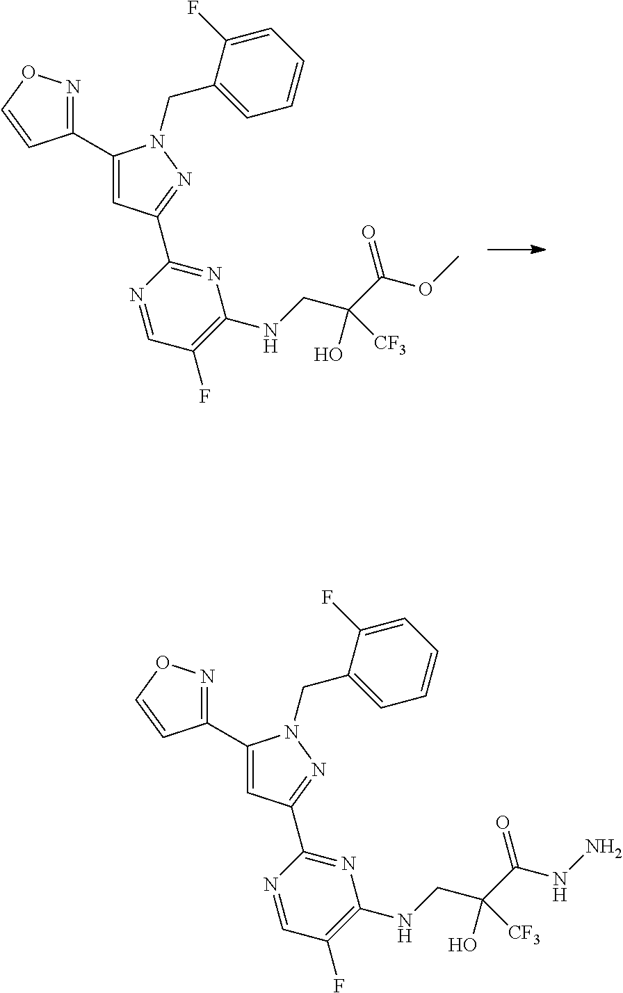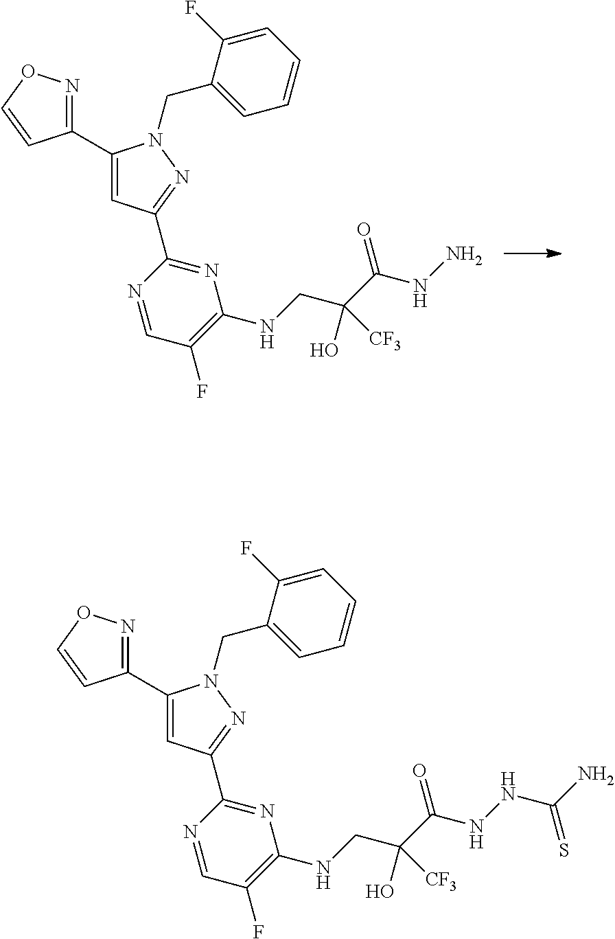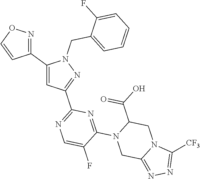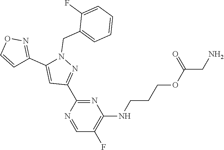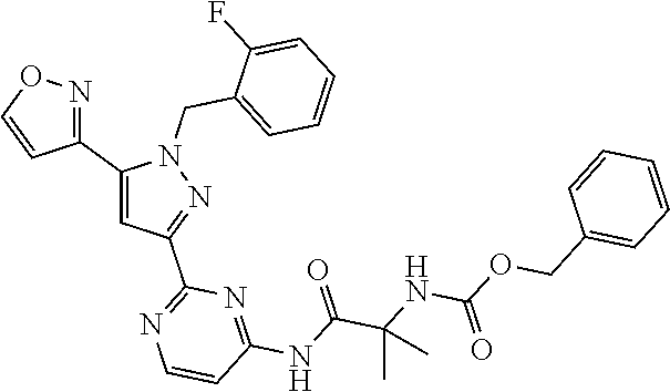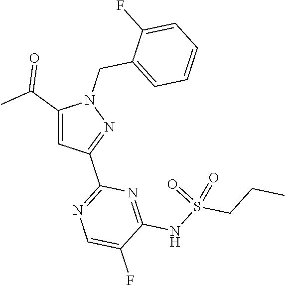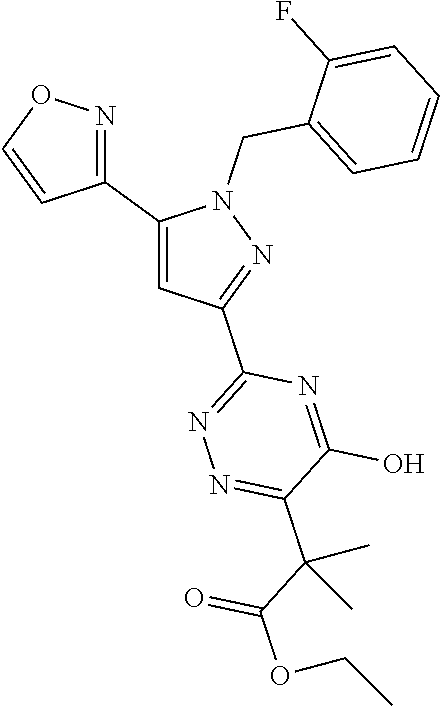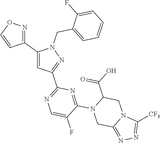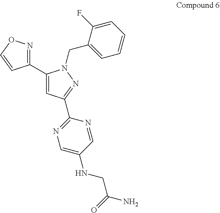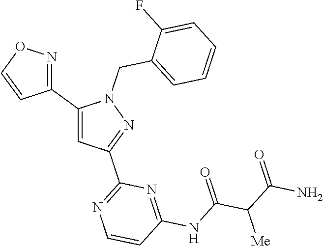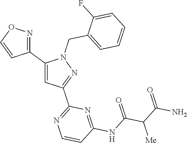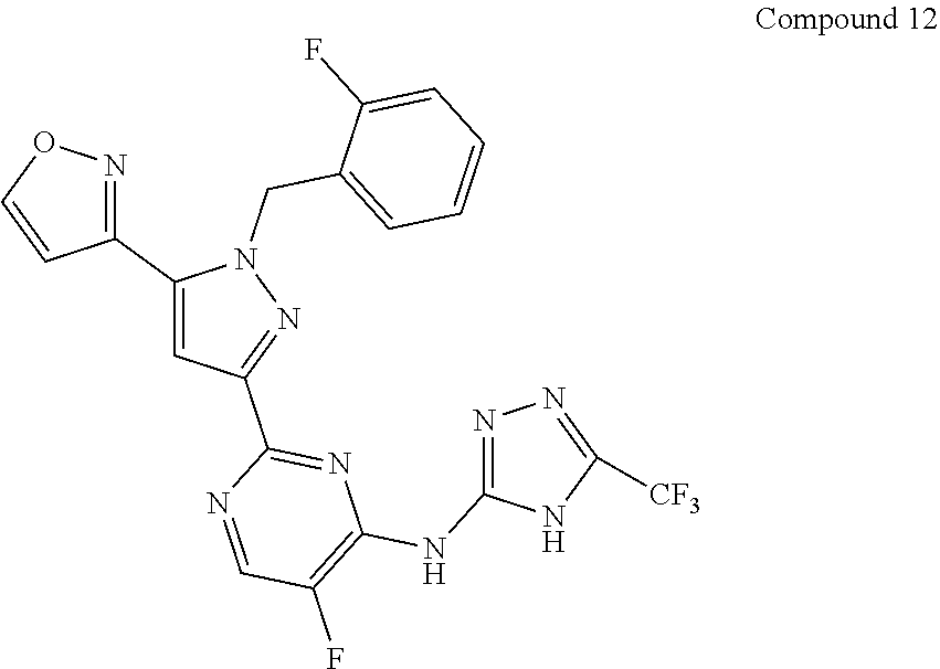were then added to the assay mixture and the resulting mixture incubated at 37° C. for 20 minutes. After the 20 minute incubation, the assay mixture was aspirated and 10% acetic acid containing 150 ng/mL+3-cGMP (internal standard for LCMS) (50 μL) was added to the cells. The plate was incubated at 4° C. for 30 minutes in the acetic acid solution to stop the reaction and lyse the cells. The plates were then centrifuged at 1,000 g for 3 minutes at 4° C. and the supernatant transferred to a clean reaction plate for LCMS analysis. cGMP concentrations were determined from each sample using the LCMS conditions below (Table 2) and calculated standard curve. The standard curve was prepared in 10% acetic acid with 150 ng/mL+3cGMP (isotopically labelled cGMP with a weight 3 units higher than wild type) with the following final concentrations of cGMP in ng/mL: 1, 5, 10, 50, 100, 250, 500, 1000, 2000. Data were normalized to a high control using the following equation: 100*(Sample−Low Control)/(High Control−Low Control), where the low control is the average of 16 samples treated with 1% DMSO, and the high control is the average of 16 samples treated with 30 μM of Compound Y depicted below. Data were fit using a 4-parameter fit (log(agonist) vs. response—variable slope) using GraphPad Prism Software v.5. n=2 for all compounds. The Absolute EC50was interpolated from the curve fit and is defined as the concentration at which a given compound elicits 50% of the high control response. Compounds failing to elicit a minimum response of 50% are reported as >30 μM. For compounds run in duplicate or n higher than 2, the result herein given is the geometric mean of the several results obtained. Table 3 summarizes results obtained for selected compounds of the invention in this assay. Human embryonic kidney cells (HEK293) cells expressing GloSensor™ 40F cGMP (Part No: CS182801, Promega) were used to evaluate the activity of test compounds. The luminescent biosensors (engineered luciferase) that were incorporated into these cells detect cGMP formed by the compounds stimulating the sGC enzyme and emit luminescence. cGMP GloSensor cells were maintained in Dulbecco's Modification of Eagle's Medium (DMEM) supplemented with fetal bovine serum (FBS) (10% final) and hygromycine (200 ug/ml). The day before assay, cells were plated in DMEM with 10% FBS in a 50 μL volume at a density of 1.5×104cells/well in a poly-D-lysine coated 384-well flat white-bottom plate (Corning Cat No 35661). Cells were incubated overnight at 37° C. in a humidified chamber with 5% CO2. The next day, medium was removed and cells were replaced with 40 ul/well of GloSensor™, 2 mM (Promega Cat No E1291). Cells were treated for 90 minutes at 25° C. to allow the substrate to equilibrate in the cells. Test compounds and Diethylenetriamine NONOate (DETA-NONOate) was diluted to 3 mM (20×) in serum-free CO2independent medium and serially diluted at 4× dilutions to create 5× dose curve from which 10 ul was added to the wells (x μM concentration for test compound solution and 10 μM concentration for DETA-NONOate solution; wherein x is one of the following final concentrations).
