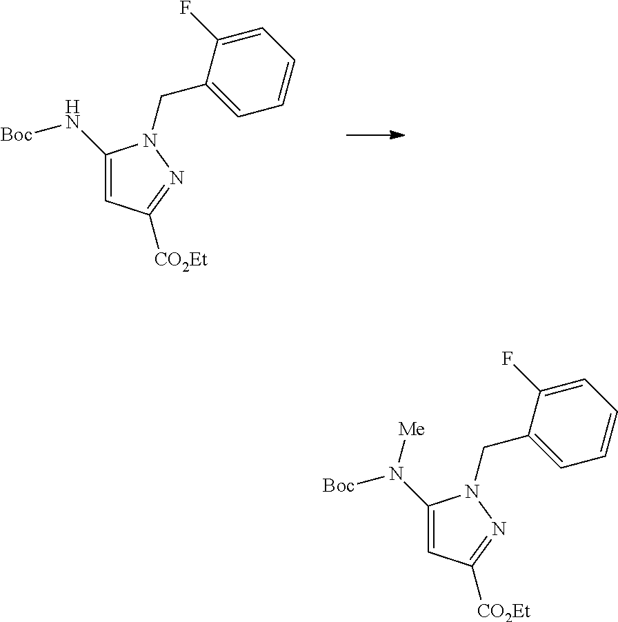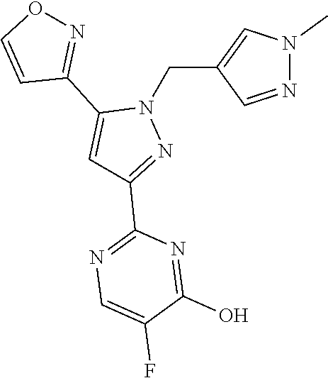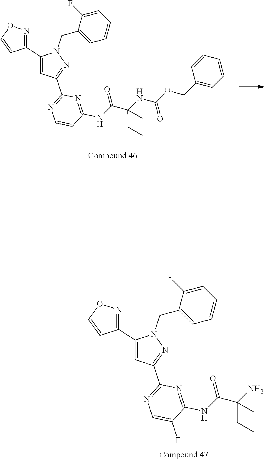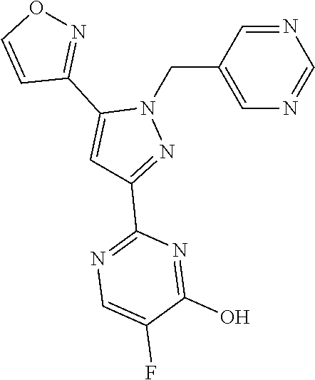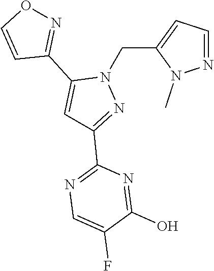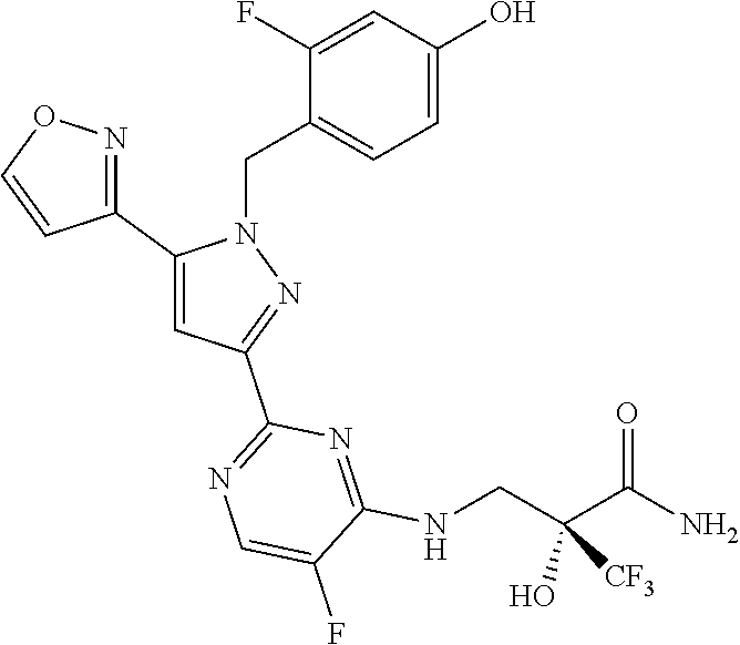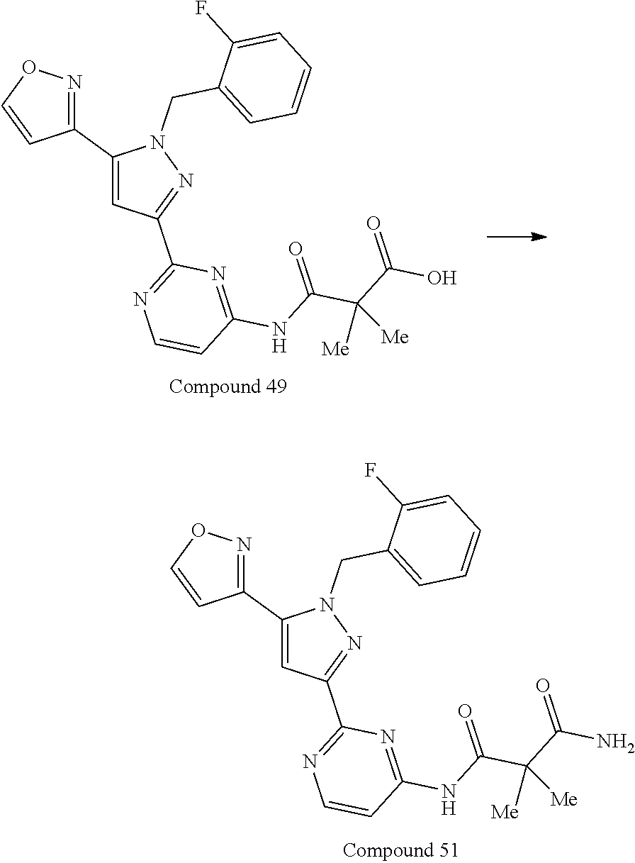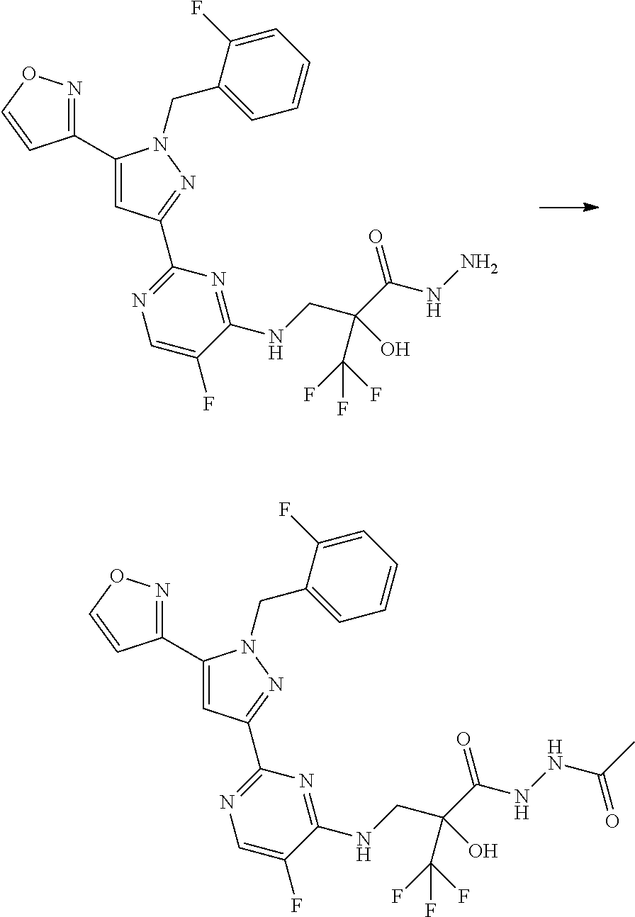were then added to the assay mixture and the resulting mixture incubated at 37° C. for 20 minutes. After the 20 minute incubation, the assay mixture was aspirated and 10% acetic acid containing 150 ng/mL+3-cGMP (internal standard for LCMS) (50 μL) was added to the cells. The plate was incubated at 4° C. for 30 minutes in the acetic acid solution to stop the reaction and lyse the cells. The plates were then centrifuged at 1,000 g for 3 minutes at 4° C. and the supernatant transferred to a clean reaction plate for LCMS analysis. cGMP concentrations were determined from each sample using the LCMS conditions below (Table 2) and calculated standard curve. The standard curve was prepared in 10% acetic acid with 150 ng/mL+3cGMP (isotopically labelled cGMP with a weight 3 units higher than wild type) with the following final concentrations of cGMP in ng/mL: 1, 5, 10, 50, 100, 250, 500, 1000, 2000. Data were normalized to a high control using the following equation: 100*(Sample−Low Control)/(High Control−Low Control), where the low control is the average of 16 samples treated with 1% DMSO, and the high control is the average of 16 samples treated with 30 μM of Compound Y depicted below. Data were fit using a 4-parameter fit (log(agonist) vs. response—variable slope) using GraphPad Prism Software v.5. n=2 for all compounds. The Absolute EC50was interpolated from the curve fit and is defined as the concentration at which a given compound elicits 50% of the high control response. Compounds failing to elicit a minimum response of 50% are reported as >30 μM. For compounds run in duplicate or n higher than 2, the result herein given is the geometric mean of the several results obtained. Table 3 summarizes results obtained for selected compounds of the invention in this assay. Human embryonic kidney cells (HEK293) cells expressing GloSensor™ 40F cGMP (Part No: CS182801, Promega) were used to evaluate the activity of test compounds. The luminescent biosensors (engineered luciferase) that were incorporated into these cells detect cGMP formed by the compounds stimulating the sGC enzyme and emit luminescence. cGMP GloSensor cells were maintained in Dulbecco's Modification of Eagle's Medium (DMEM) supplemented with fetal bovine serum (FBS) (10% final) and hygromycine (200 ug/ml). The day before assay, cells were plated in DMEM with 10% FBS in a 50 μL volume at a density of 1.5×104cells/well in a poly-D-lysine coated 384-well flat white-bottom plate (Corning Cat No 35661). Cells were incubated overnight at 37° C. in a humidified chamber with 5% CO2. The next day, medium was removed and cells were replaced with 40 ul/well of GloSensor™, 2 mM (Promega Cat No E1291). Cells were treated for 90 minutes at 25° C. to allow the substrate to equilibrate in the cells. Test compounds and Diethylenetriamine NONOate (DETA-NONOate) was diluted to 3 mM (20×) in serum-free CO2independent medium and serially diluted at 4× dilutions to create 5× dose curve from which 10 ul was added to the wells (x μM concentration for test compound solution and 10 μM concentration for DETA-NONOate solution; wherein x is one of the following final concentrations).