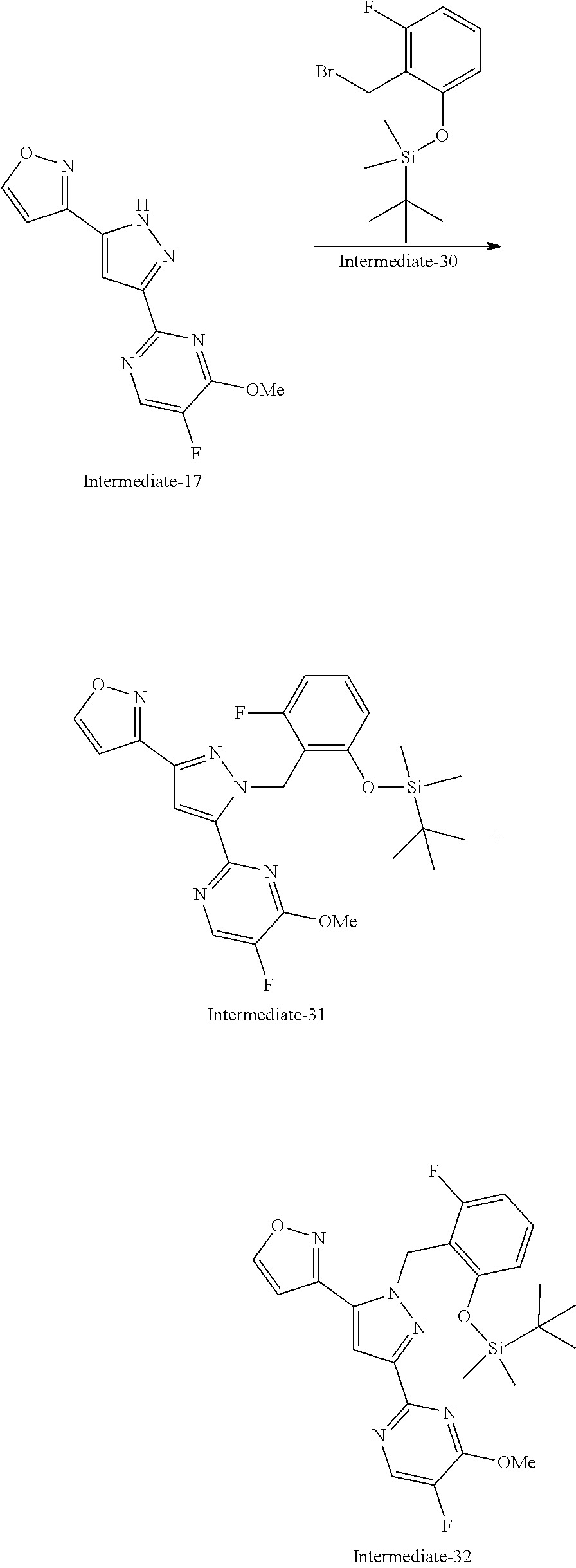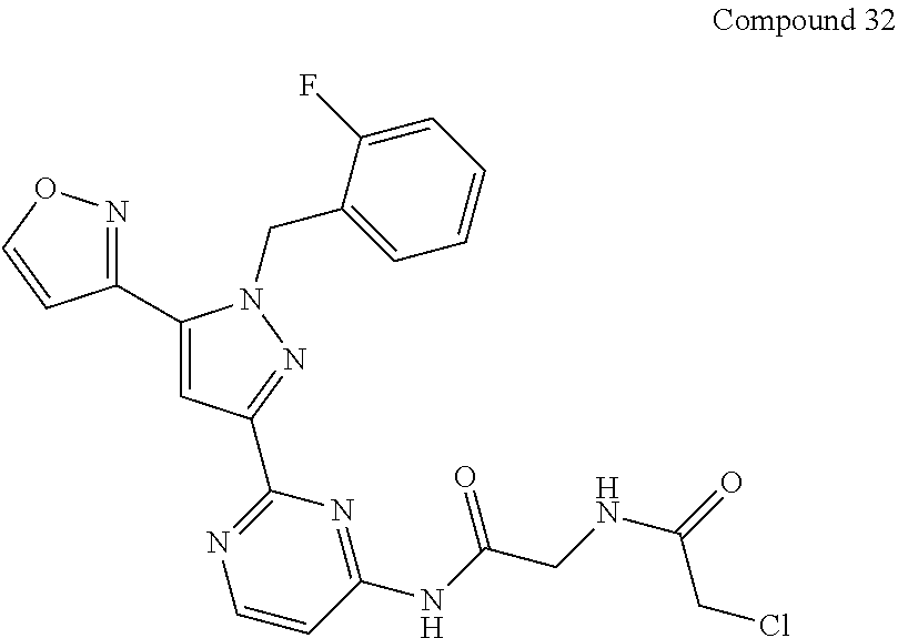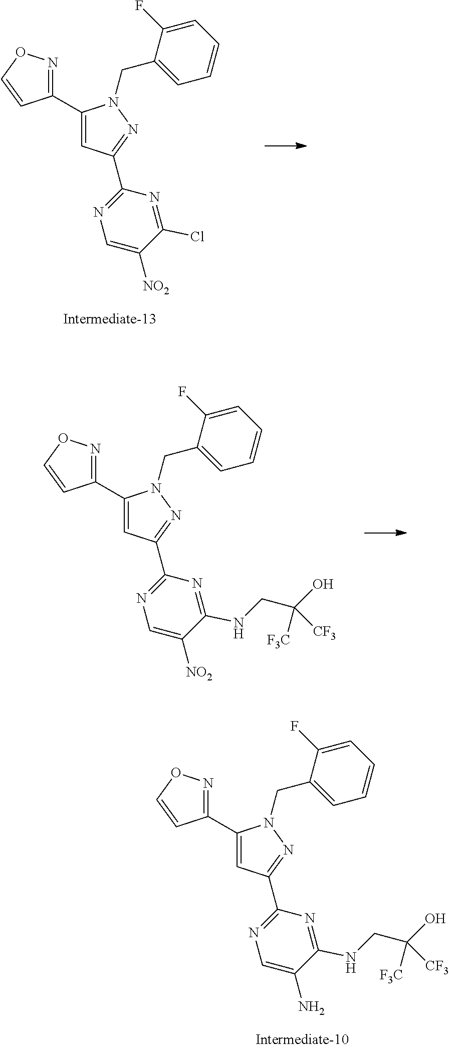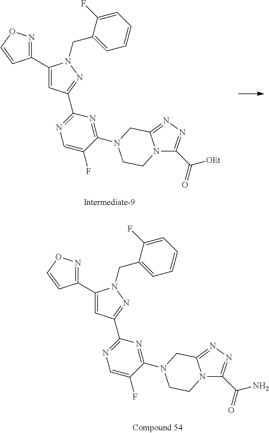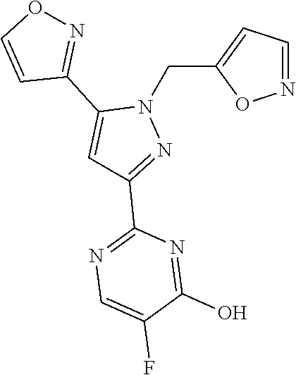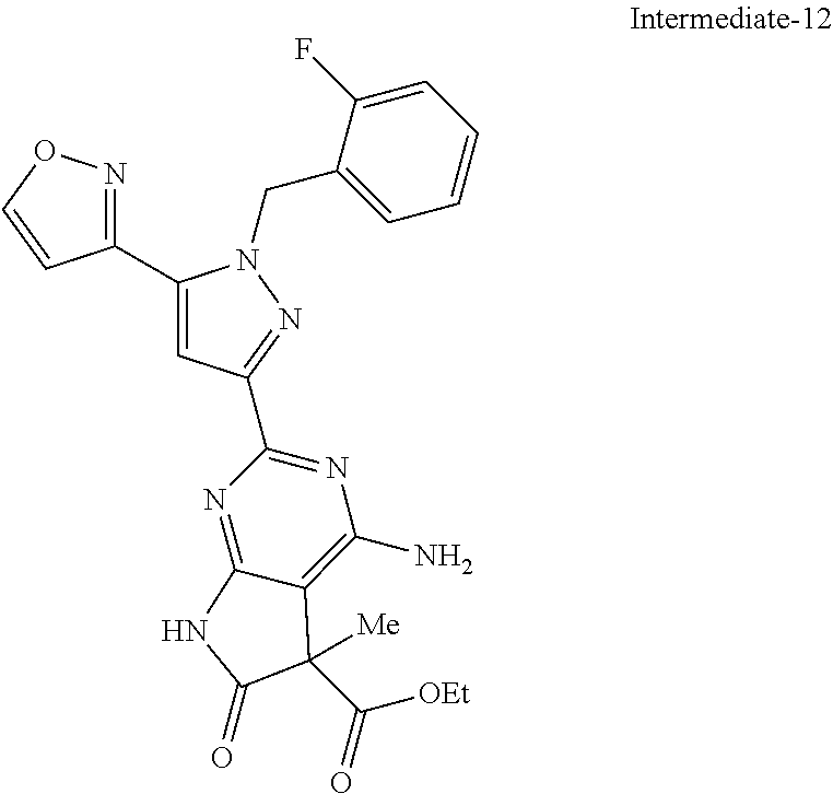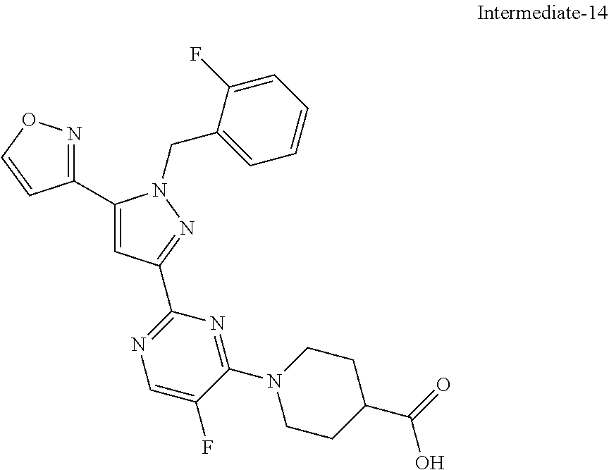 were then added to the assay mixture and the resulting mixture incubated at 37° C. for 20 minutes. After the 20 minute incubation, the assay mixture was aspirated and 10% acetic acid containing 150 ng/mL+3-cGMP (internal standard for LCMS) (50 μL) was added to the cells. The plate was incubated at 4° C. for 30 minutes in the acetic acid solution to stop the reaction and lyse the cells. The plates were then centrifuged at 1,000 g for 3 minutes at 4° C. and the supernatant transferred to a clean reaction plate for LCMS analysis. cGMP concentrations were determined from each sample using the LCMS conditions below (Table 2) and calculated standard curve. The standard curve was prepared in 10% acetic acid with 150 ng/mL+3cGMP (isotopically labelled cGMP with a weight 3 units higher than wild type) with the following final concentrations of cGMP in ng/mL: 1, 5, 10, 50, 100, 250, 500, 1000, 2000. Data were normalized to a high control using the following equation: 100*(Sample−Low Control)/(High Control−Low Control), where the low control is the average of 16 samples treated with 1% DMSO, and the high control is the average of 16 samples treated with 30 μM of Compound Y depicted below. Data were fit using a 4-parameter fit (log(agonist) vs. response—variable slope) using GraphPad Prism Software v.5. n=2 for all compounds. The Absolute EC50was interpolated from the curve fit and is defined as the concentration at which a given compound elicits 50% of the high control response. Compounds failing to elicit a minimum response of 50% are reported as >30 μM. For compounds run in duplicate or n higher than 2, the result herein given is the geometric mean of the several results obtained. Table 3 summarizes results obtained for selected compounds of the invention in this assay. Human embryonic kidney cells (HEK293) cells expressing GloSensor™ 40F cGMP (Part No: CS182801, Promega) were used to evaluate the activity of test compounds. The luminescent biosensors (engineered luciferase) that were incorporated into these cells detect cGMP formed by the compounds stimulating the sGC enzyme and emit luminescence. cGMP GloSensor cells were maintained in Dulbecco's Modification of Eagle's Medium (DMEM) supplemented with fetal bovine serum (FBS) (10% final) and hygromycine (200 ug/ml). The day before assay, cells were plated in DMEM with 10% FBS in a 50 μL volume at a density of 1.5×104cells/well in a poly-D-lysine coated 384-well flat white-bottom plate (Corning Cat No 35661). Cells were incubated overnight at 37° C. in a humidified chamber with 5% CO2. The next day, medium was removed and cells were replaced with 40 ul/well of GloSensor™, 2 mM (Promega Cat No E1291). Cells were treated for 90 minutes at 25° C. to allow the substrate to equilibrate in the cells. Test compounds and Diethylenetriamine NONOate (DETA-NONOate) was diluted to 3 mM (20×) in serum-free CO2independent medium and serially diluted at 4× dilutions to create 5× dose curve from which 10 ul was added to the wells (x μM concentration for test compound solution and 10 μM concentration for DETA-NONOate solution; wherein x is one of the following final concentrations).
