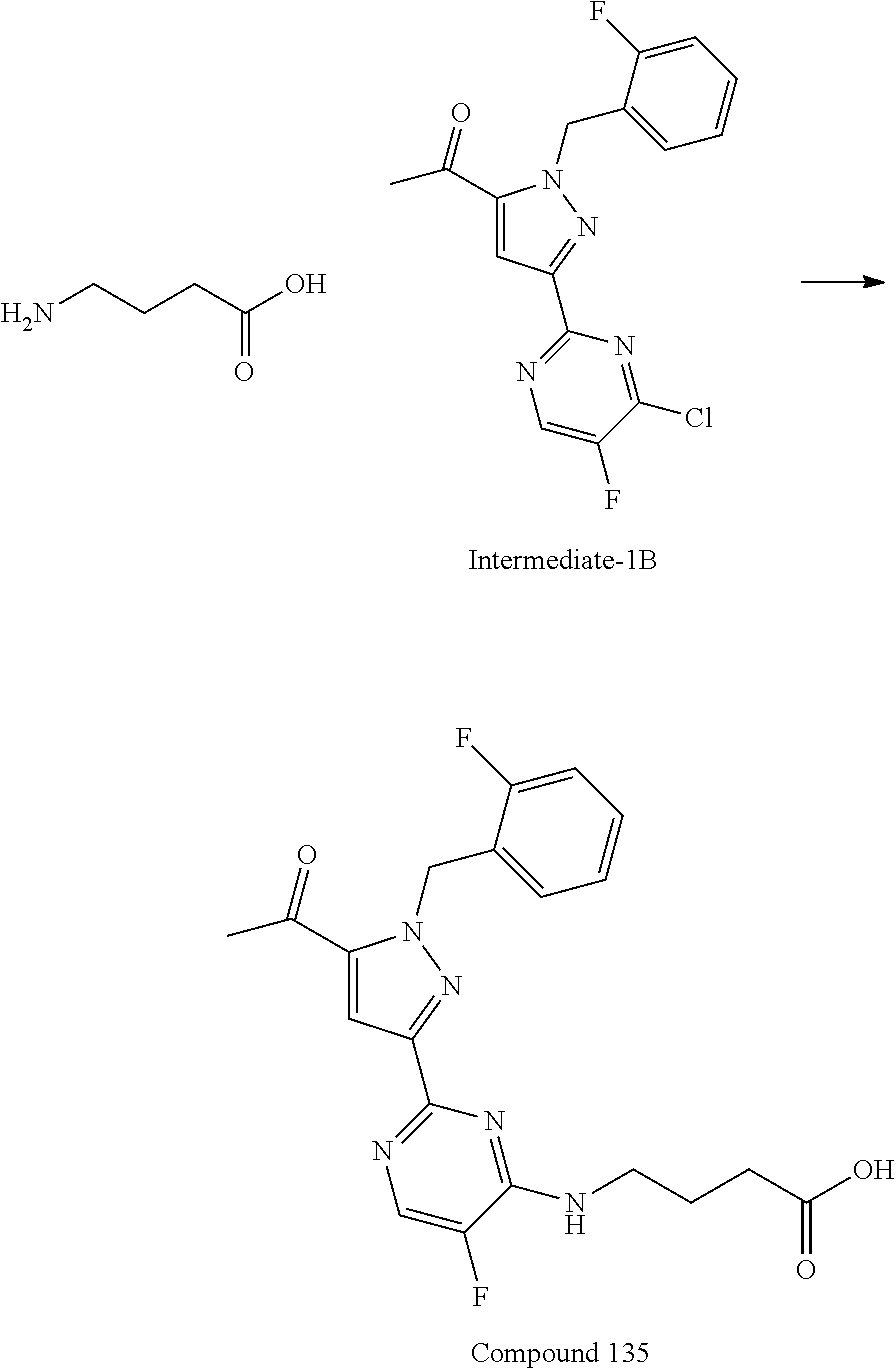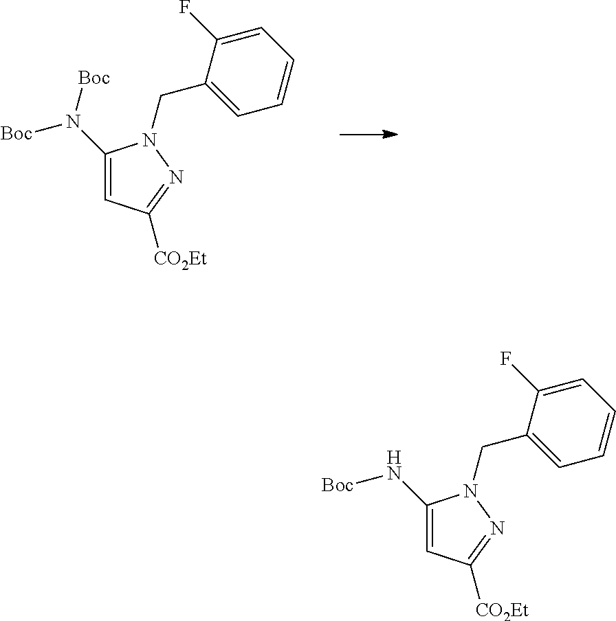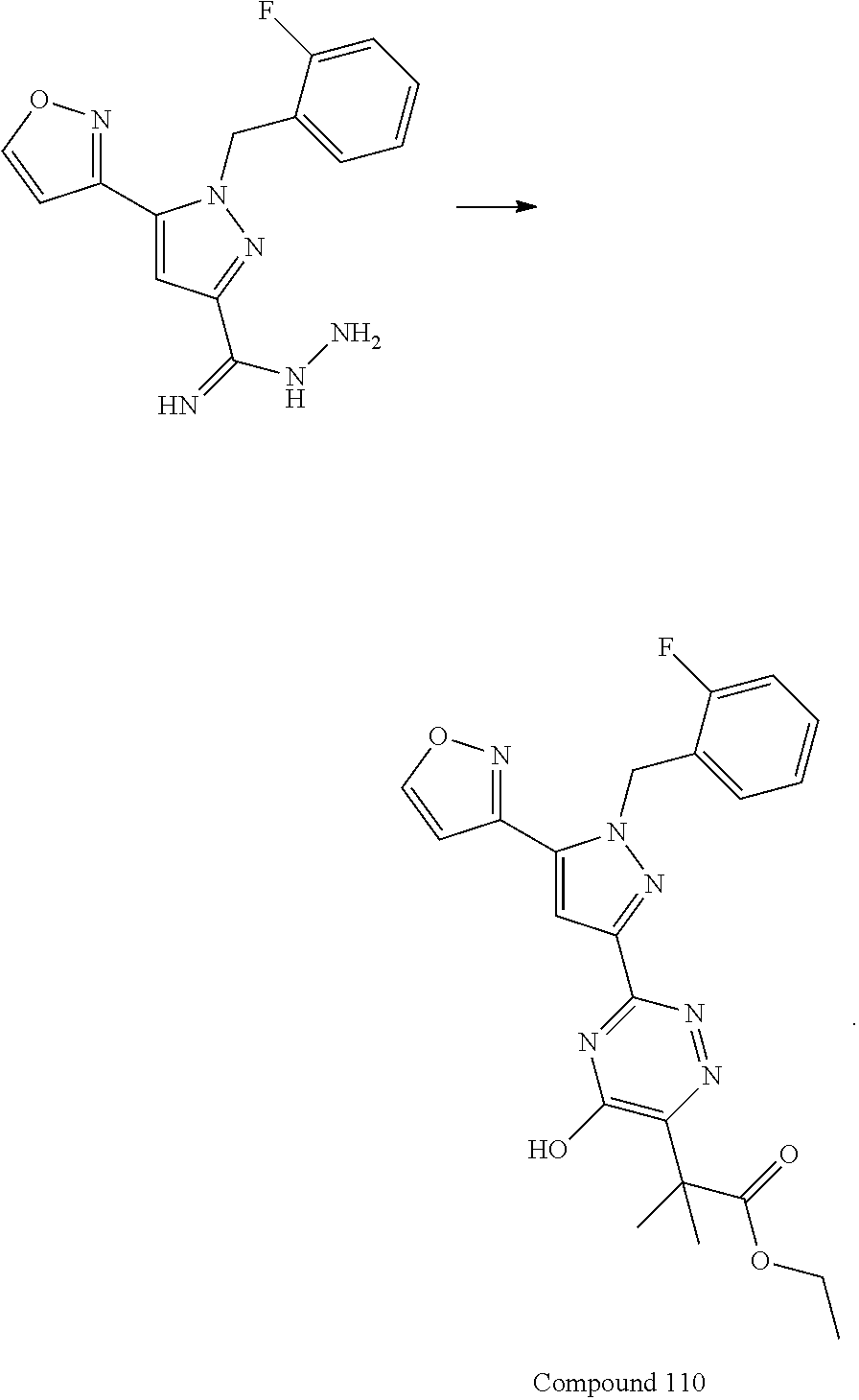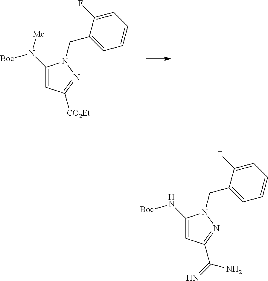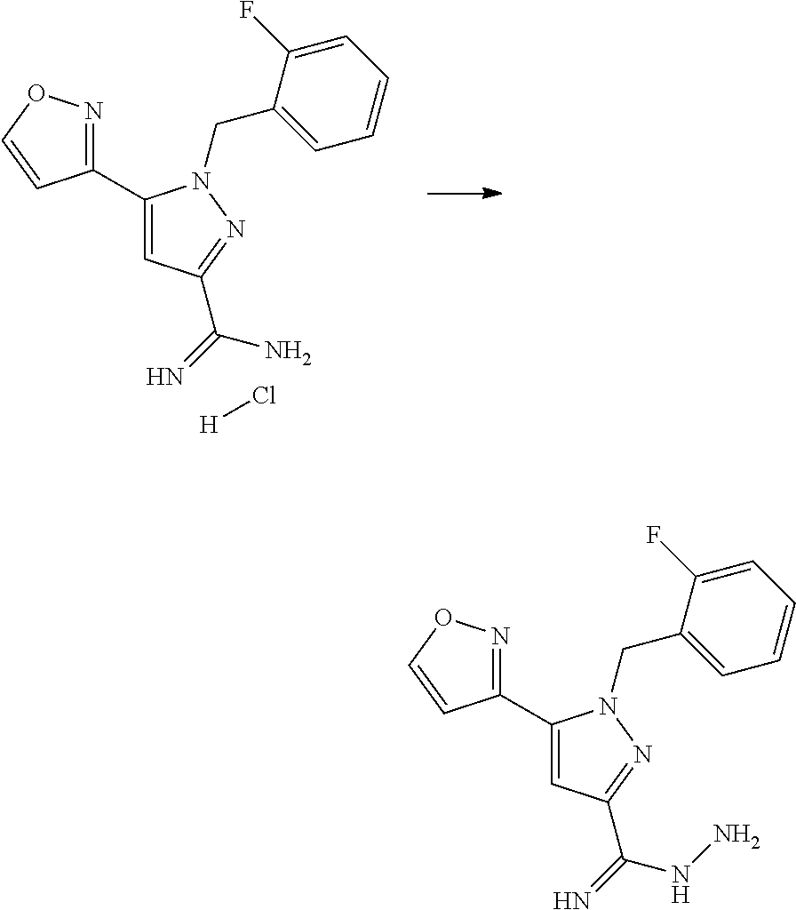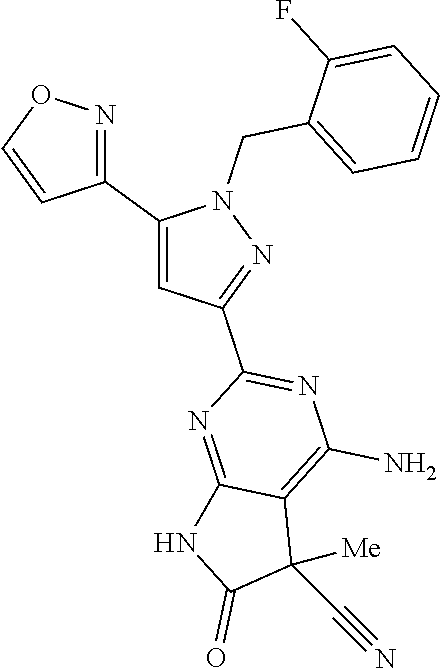 109 10 B @Code definitions for Rat Mean Arterial Pressure peak change from baseline at 10 mpk: A = −10 < peak change from baseline at 3 or 10 mpk < 0 B = −20 ≤ peak change from baseline at 3 or 10 mpk ≤ −10 C = peak change from baseline at 3 or 10 mpk < −20 Example 5: Purified Human Recombinant sGC α1β1 Enzyme Assay Performed in the Presence of Diethylenetriamine NONOate (DETA-NONOate), a Nitric Oxide Donor