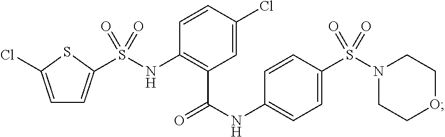 HMR-1766 (ataciguat sodium, see patent publication WO2000002851) (2-(4-chloro-phenylsulfonylamino)-4,5-dimethoxy-N-(4-(thiomorpholine-4-sulfonyl)-phenyl)-benzamide (see patent publications DE19830430 and WO2000002851) (7) Heme-dependent sGC stimulators including, but not limited to: