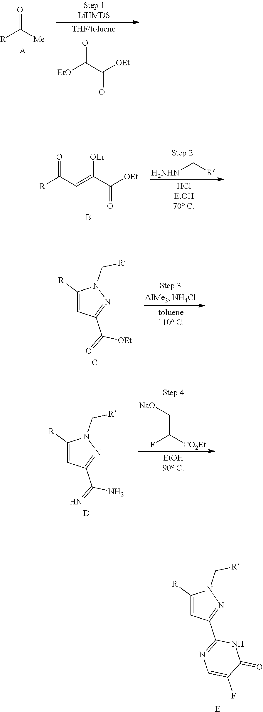 The compounds and pharmaceutical formulations described herein may be contained in a kit. The kit may include single or multiple doses of two or more agents, each packaged or formulated individually, or single or multiple doses of two or more agents packaged or formulated in combination. Thus, one or more agents can be present in first container, and the kit can optionally include one or more agents in a second container. The container or containers are placed within a package, and the package can optionally include administration or dosage instructions. A kit can include additional components such as syringes or other means for administering the agents as well as diluents or other means for formulation. Thus, the kits can comprise: a) a pharmaceutical composition comprising a compound described herein and a pharmaceutically acceptable carrier, vehicle or diluent; and b) a container or packaging. The kits may optionally comprise instructions describing a method of using the pharmaceutical compositions in one or more of the methods described herein (e.g. preventing or treating one or more of the diseases and disorders described herein). The kit may optionally comprise a second pharmaceutical composition comprising one or more additional agents described herein for co therapy use, a pharmaceutically acceptable carrier, vehicle or diluent. The pharmaceutical composition comprising the compound described herein and the second pharmaceutical composition contained in the kit may be optionally combined in the same pharmaceutical composition. A kit includes a container or packaging for containing the pharmaceutical compositions and may also include divided containers such as a divided bottle or a divided foil packet. The container can be, for example a paper or cardboard box, a glass or plastic bottle or jar, a re-sealable bag (for example, to hold a “refill” of tablets for placement into a different container), or a blister pack with individual doses for pressing out of the pack according to a therapeutic schedule. It is feasible that more than one container can be used together in a single package to market a single dosage form. For example, tablets may be contained in a bottle which is in turn contained within a box. An example of a kit is a so-called blister pack. Blister packs are well known in the packaging industry and are being widely used for the packaging of pharmaceutical unit dosage forms (tablets, capsules, and the like). Blister packs generally consist of a sheet of relatively stiff material covered with a foil of a preferably transparent plastic material. During the packaging process, recesses are formed in the plastic foil. The recesses have the size and shape of individual tablets or capsules to be packed or may have the size and shape to accommodate multiple tablets and/or capsules to be packed. Next, the tablets or capsules are placed in the recesses accordingly and the sheet of relatively stiff material is sealed against the plastic foil at the face of the foil which is opposite from the direction in which the recesses were formed. As a result, the tablets or capsules are individually sealed or collectively sealed, as desired, in the recesses between the plastic foil and the sheet. Preferably the strength of the sheet is such that the tablets or capsules can be removed from the blister pack by manually applying pressure on the recesses whereby an opening is formed in the sheet at the place of the recess. The tablet or capsule can then be removed via said opening. It may be desirable to provide written memory aid containing information and/or instructions for the physician, pharmacist or subject regarding when the medication is to be taken. A “daily dose” can be a single tablet or capsule or several tablets or capsules to be taken on a given day. When the kit contains separate compositions, a daily dose of one or more compositions of the kit can consist of one tablet or capsule while a daily dose of another or more compositions of the kit can consist of several tablets or capsules. A kit can take the form of a dispenser designed to dispense the daily doses one at a time in the order of their intended use. The dispenser can be equipped with a memory-aid, so as to further facilitate compliance with the regimen. An example of such a memory-aid is a mechanical counter which indicates the number of daily doses that have been dispensed. Another example of such a memory-aid is a battery-powered micro-chip memory coupled with a liquid crystal readout, or audible reminder signal which, for example, reads out the date that the last daily dose has been taken and/or reminds one when the next dose is to be taken. All references provided in the Examples are herein incorporated by reference. As used herein, all abbreviations, symbols and conventions are consistent with those used in the contemporary scientific literature. See, e.g. Janet S. Dodd, ed., The ACS Style Guide: A Manual for Authors and Editors, 2ndEd., Washington, D.C.: American Chemical Society, 1997, herein incorporated in its entirety by reference. To a solution of ketone A in THF cooled to −78° C., LiHMDS (e.g., 0.9 equiv, 1.0 M in toluene) was added dropwise via syringe. The reaction was allowed to warm to 0° C., then charged with diethyl oxalate (1.2 equiv). At this time, the reaction was warmed to room temperature and stirred at that temperature until judged complete (e.g., using either TLC or LC/MS analysis). Once the reaction was complete (reaction time was typically 45 minutes), the product dione enolate B was used “as-is” in Step 2, i.e., the cyclization step, without any further purification. Dione enolate B was diluted with ethanol and consecutively charged with HCl (e.g., 3 equiv, 1.25 M solution in ethanol) and arylhydrazine hydrate (e.g., 1.15 equiv). The reaction mixture was heated to 70° C. and stirred at this temperature until cyclization was deemed complete (e.g., by LC/MS analysis, typically 3