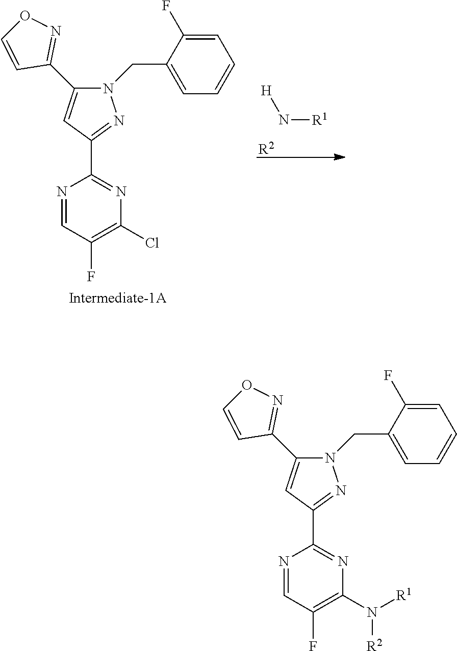 In another embodiment, specific diseases of disorders which may be treated and/or prevented by administering an sGC stimulator of Table IA or Table IB that are stimulators of sGC, and their pharmaceutically acceptable salts thereof, include but are not limited to: certain types of cancers; Sickle Cell Disease; Sickle Cell Anemia; cancer metastasis; osteoporosis; gastroparesis; functional dyspepsia; diabetic complications; alopecia or hair loss; diseases associated with endothelial dysfunction; neurologic disorders associated with decreased nitric oxide production; arginosuccinic aciduria; neuromuscular diseases: Duchenne muscular dystrophy (DMD), Becker muscular dystrophy (BMD), limb girdle muscular dystrophies, distal myopathies, type I and type II myotonic dystrophies, facio-scapulo-peroneal muscular dystrophy, autosomal and X-linked Emery-Dreifuss muscular dystrophy, oculopharyngeal muscular dystrophy, amyotrophic lateral sclerosis and spinal muscle atrophy (SMA). In some embodiments, the invention relates to a method of treating a disease, health condition or disorder in a subject, comprising administering a therapeutically effective amount of a compound of Table IA or Table IB, or a pharmaceutically acceptable salt thereof, to the subject in need of treatment, wherein the disease, health condition or disorder is selected from one of the diseases listed above. In another embodiment, compounds of the invention can be delivered in the form of implanted devices, such as stents. A stent is a mesh ‘tube’ inserted into a natural passage/conduit in the body to prevent or counteract a disease-induced, localized flow constriction. The term may also refer to a tube used to temporarily hold such a natural conduit open to allow access for surgery. A drug-eluting stent (DES) is a peripheral or coronary stent (a scaffold) placed into narrowed, diseased peripheral or coronary arteries that slowly releases a drug to block cell proliferation, usually smooth muscle cell proliferation. This prevents fibrosis that, together with clots (thrombus), could otherwise block the stented artery, a process called restenosis. The stent is usually placed within the peripheral or coronary artery by an Interventional Cardiologist or Interventional Radiologist during an angioplasty procedure. Drugs commonly used in DES in order to block cell proliferation include paclitaxel or rapamycin analogues. In some embodiments of the invention, a sGC stimulator of the invention can be delivered by means of a drug-eluting stent coated with said sGC stimulator. A drug-eluting stent coated with a sGC stimulator of the invention may be useful in the prevention of stent restenosis and thrombosis during percutaneous coronary interventions. A drug-eluting stent coated with a sGC stimulator of the invention may be able to prevent smooth cell proliferation as well as to assist re-vascularization and re-generation of the endothelial tissue of the artery in which the stent is inserted. An alternative to percutaneous coronary intervention for the treatment of intractable angina due to coronary artery occlusive disease is the procedure named Coronary Artery Bypass Grafting (CABG). CABG provides only palliation of an ongoing process that is further complicated by the rapid development of graft atherosclerosis. The saphenous vein graft is the most commonly used conduit in CABG surgery. The long-term clinical success of venous CABG is hampered for three main reasons: accelerated graft atherosclerosis, incomplete endothelialization and thrombosis. In some embodiments, a sGC stimulator of the invention can be used for the prevention of saphenous graft failure during CABG. Compounds of the invention may assist the process of endothelialization and help prevent thrombosis. In this indication, the sGC stimulator is delivered locally in the form of a gel. The terms, “disease”, “disorder” and “condition” may be used interchangeably here to refer to an sGC, cGMP and/or NO mediated medical or pathological condition. As used herein, the terms “subject” and “patient” are used interchangeably. The terms “subject” and “patient” refer to an animal (e.g., a bird such as a chicken, quail or turkey, or a mammal), specifically a “mammal” including a non-primate (e.g., a cow, pig, horse, sheep, rabbit, guinea pig, rat, cat, dog, and mouse) and a primate (e.g., a monkey, chimpanzee and a human), and more specifically a human. In some embodiments, the subject is a non-human animal such as a farm animal (e.g., a horse, cow, pig or sheep), or a pet (e.g., a dog, cat, guinea pig or rabbit). In some embodiments, the subject is a human. The invention also provides a method for treating one of the above diseases, conditions and disorders in a subject, comprising administering a therapeutically effective amount of a compound of Table IA or Table IB, or a pharmaceutically acceptable salt thereof, to the subject in need of the treatment. Alternatively, the invention provides the use of a compound of Table IA or Table IB, or a pharmaceutically acceptable salt thereof, in the treatment of one of these diseases, conditions and disorders in a subject in need of the treatment. The invention further provides a method of making or manufacturing a medicament useful for treating one of these diseases, conditions and disorders comprising using a compound of Table IA or Table IB, or a pharmaceutically acceptable salt thereof. The term “biological sample”, as used herein, refers to an in vitro or ex vivo sample, and includes, without limitation, cell cultures or extracts thereof; biopsied material obtained from a mammal or extracts thereof; blood, saliva, urine, faeces, semen, tears, lymphatic fluid, ocular fluid, vitreous humour, or other body fluids or extracts thereof. “Treat”, “treating” or “treatment” with regard to a disorder or disease refers to alleviating or abrogating the cause and/or the effects of the disorder or disease