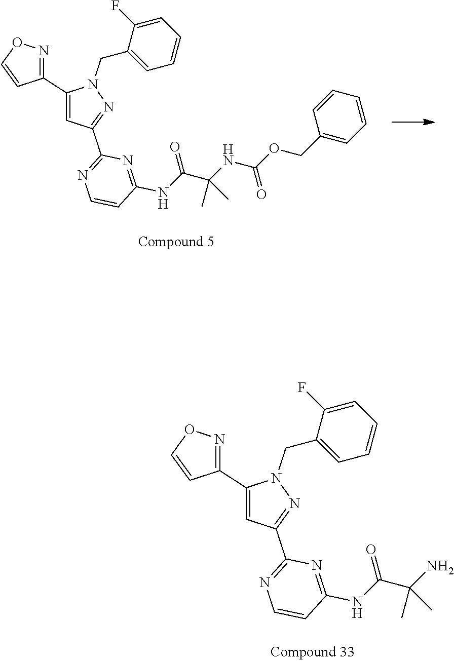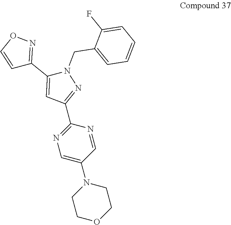 Enzyme data sGC_Enz_HTRF_a1b1 sGC_Enz_HTRF_a1b1 compound EC50/IC50 Abs compound EC50/IC50 Abs number (Norm) (nM) Binned number (Norm) (nM) Binned 3 C 39 C 4 C 44 B 11 C 45 C 17 C 50 C 27 C 56 C 32 B 62 C 37 C 78 C 38 C 83 C 86 C 108 B EC50Abs < 100 nM = A ≤100 nM < EC50Abs < 1000 nM = B ≤1000 nM = C Example 6: Animal Models Descriptions