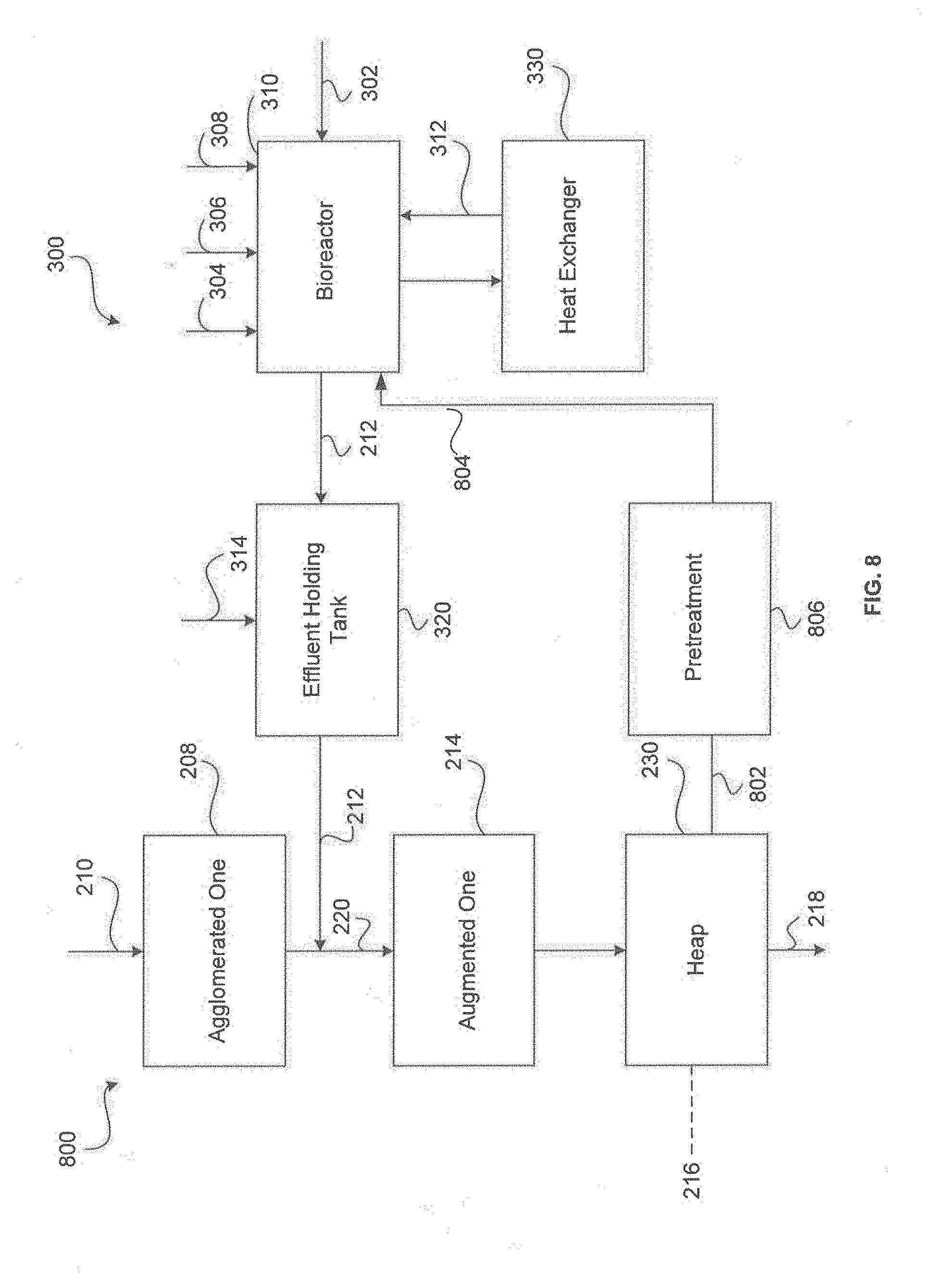 These bacteria and archaea are generally available, for example, from American Type Culture Collection, or like culture collections, or are known in the art. Alternatively, such bacteria and archaea may be obtained from a naturally occurring source and then cultured, or otherwise grown in any conventional, now known, or hereafter devised method. For example, in certain applications, naturally occurring biological strains may be used. In accordance with various embodiments, mixed bacterial strains occurring naturally in raffinate streams may be initially added to an aqueous solution and allowed to undergo a natural selection process. Such selection process may involve, among other things, the reaction environment. It has been found that such naturally occurring microorganisms may be particularly useful in connection with applications of the present invention in connection with mining activities. However, microorganisms such as the above mentioned bacterial and archeal strains may be selected by any technique now know or developed in the future. In accordance with an exemplary embodiment of the invention, at least one bacterial and/or archeal strain may be selected from the list provided above. These microorganisms may be classified in terms of their temperature tolerances and optimized growth and activity ranges as follows: mesophiles, moderate thermophiles, and extreme thermophiles. Mesophilic bacteria generally thrive under moderate operating temperatures, for example, less about than 40° C.; moderate thermophiles are generally optimized for higher temperature conditions, for example, about 37° C. to about 60° C.; and, extreme thermophiles of the archaea class, generally thrive at higher temperatures, for example greater than about 55° C. Group A and B bacteria are generally considered mesophilic and are grow under conditions at or below about 40° C.; Group C bacteria are representative of the moderate thermophilic type and are preferably operated under conditions at or below about 60° C.; and, Group D archaea are representative of the extreme thermophile group and grow under conditions from about 60° C. to about 80° C. Various mixtures of microorganisms from various groups can also be obtained. For example, various mixtures of mesophilic bacteria and moderately thermophilic bacteria may be mixed together to provide active bacteria variations in temperature of heap 230 during leaching. For example, if the temperature of the heap 230 varies between 35° C. and 45° C., such a mixture of bacteria would allow for leaching of a metal within the range of the temperature variation. In accordance with an aspect of the present invention, a mixture of bacteria can be utilized under varying operating conditions of heap 230. For example, mixtures of bacteria in groups A and B may be used. For example, if conditions of heap 230 include high ferric-ferrous iron ratios, bacteria group B may be better suited for leaching under such conditions. If ferric-ferrous iron rations are low, bacteria group A may be more efficient in leaching a metal value from heap 230. Furthermore, if the pH of heap 230 fluctuates, a combination of bacteria in groups A and B may be effective in leaching. Since sulfide oxidation optimally takes place at a pH of less than about 2.5 and may be more efficient in a range from about 1.2 to about 2.0, only bacteria that can survive in such harsh environments may be utilized for leaching metal value from heap 230. For example, when the pH moves closer to 2, bacteria in group B may be more efficient, as opposed to when the pH moves closer to 1.2, the bacteria of group A may be more efficient. Those skilled in the art will appreciate that any combination of bacteria listed herein as well as any bacteria known in the art or hereafter to follow, may be used individually or in combination for the most effective leaching based on static or varying conditions of heap 230. As used herein, a bacterial colony may refer to a group of bacteria and/or archaea and may contain one or more strains of bacteria and/or archaea. In accordance with an aspect of the present invention, Acidithiobacillus caldus bacteria can be utilized under operating conditions at or about 40° C. For example, a suitable biological environment has been prepared by collecting and culturing mine water containing such bacteria in a conventional manner using methods now known or hereafter developed. In accordance with various embodiments of the present invention, a biomass concentration on the order of from about 1×105to about 1×109cells per milliliter of bacteria is preferred but, as will be appreciated by those skilled in the art, other biomass concentrations may be utilized depending on the individual conditions of a process and/or the configuration of a system. Biomass concentration of individual species of bacteria, archaea , and eukarya may be on the order of from about 1×102to about 1×109cells per milliliter. However, any micro-organism selection and growth processes now known or developed in the future may be used in accordance with the present invention. Moreover, the listings of bacteria and temperature-based classifications set forth herein are provided for illustration only, and are not in any way limiting of the bacteria that may be used in accordance with the present invention. Any biological mediated method that utilizes at least one microbial agents, microorganisms, bacteria, archaea, combinations thereof and the like, which are capable of at least partially oxidizing iron and/or reducing sulfur bearing materials, may be used in accordance with the methods herein described. Growth of micro-organisms may be improved by providing feed sources such as pyrite, sulfur, ferrous, and ore concentrate. As will be discussed in further detail herein, it is desirable to establish a substantially self-sustaining bacteria population to facilitate bio-augmentation 220. The sustainability of such a population may b