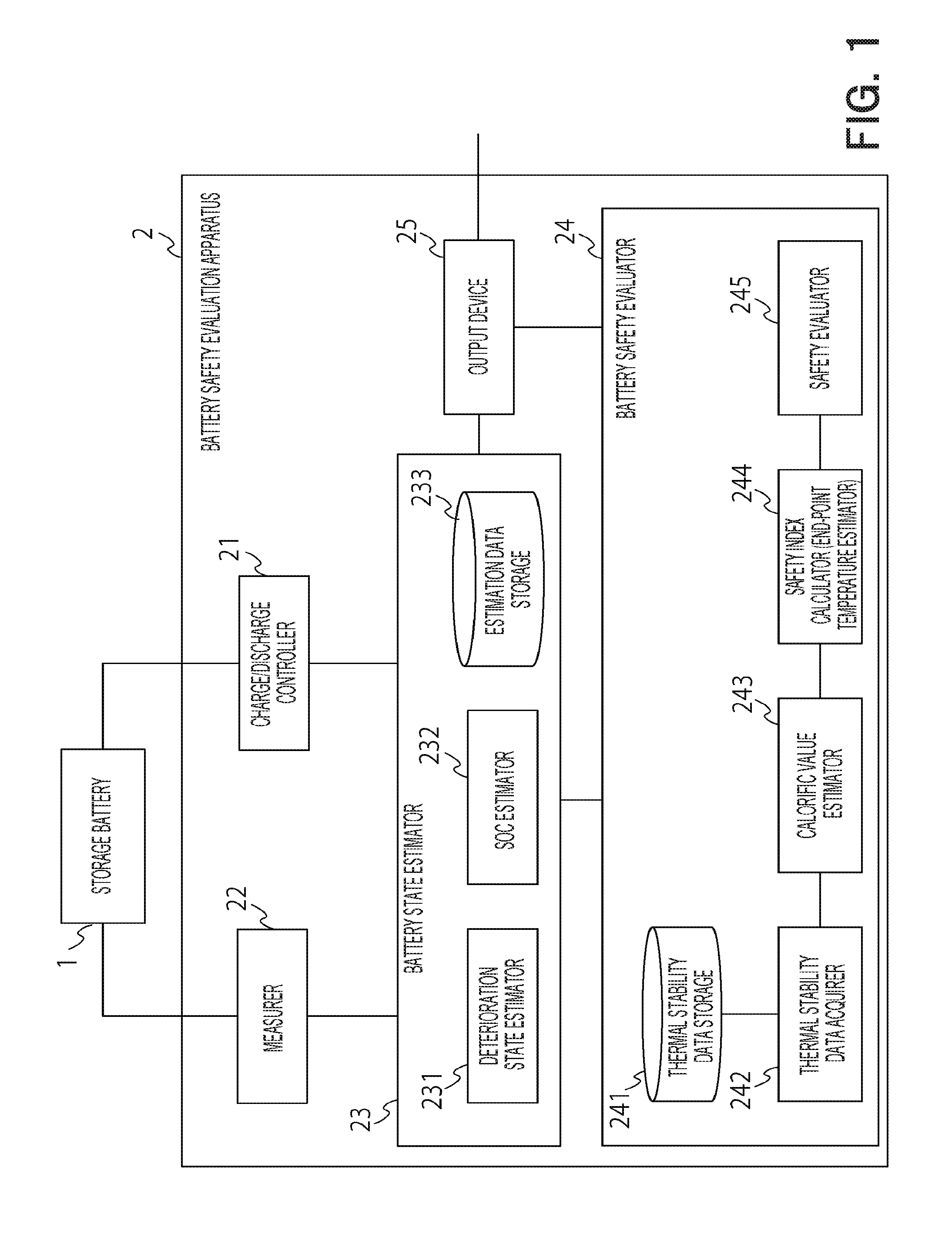 a battery state estimator configured to estimate an estimation value of a present deterioration state of a first battery and an estimation value of a present SOC of the first battery on the basis of data of voltage and current of the first battery measured in charging or discharging the first battery; a calorific value estimator configured to estimate, on the basis of first reference data, a calorific value of the first battery in an occasion when an external temperature changes; and a safety index calculator configured to calculate, on the basis of the calorific value of the first battery, a safety index regarding a temperature of the first battery in the occasion when the external temperature changes, wherein the first reference data is selected as corresponding to the first battery from a plurality of reference data at least indicating relationship between a calorific value of a secondary battery and an external temperature, on the basis of the estimation value of the present deterioration state of the first battery and the estimation value of the present SOC of the first battery. 17. A power storage system comprising: